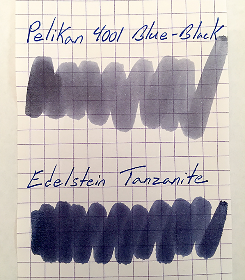 Insomma chi spera di ottenere qualcosa bello saturo come il Pelikan Eldstein Tanzanite mescolando gli economici inchiostri 4001, (peraltro validissimi, a mio avviso, se presi così come sono), resta deluso (allego immagine del confronto tra 4001 blue black e l'Eldstein Tanzanite che ho trovato in rete così da far comprendere la differenza in saturazione tra i due inchiostri. Se si pensa che, a mio avviso, il miscuglio tra blrilliant black 4001 e il royal blue è. a mio avviso, ancora più grigio del 4001 blue black....).