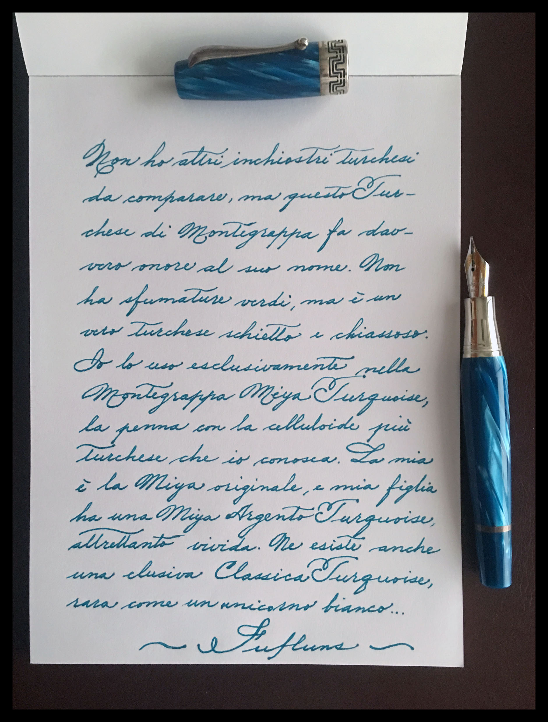 Spero che le tue prove di turchesi ti abbiano soddisfatto. Siccome non lo ho visto citato, ho pensato di aggiungere alla lista anche il Turchese di Montegrappa, del quale ti includo un esempio: