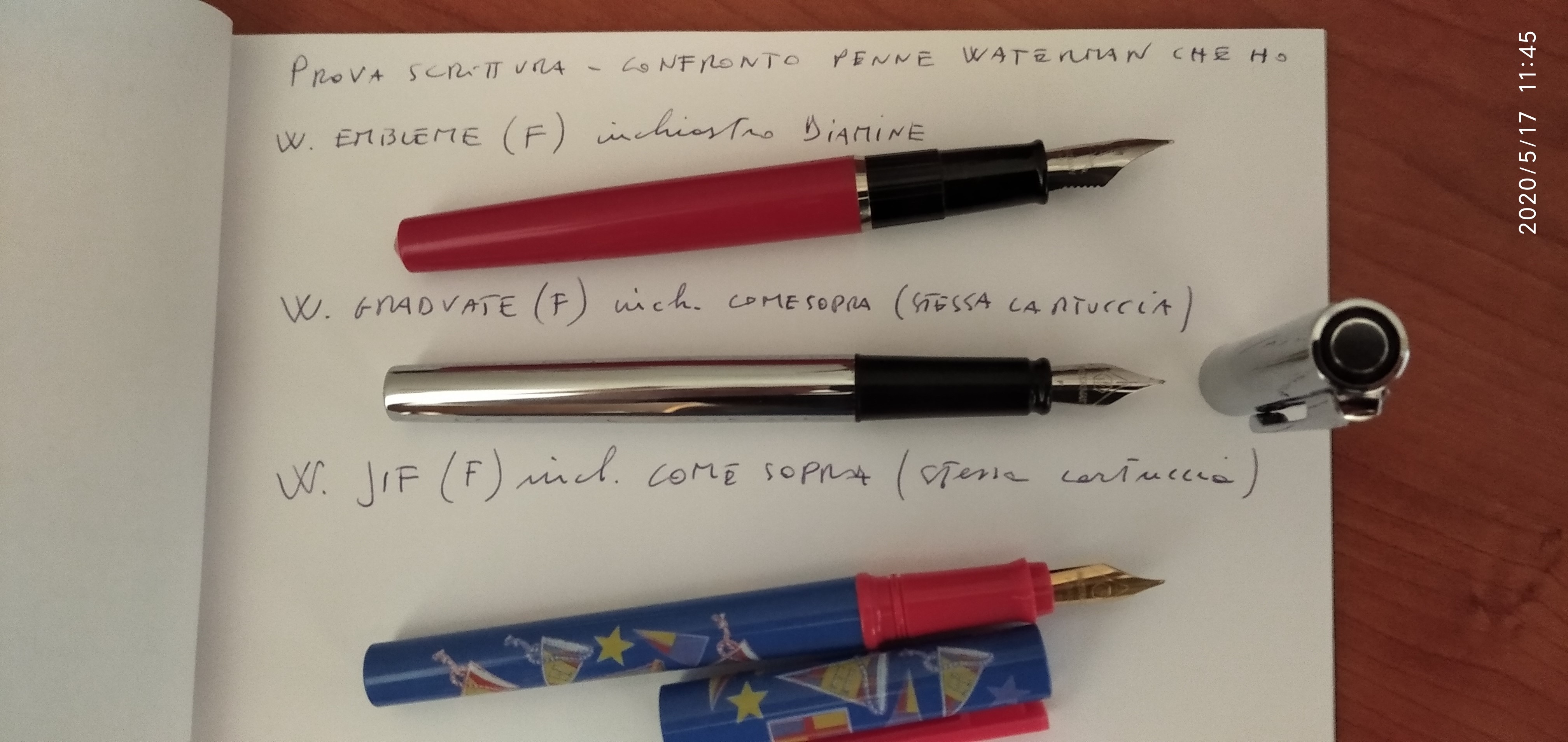 Purtroppo dalle foto non si evince granché (colpa anche del mio telefunken), ma fidatevi che la Embleme non restituisce piacevolezza nell'uso. Il flusso è decisamente meno intenso, e il pennino che gratta un bel fastidio. Graduate e JIF volano sulla carta (maggiormente la Graduate). Ho usato la stessa cartuccia per tutte e tre così da non falsare il confronto.