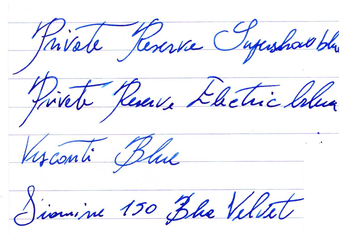 Dal punto di vista tecnico, il Private Reserve è superiore per saturazione e lubrificazione, mentre il Diamine è più fluido e asciuga più rapidamente. Le tonalità sono molto simili, con il Private Reserve che è un vero blu elettrico mentre il Diamine rende onore al suo nome con un colore che non è blu elettrico ma gli è piuttosto vicino. Con pennini fini sono molto simili mentre le differenze cromatiche si accentuano con pennini dal tratto largo.