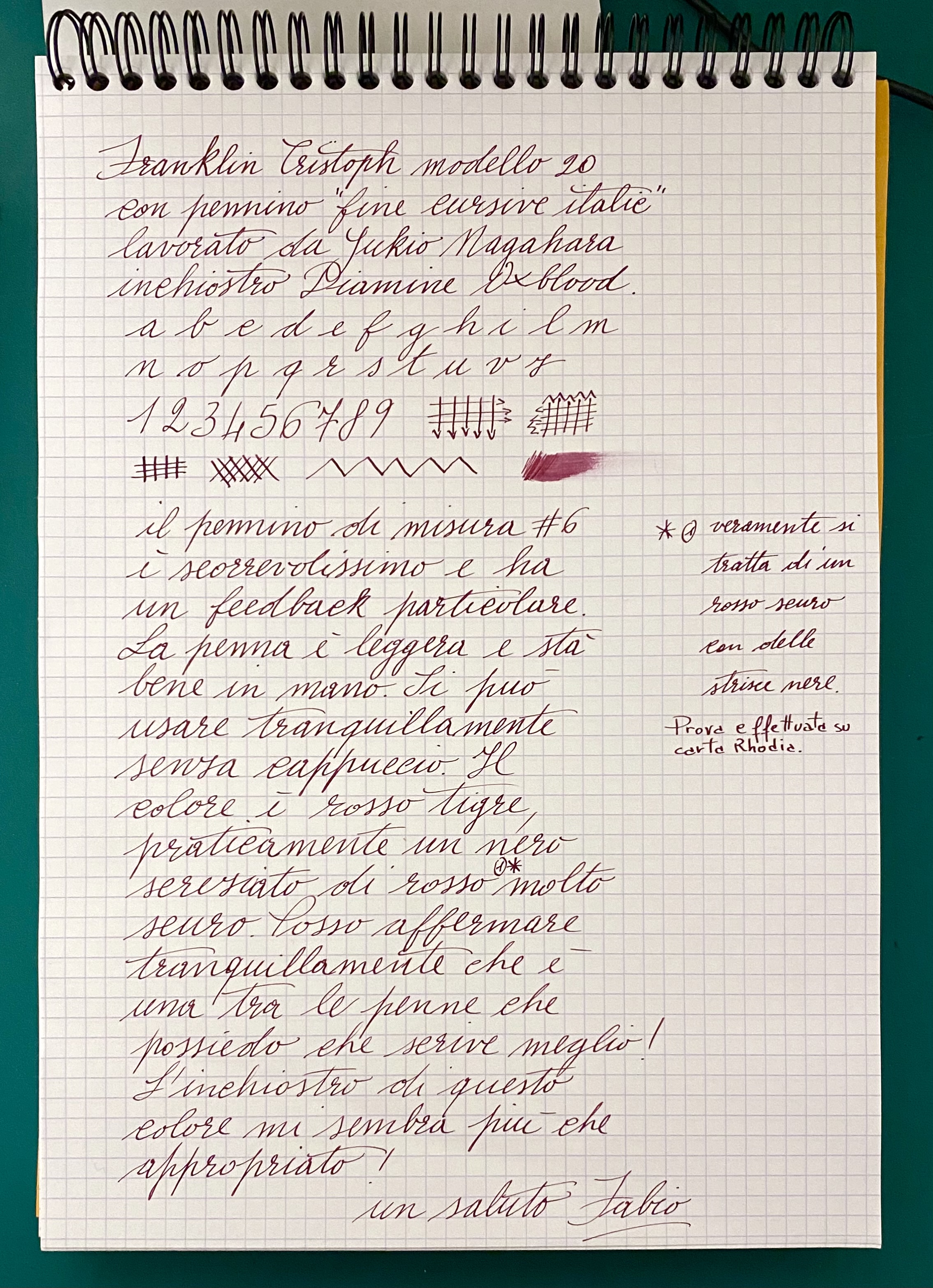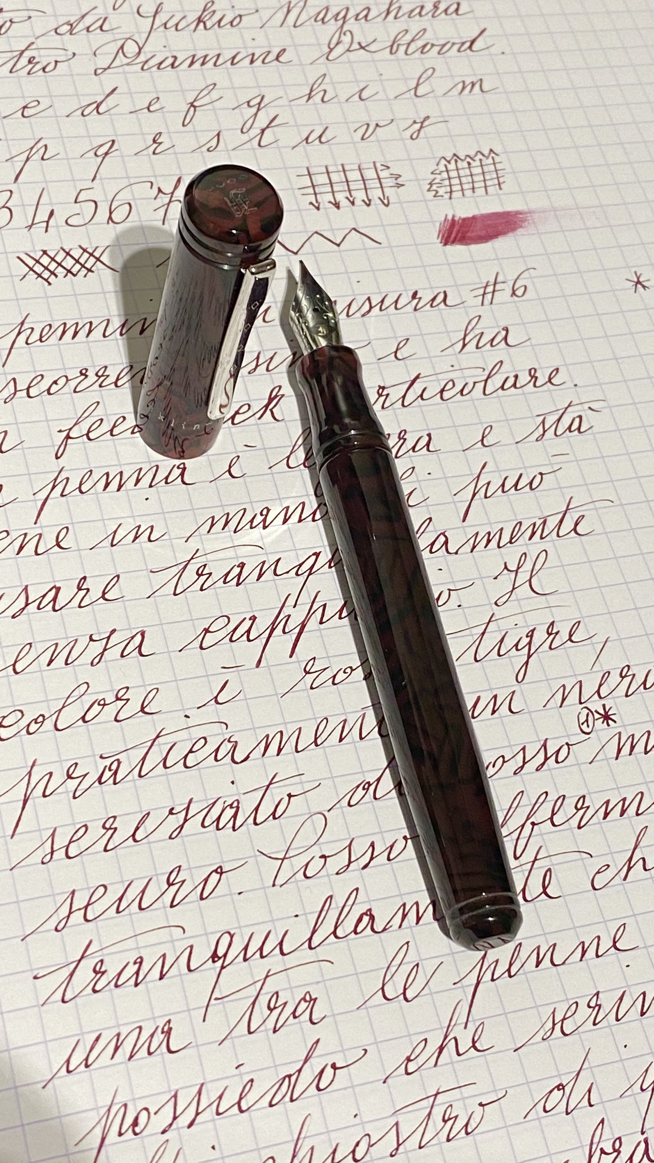 Per gli appunti va sicuramente bene. Non la considero affatto una penna da calligrafia da usare lentamente. Ovviamente non so quanto tu scriva veloce ma ho fatto delle prove a scarabocchiare velocemente e la penna mi ha sempre seguito senza una incertezza. L’inchiostro caricato è il Diamine Oxblood e il tratto è abbastanza umido. Per quanto riguarda la larghezza del tratto considera che con altre penne dal tratto fine riesco a scrivere tranquillamente e in maniera chiara usando tutte le righe di un blocco a quadretti da cinque millimetri mentre con questa le E, la S e la R si pasticciano un po’ quindi scrivo a righe alterne. Non ho molta esperienza in merito ma non credo che prendere un pennino M aumenti la variazione di tratto perché anche il tratto sottile sarebbe comunque più largo, essendo appunto un M. Poi credo che tutto dipenda da quanto scrivi grande ma non credo che un M possa risultare sbrodoloso, considera che si tratta comunque di un pennino Jowo poi modificato in punta ma l’alimentatore è quello standard. Per concludere devo dirti onestamente che ho diverse penne che scrivono in maniera eccellente e questa non è assolutamente da meno, con il plus di dare alla grafia un tocco particolare. Mi sono dilungato