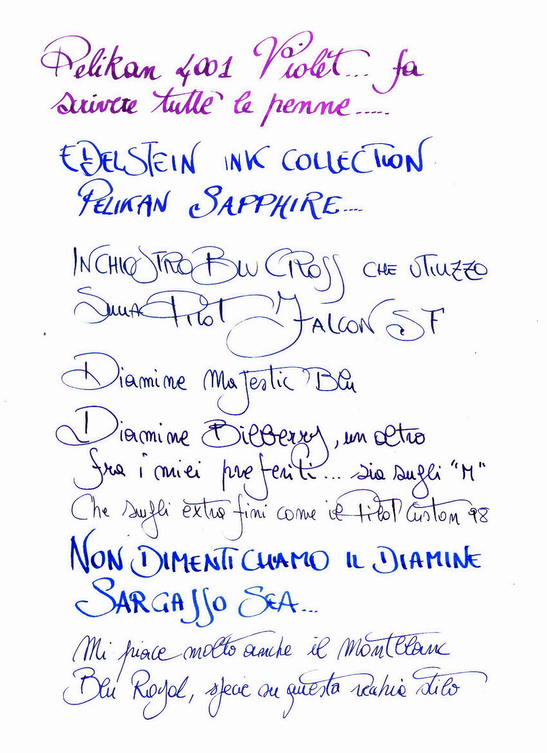 Sto iniziando ad apprezzare anche i Diamine ma per ora non me la sento di dire che sono inchiostri con cui terrei carica una penna (anche se ho penne caricate a Diamine anche ora).