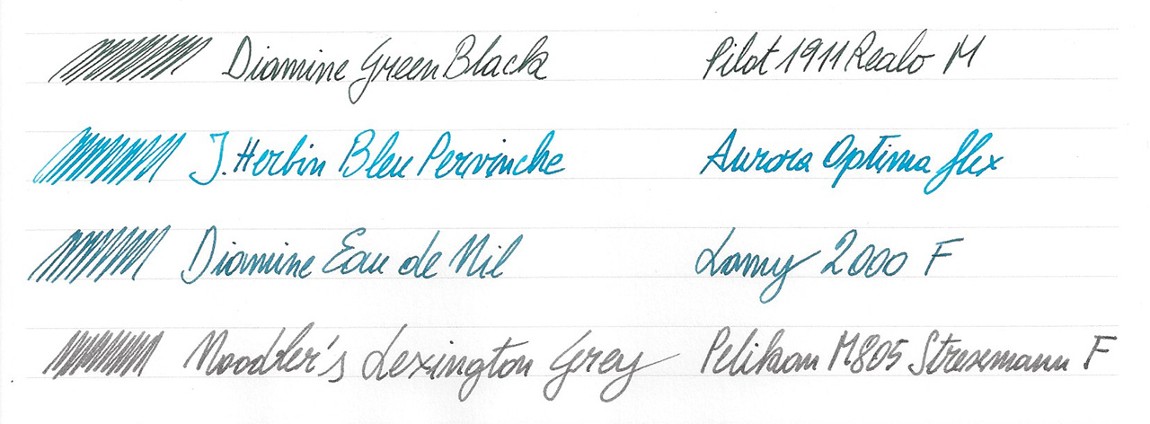 Diamine Green Black per tutti gli usi da ufficio, Herbin Bleu Pervinche per le annotazioni, Diamine Eau de Nil per gli appunti personali e Noodler's Lexington Grey per la corrispondenza.