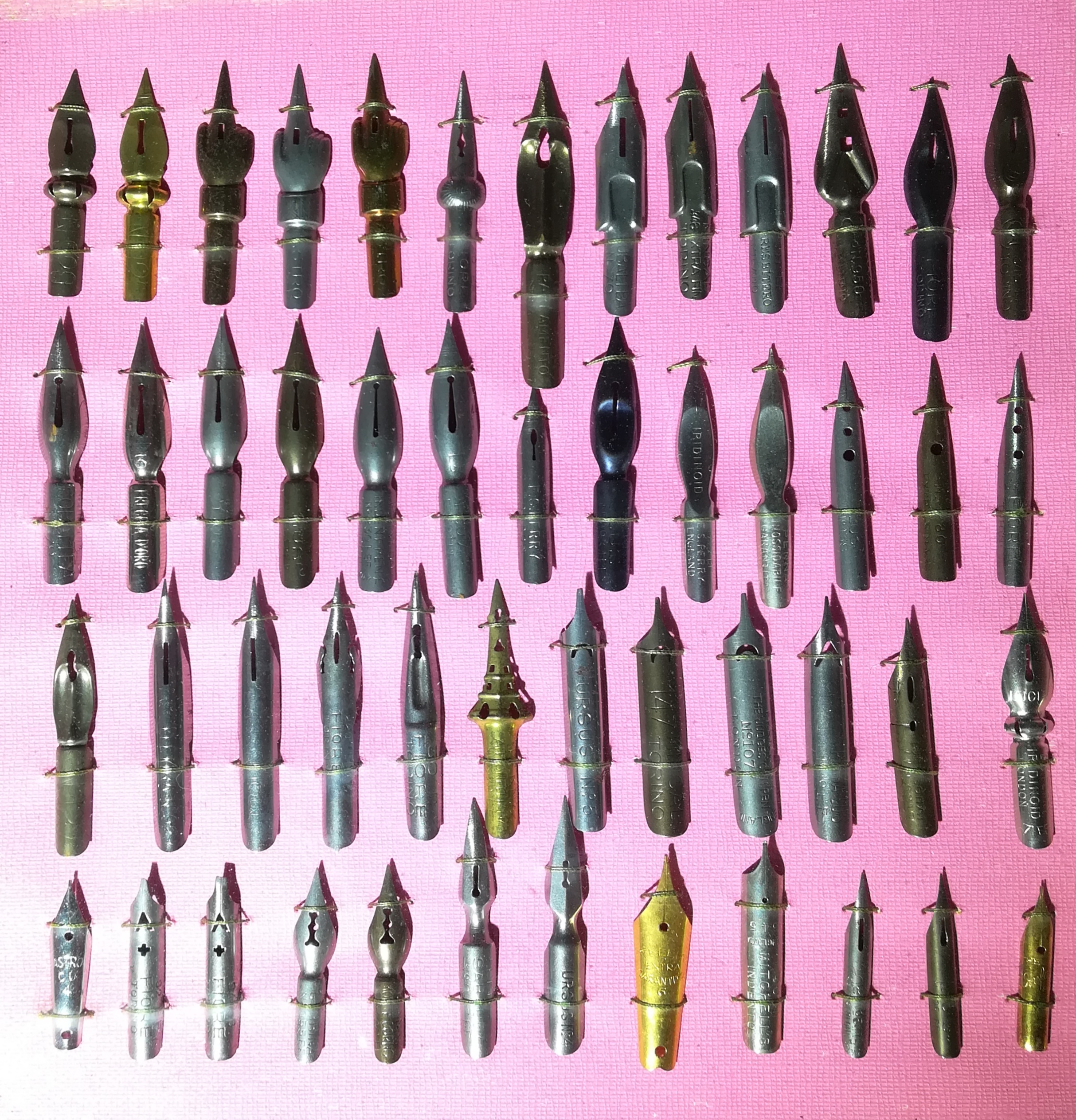 Cari amici maestri e appassionati, voglio mostrarvi questi 50 pennini incorniciati che mi sono stati tramandati. Premetto di non conoscerne alcuno e di non essere nemmeno riuscito a capire se son tutti da calligrafia... In effetti alcuni mi sembrano di stilografica moderna.
