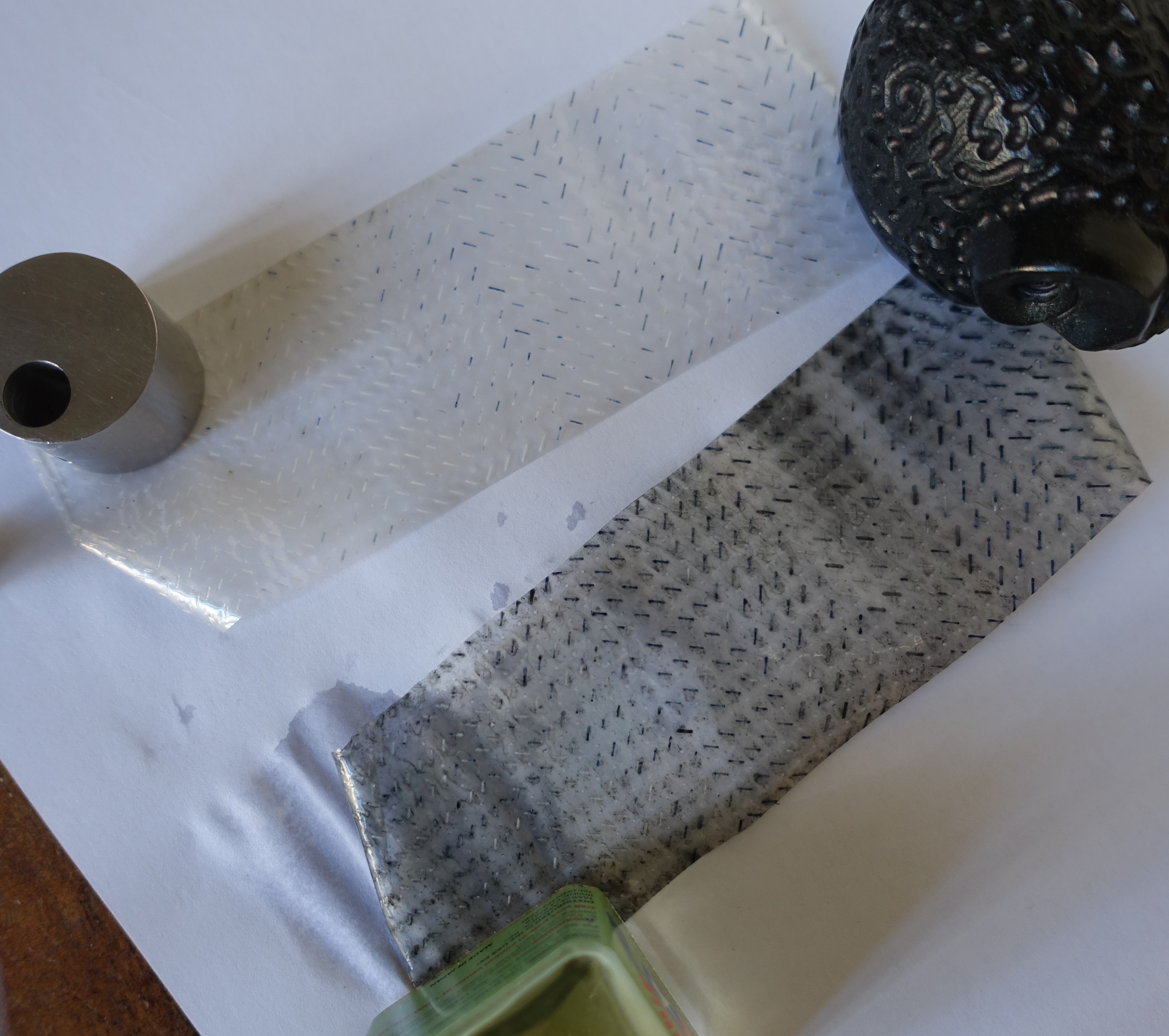 La superficie del foglio è totalmente incisa con tagli di pochi mm di lunghezza e distanti pochi mm tra di loro disposti a 45 e 315°, ovvero disposti a "V", disposte su ripeture file parallele. Immaginate questi come se fossero stati fatti con un cutter non perfettamente affilato, che ha lasciato i bordi minimamente sollevati. Verosimilmente questo impedisce alle spire avvolte di aderire perfettamente le una alle altre, andando quindi a costituire l'accesso capillare; i singoli tagli invece, secondo la mia interpretazione, funzionano da micro-serbatoi.
