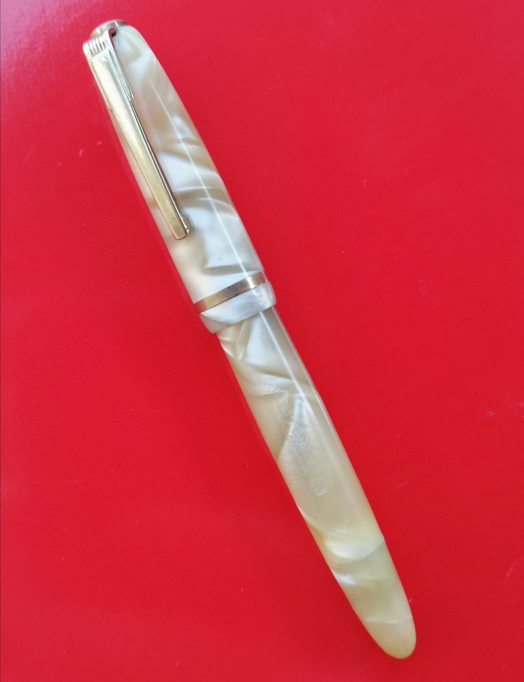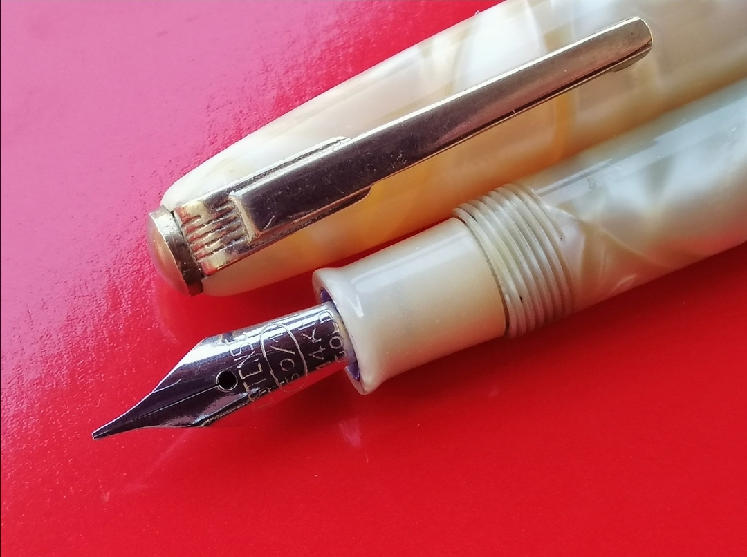 Buonasera, posto le foto di questa piccola meraviglia in celluloide perlata. Molto piccola, direi una misura lady (111 mm con cappuccio chiuso, 123mm con cappuccio calzato). Pennino semiflex da 14kt. Caricamento con pulsante di fondo. Molto bella, soprattutto la colorazione, purtroppo poco adatta a me nell'insieme.