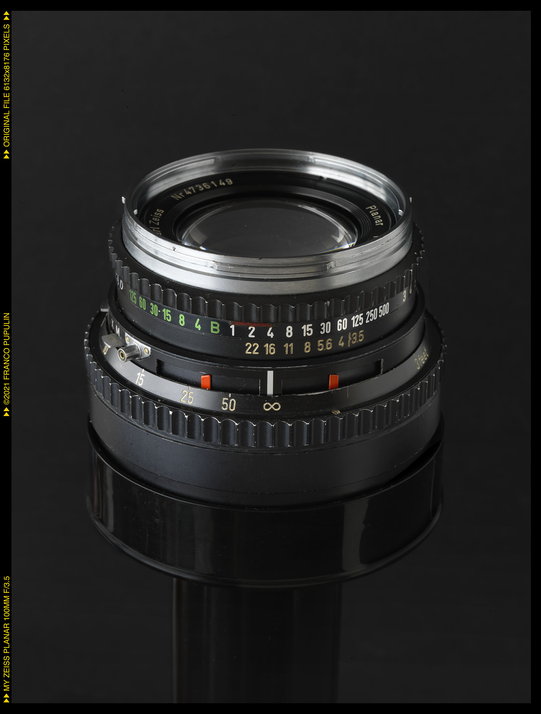 Lo Zeiss Planar 100mm f/3.5 della serie C per la Hasselblad non fu mai prodotto in finitura completamente cromata, ma nacque nel 1968 in acciaio completamente nero (di fatto, fu il primo obiettivo Zeiss per Hasselblad in finitura nera) . I disegnatori della Hasselblad erano un po' preoccupati dal fatto che, una volta verniciata di nero, la ghiera anteriore dell'obiettivo, sulla quale si montano i filtri ed altri accessori, potesse con il tempo "pelarsi", rivelando il metallo sottostante. Avevano ragione, e molti degli obiettivi C neri delle Hasselblad hanno la vernice un po' sbiadita sulla ghiera anteriore. Per un breve periodo, nei primi anni '70, per ovviare al problema, gli obiettivi Zeiss per Hasselblad furono prodotti in finitura nera ad eccezione della vera frontale, cromata, meno soggetta ad usura estetica. Il mio Planar 100mm é di questa serie intermedia, che trovo bellissima.