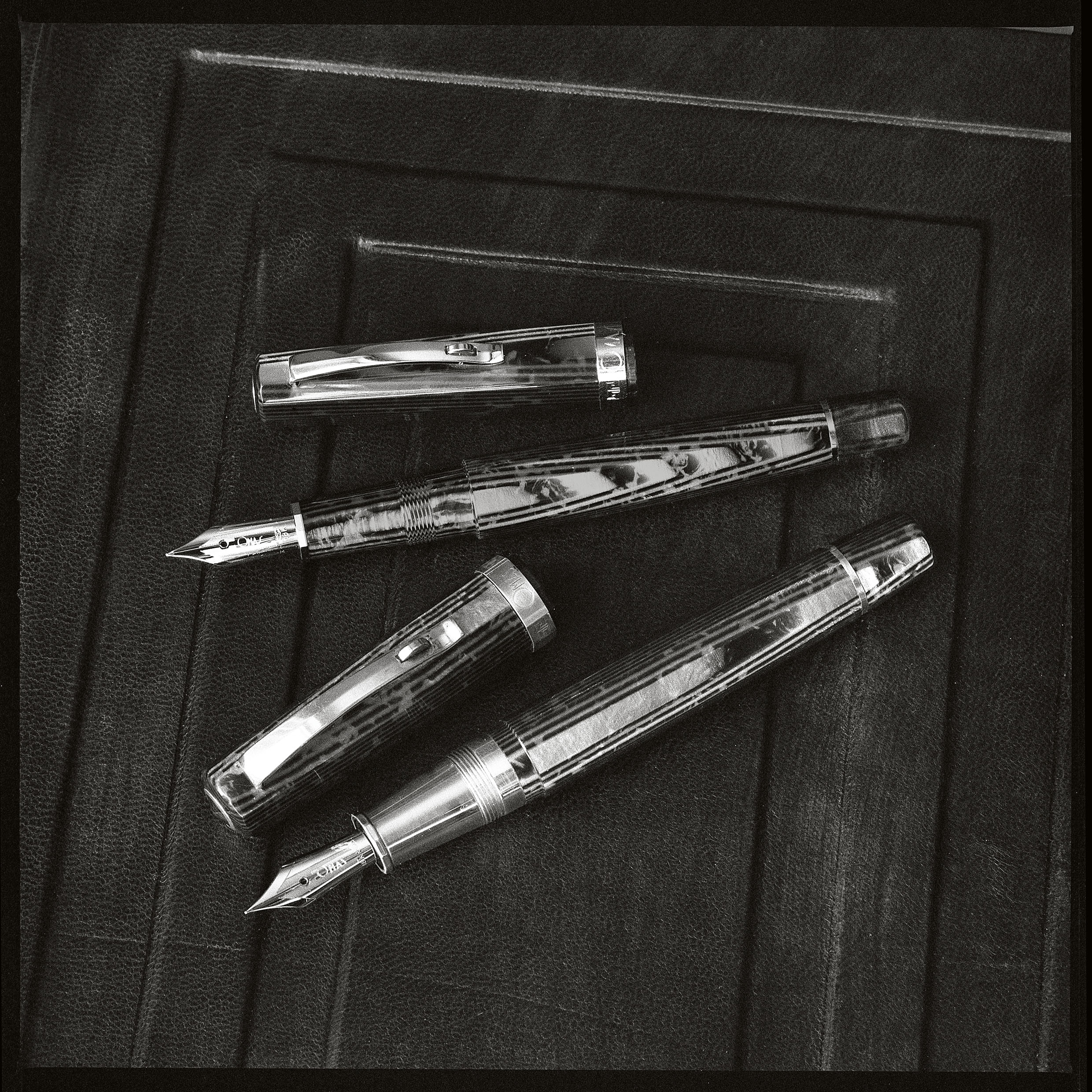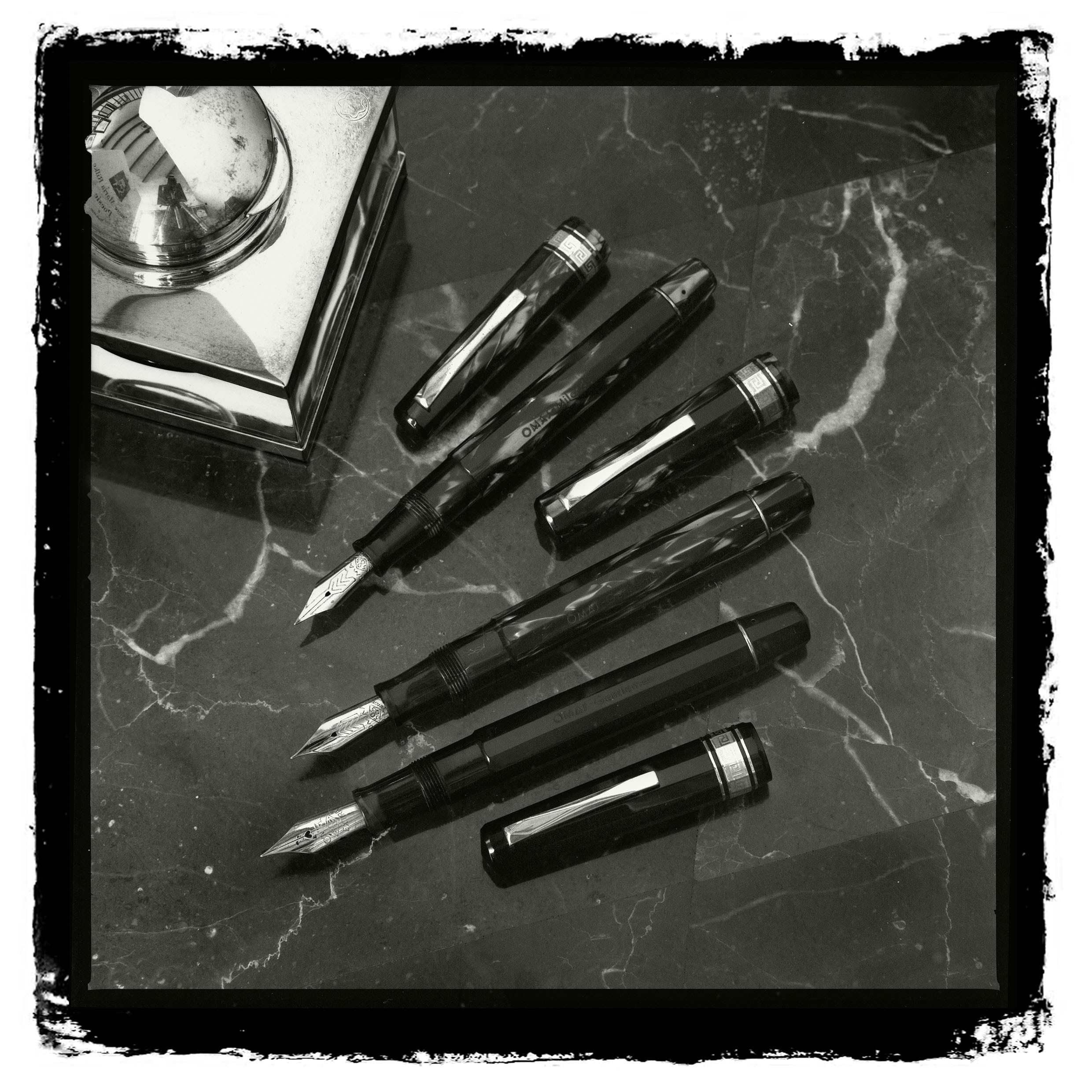 Le OMAS sono una Milord (taglia media) in celluloide grigioperla, e due Gentlemen (taglia senior), ancora in celluloide grigioperla e celluloide nera.