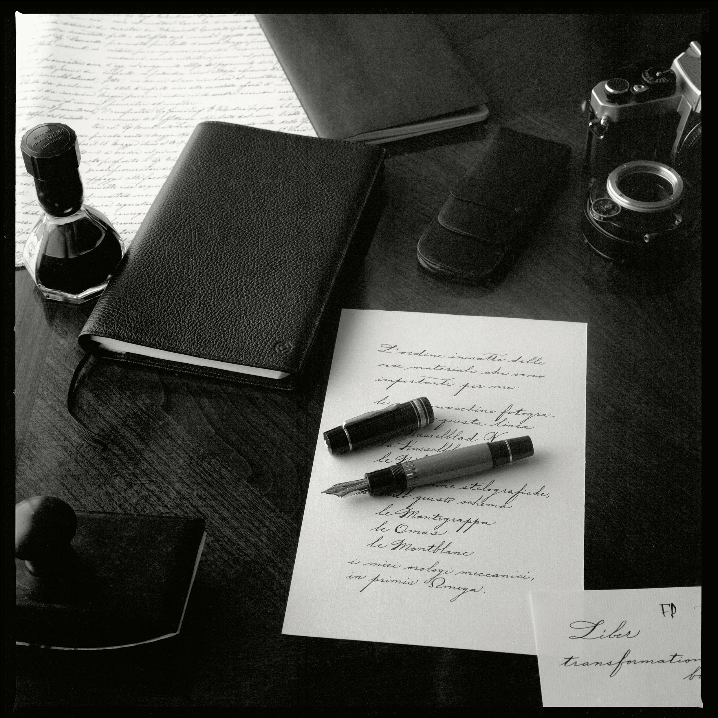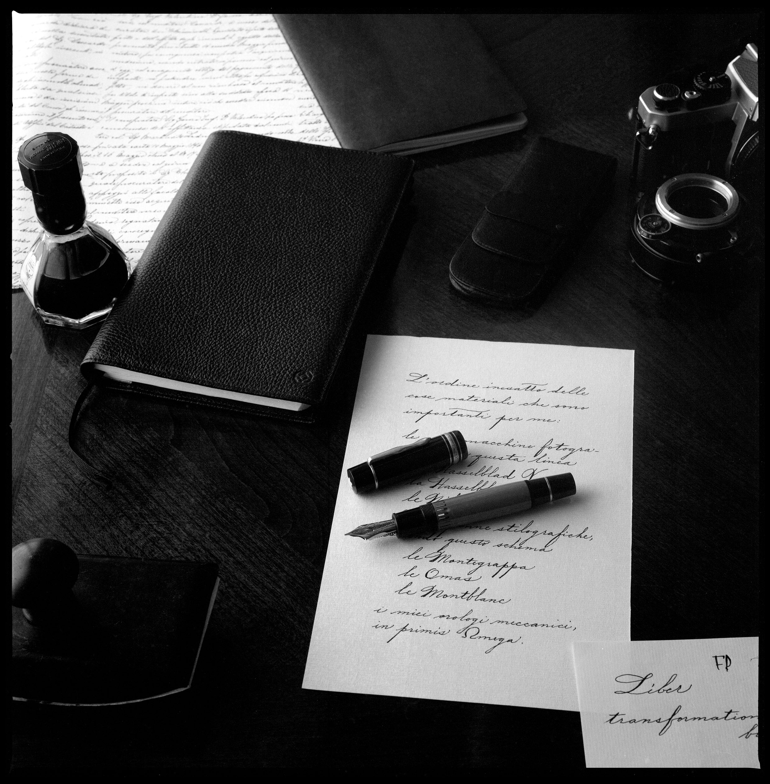 In tono bassissimo, per vedere appena le texture: la pelle del quaderno, la liscezza della penna, la sottile vergatura della carta... Zeiss Planar 100 mm su pellicola Ilford FP4 esposta a 125 ISO, sviluppo standing in Ilfotec DDX.