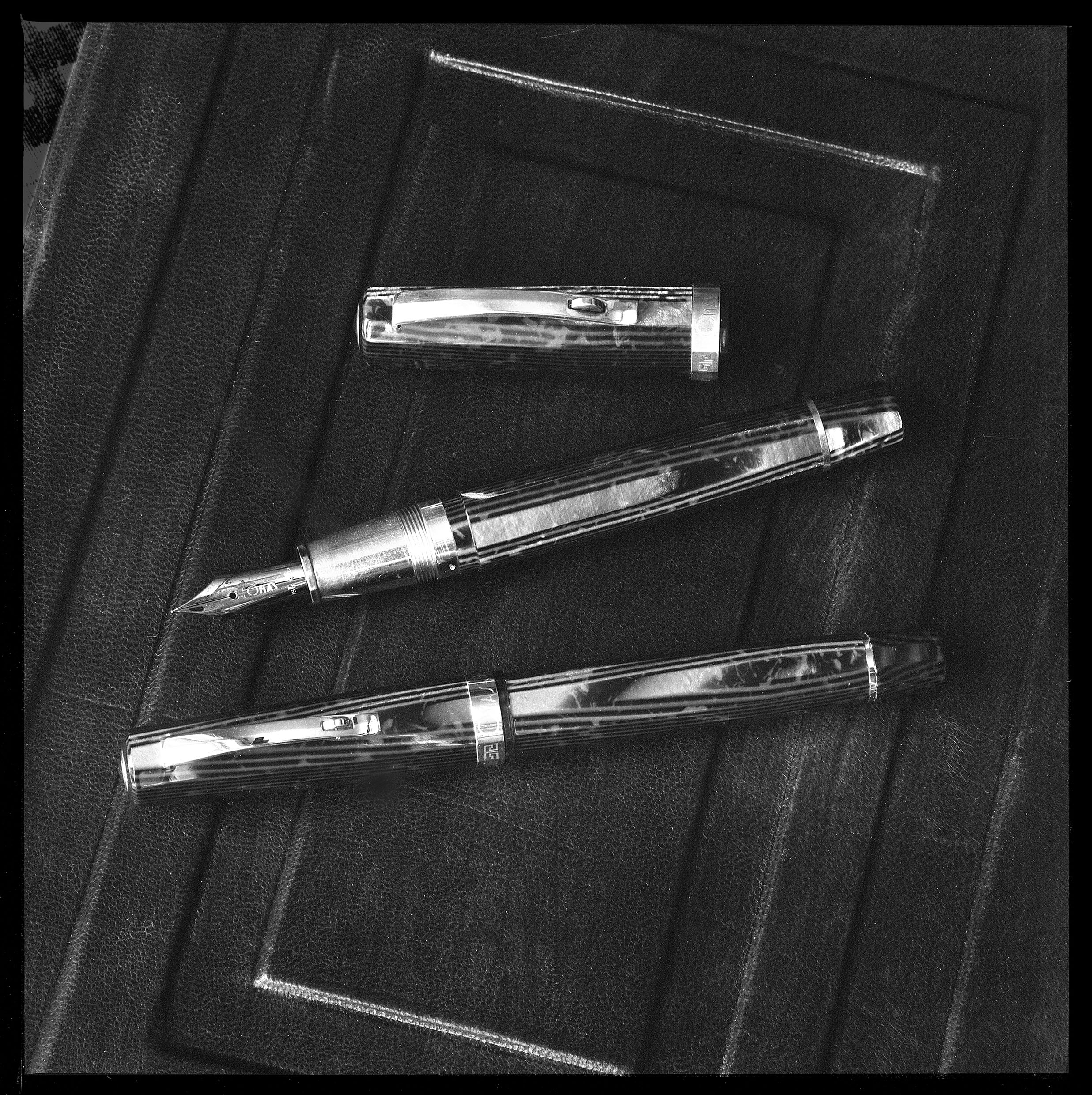 I materiali "con luce propria" aiutano il fotografo: qui la celluloide Arco di OMAS fotografata sulla pellicola PanF, utilizzando l'obiettivo "normale" della Hasselblad, il Planar 80mm f/2.8, montato su un tubo di estensione: