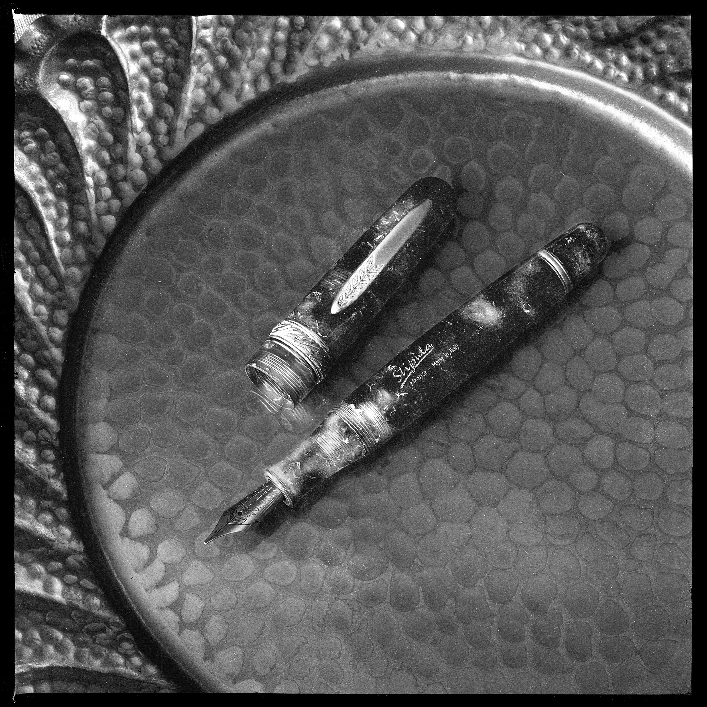 Le tre OMAS riprese con lo Zeiss Planar 135mm, obiettivo da montare necessariamente su soffietto, perché la protrusione delle lenti posteriori interferisce con lo specchio della Hasselblad. La cosa magica é che, una volta sul soffietto, quando questo é completamente ritratto l'obiettivo mette a fuoco all'infinito, e quando il soffietto é completamente esteso, permette un rapporto di riproduzione del soggetto sulla pellicola a scala naturale (1:1).