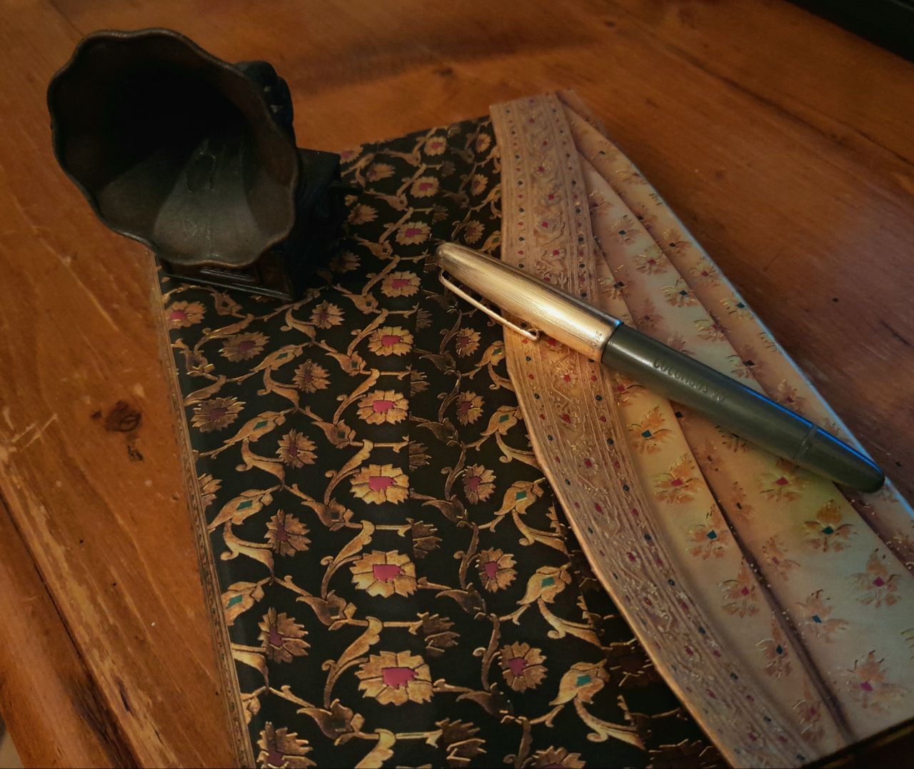 Vi lascio ora qualche foto della penna (in posa con un taccuino Paperblank ed un temperino vintage a forma di grammofono), della scatola, e della prova di scrittura.