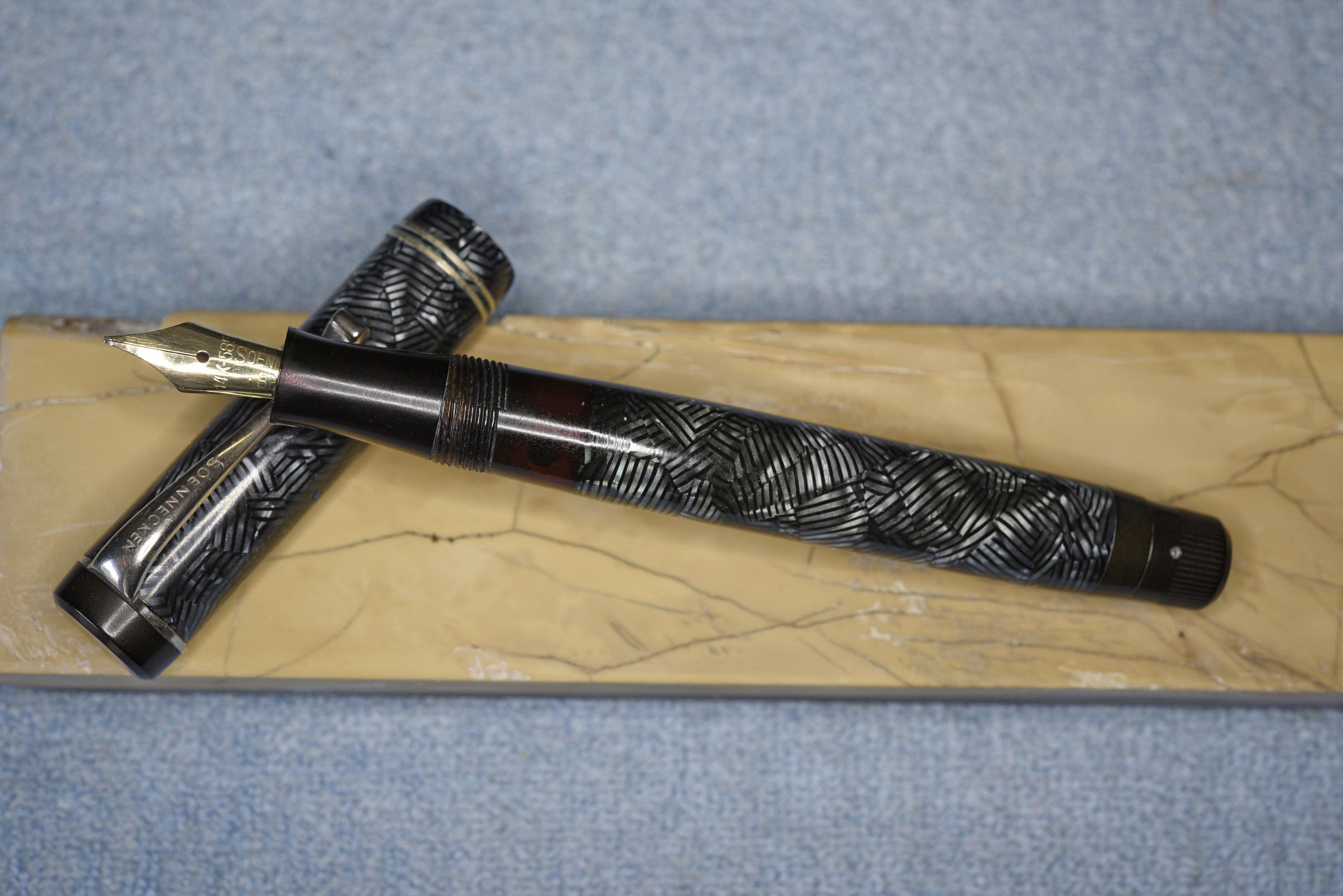 La penna è simile alle altre della serie 50x, è dotata di pennino in oro 14K e caricamento a pistone, la forma è flat top con doppia veretta sul cappuccio ed il fondello e la testina sono in bakelite, sul corpo è presente una finestra trasparente rossiccia per controllare il livello dell’inchiostro. L’esemplare in mio possesso è costruito in celluloide con disegno “aghi di pino” .