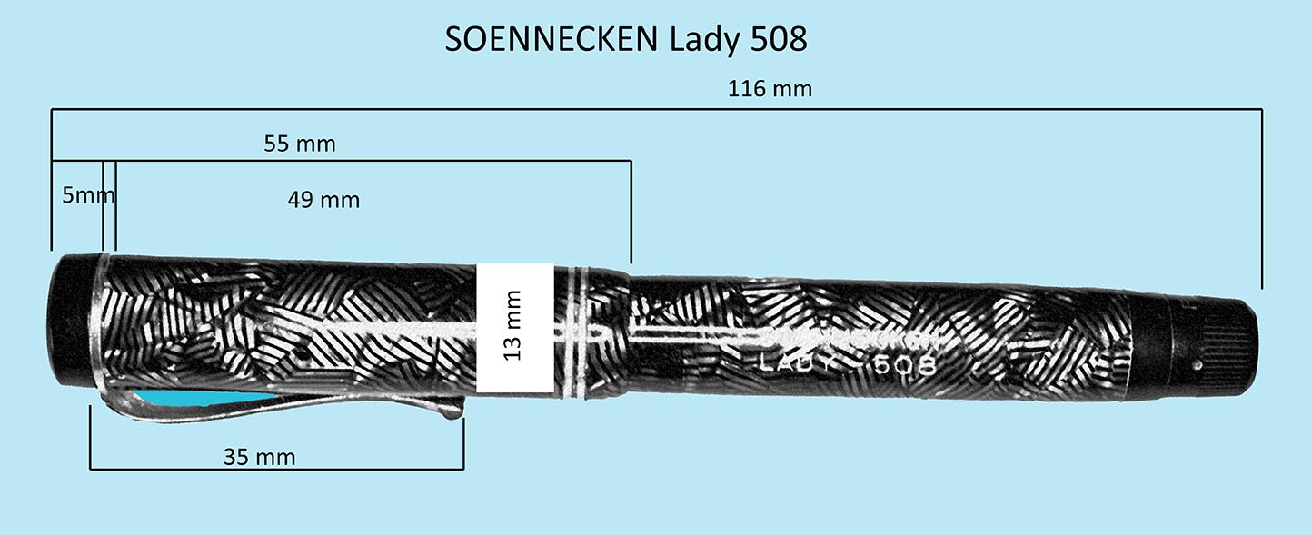 Nei cataloghi e nelle pubblicità la 508 non compare, ma sulle Soennecken non sono riuscito a trovare tante informazioni (mi sa che la mia totale ignoranza del tedesco in questo caso non aiuta). Approfitterò delle tue foto, aggiungendo un riferimento al wiki, e già che ci sono ti chiedo qualche dato in più, i 13 mm sono i diametri del tappo o del fusto? e il cappuccio quanto è lungo?