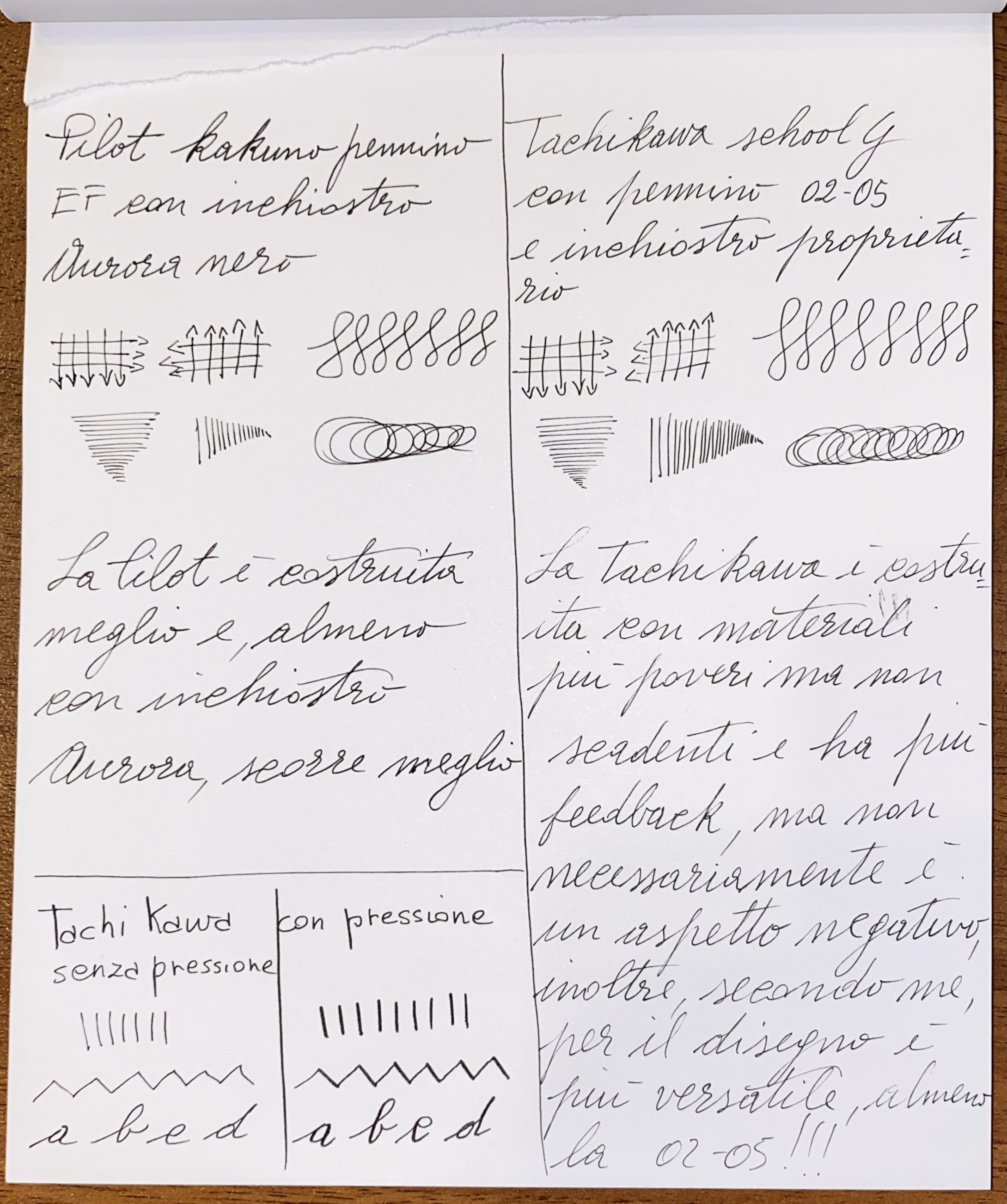Le Tachikawa, entrambe, ha un pennino molto fastidioso, con un feedback a mio avviso eccessivo, in grado di graffiare la carta, esattamente come accade con alcuni pennini da intinzione. Non ho be capito la differenza tra G e normale, ma la flessibilità non c'entra (sono entrambi rigidi).