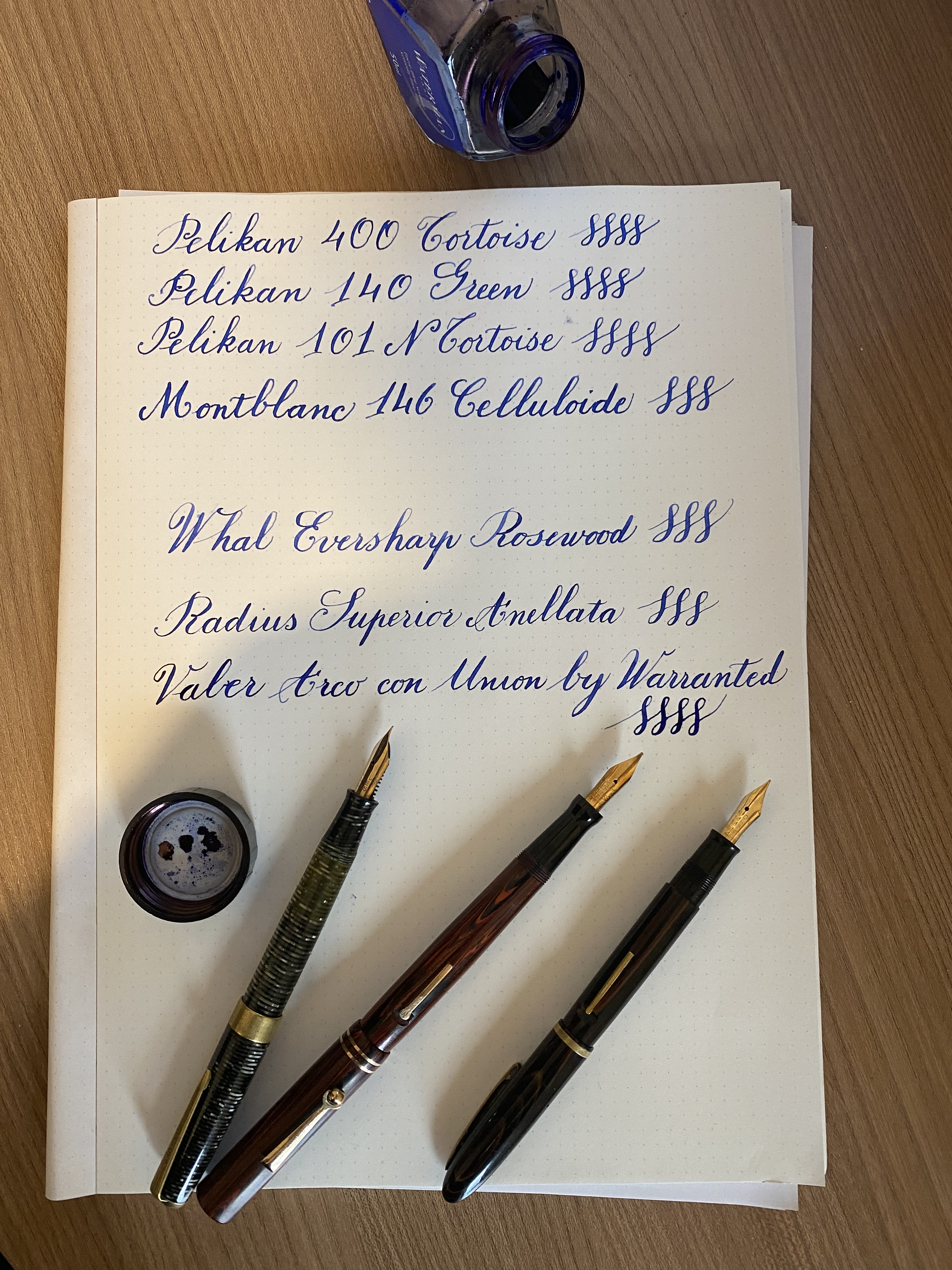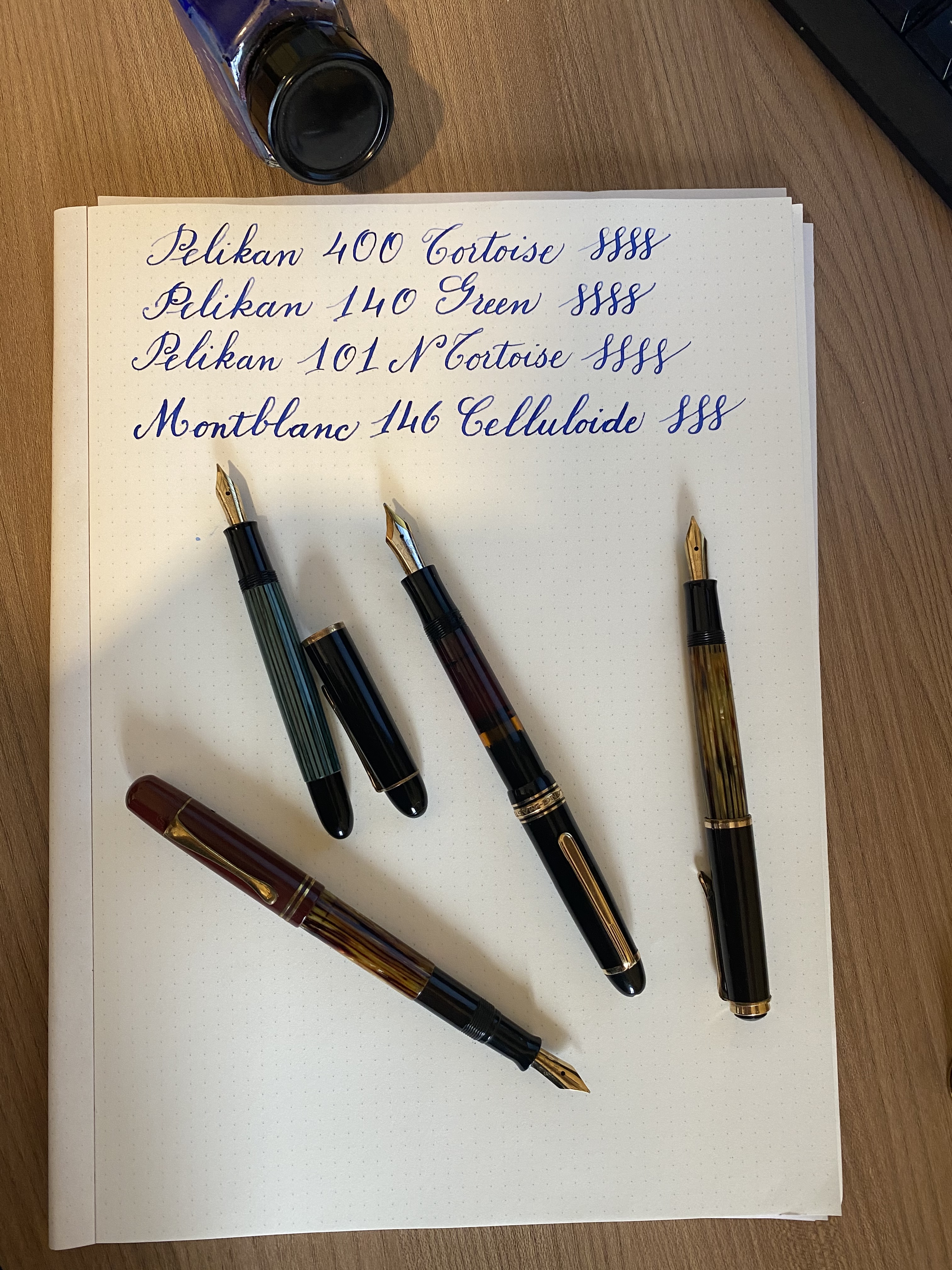 La 400 Tortoise e la 101N Tortoise hanno pennino Medio mentre la 140 ha un pennino EF, la differenza non è praticamente visibile. Sono pennini che richiedono una discreta pressione, ma flettono e ritornano bene. E' interessante vedere come per pennini che spaziano dagli anni '30 della 101N agli anni 60 della 140 il carattere è rimasto pressoché invariato. Successivamente trovo che i pennini Pelikan siano al massimo piacevolmente morbidi, ma almeno fino agli anni 80 ancora in grado di dare una certa espressione alla grafia.