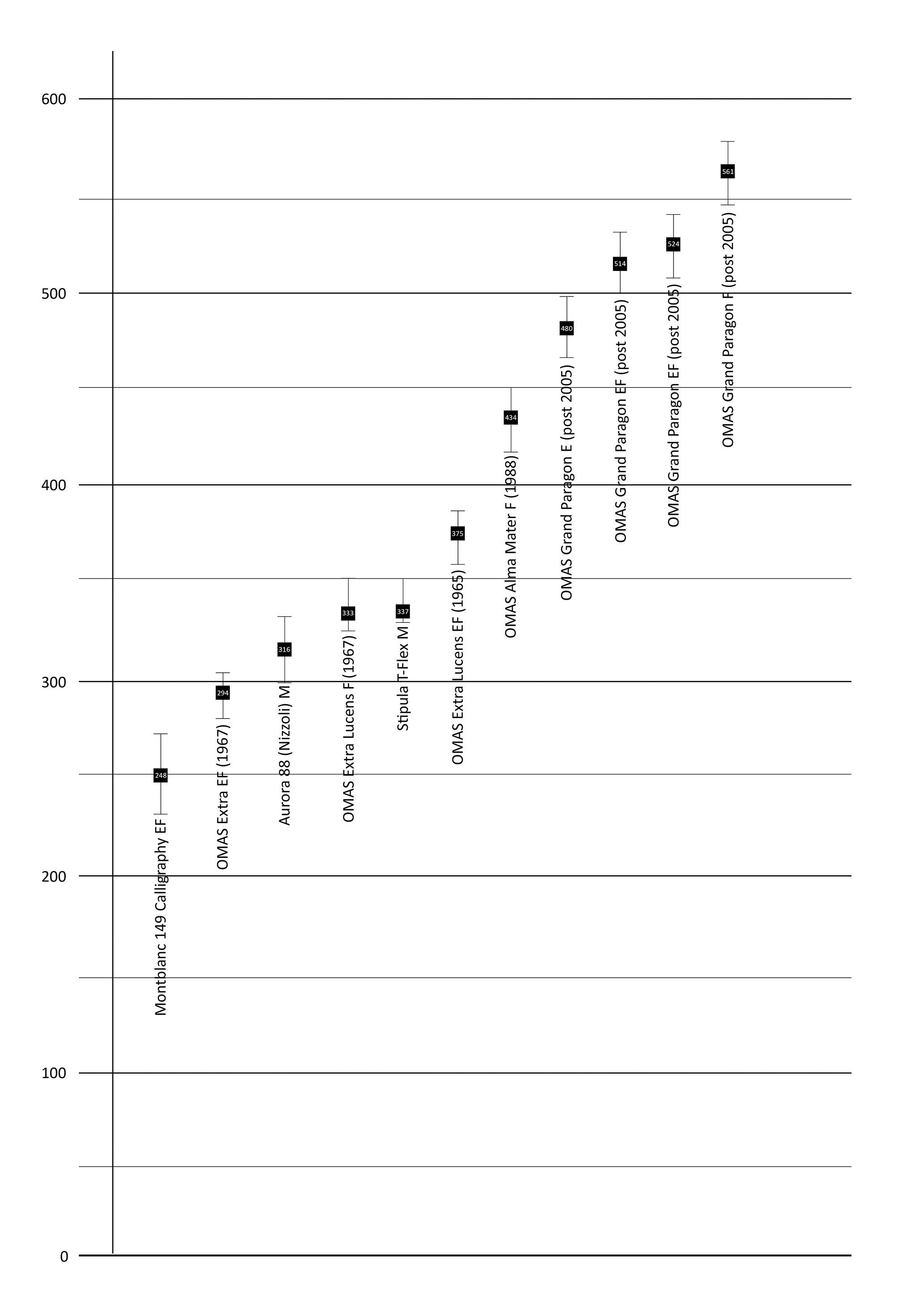 Pur con i difetti della misurazione, mi sembra che i risultati riflettano la mia "impressione" dei pennini.