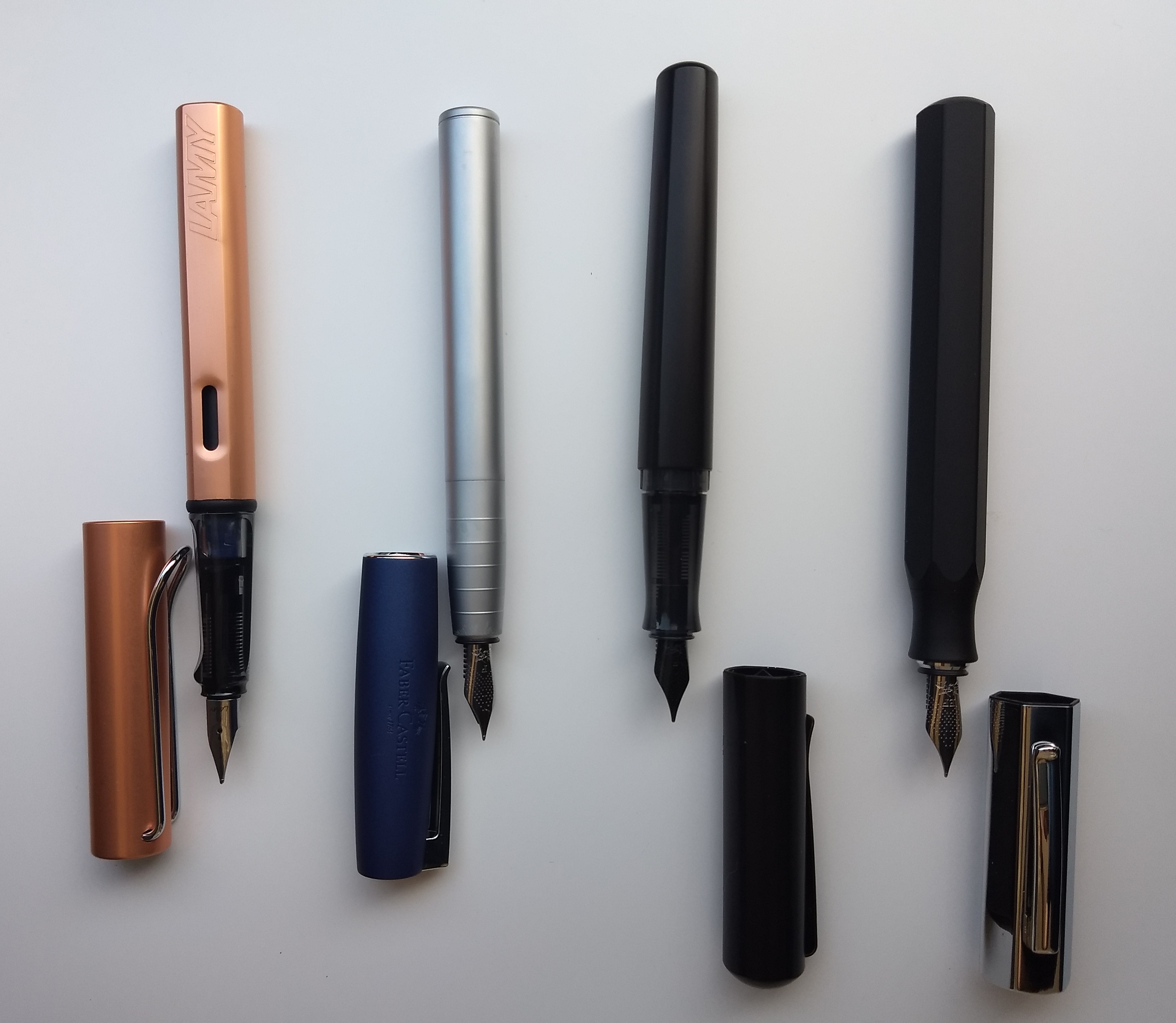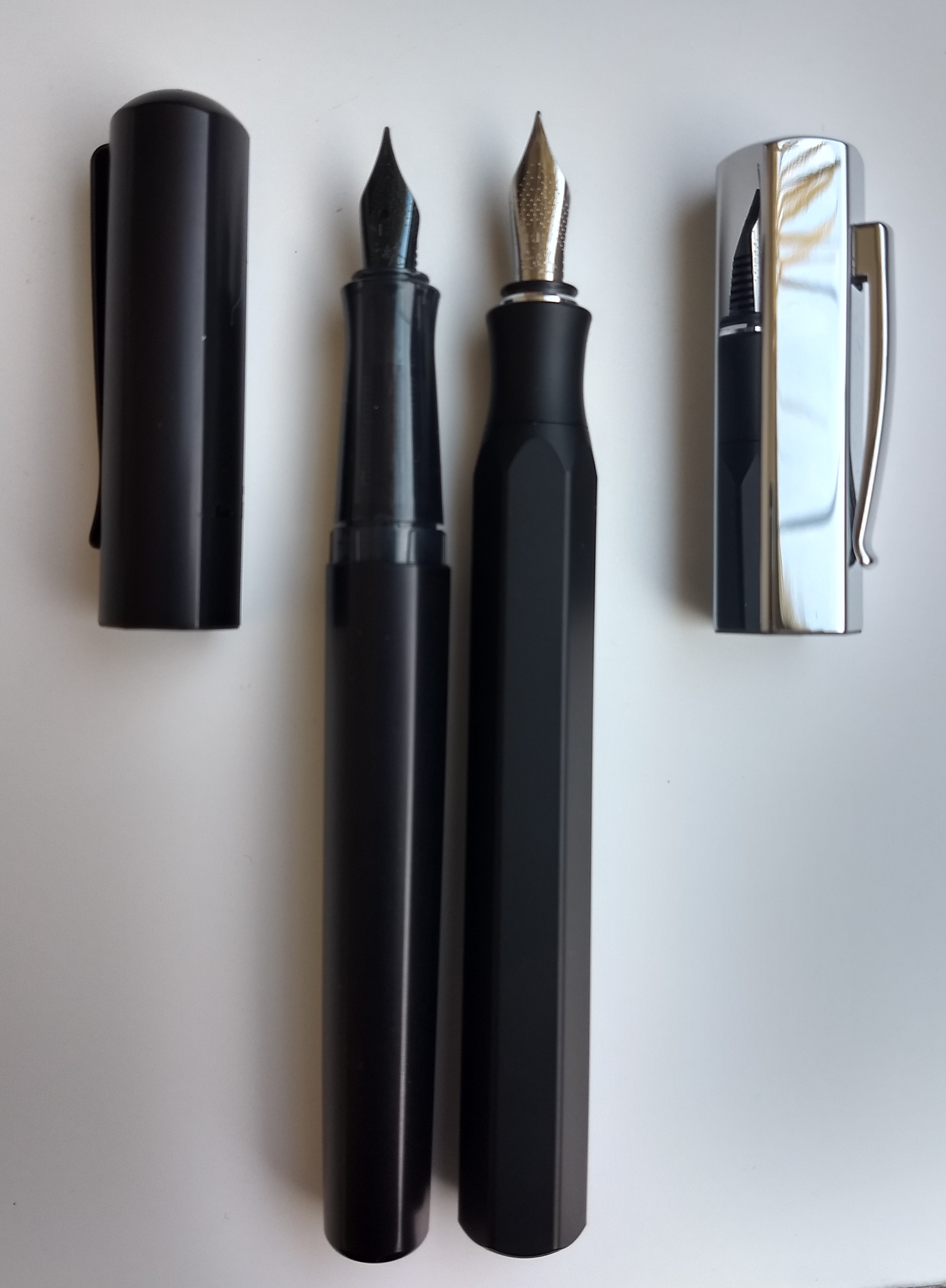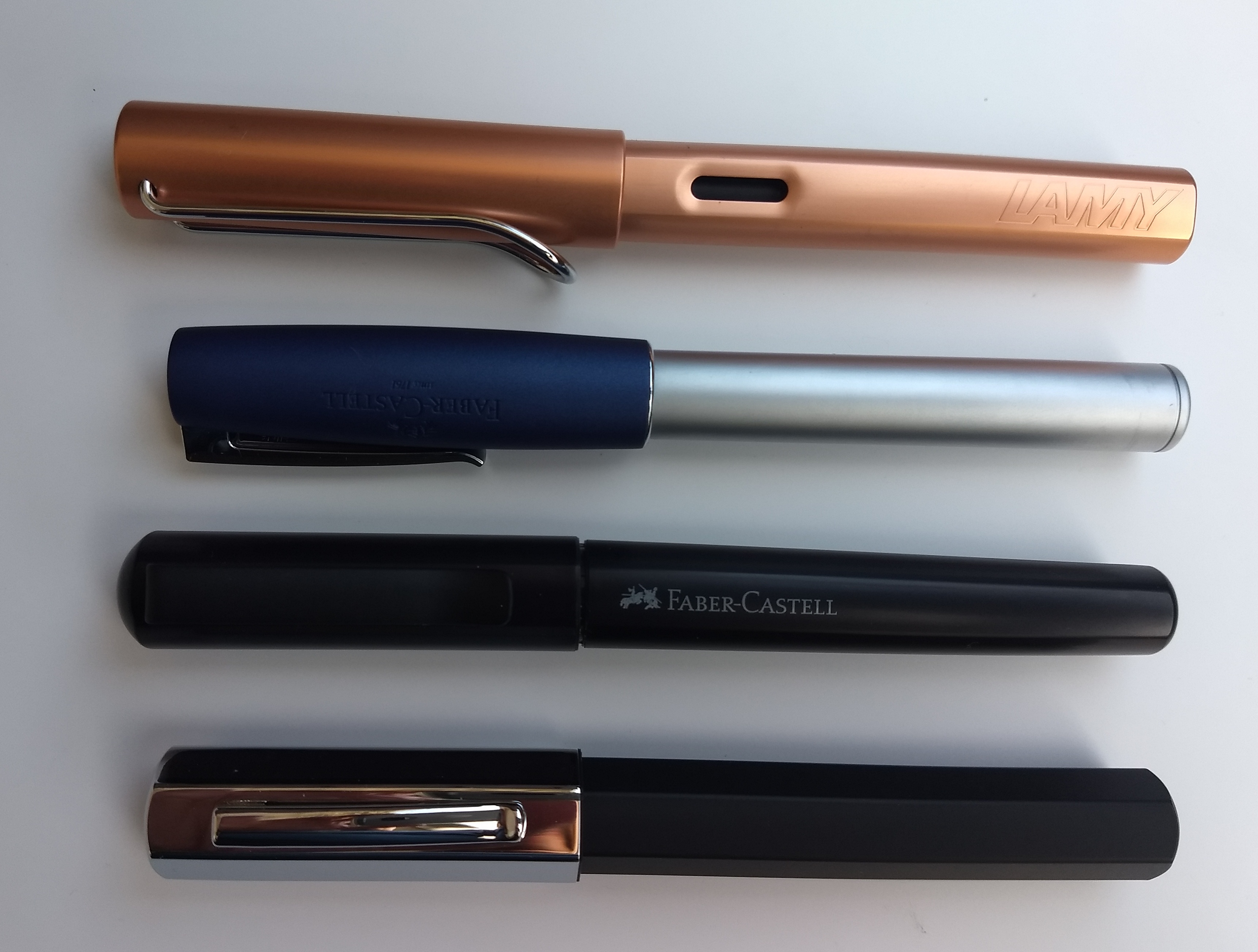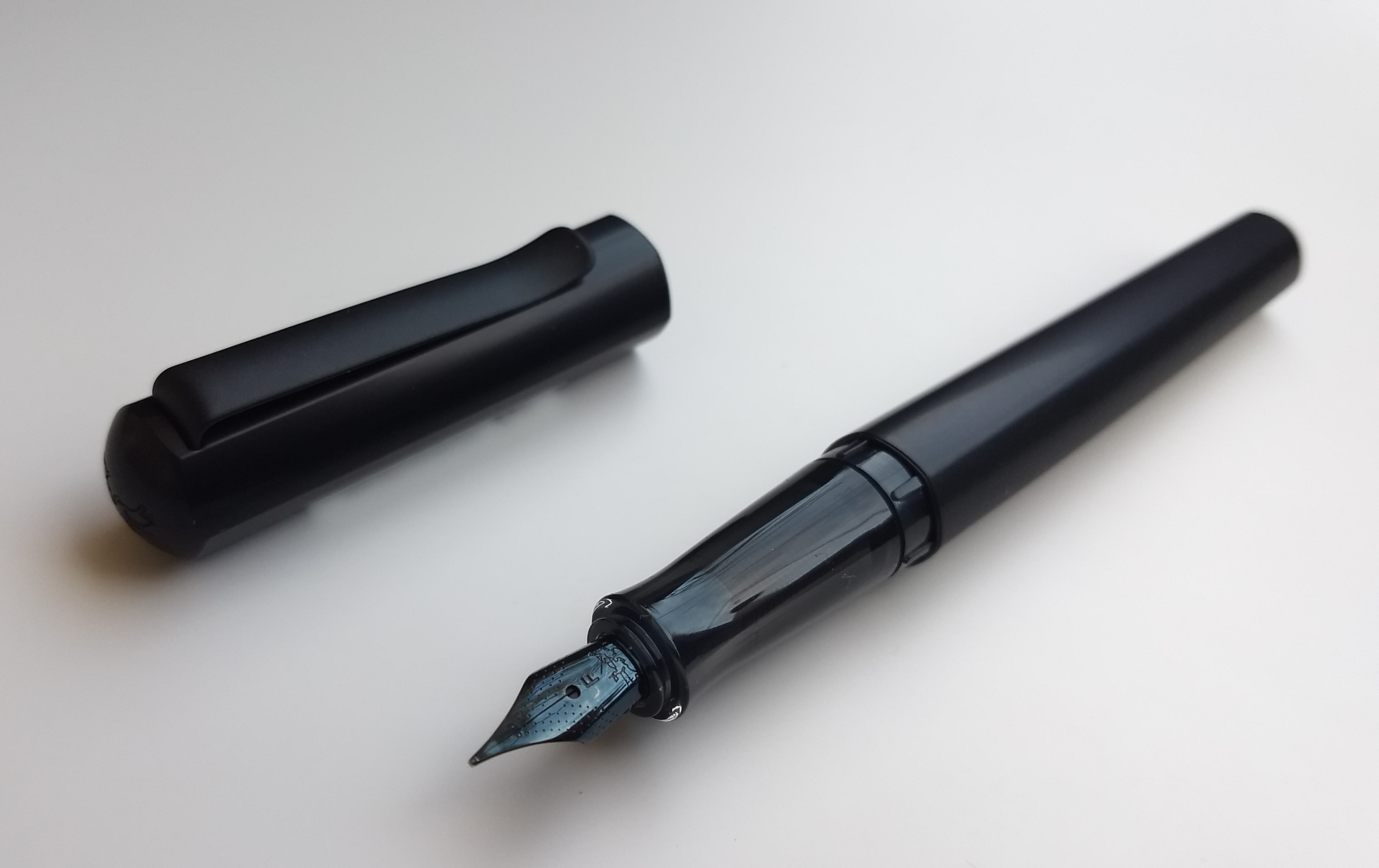 Mi piace abbastanza, mi aspettavo una qualità un po’ superiore, ma non è affatto male. Il corpo e il tappo della penna sono in alluminio, la sezione in plastica. Monta cartucce standard, anche lunghe, o converter (non in dotazione). Grazie alla particolare scanalatura, la chiusura del fusto fa un piacevole scatto che ci comunica la corretta chiusura. L’impugnatura la trovo molto comoda e la scrittura piacevole.