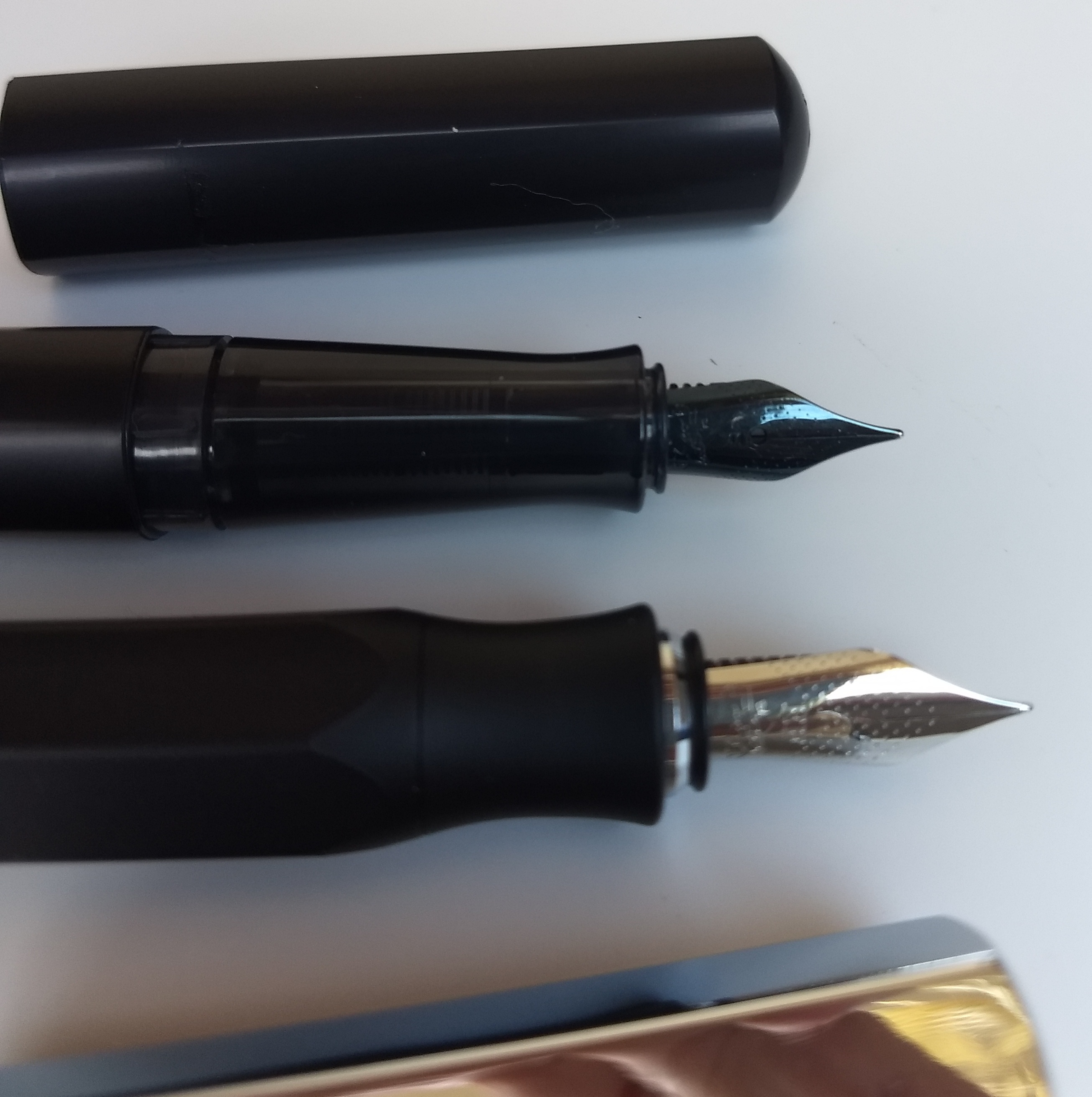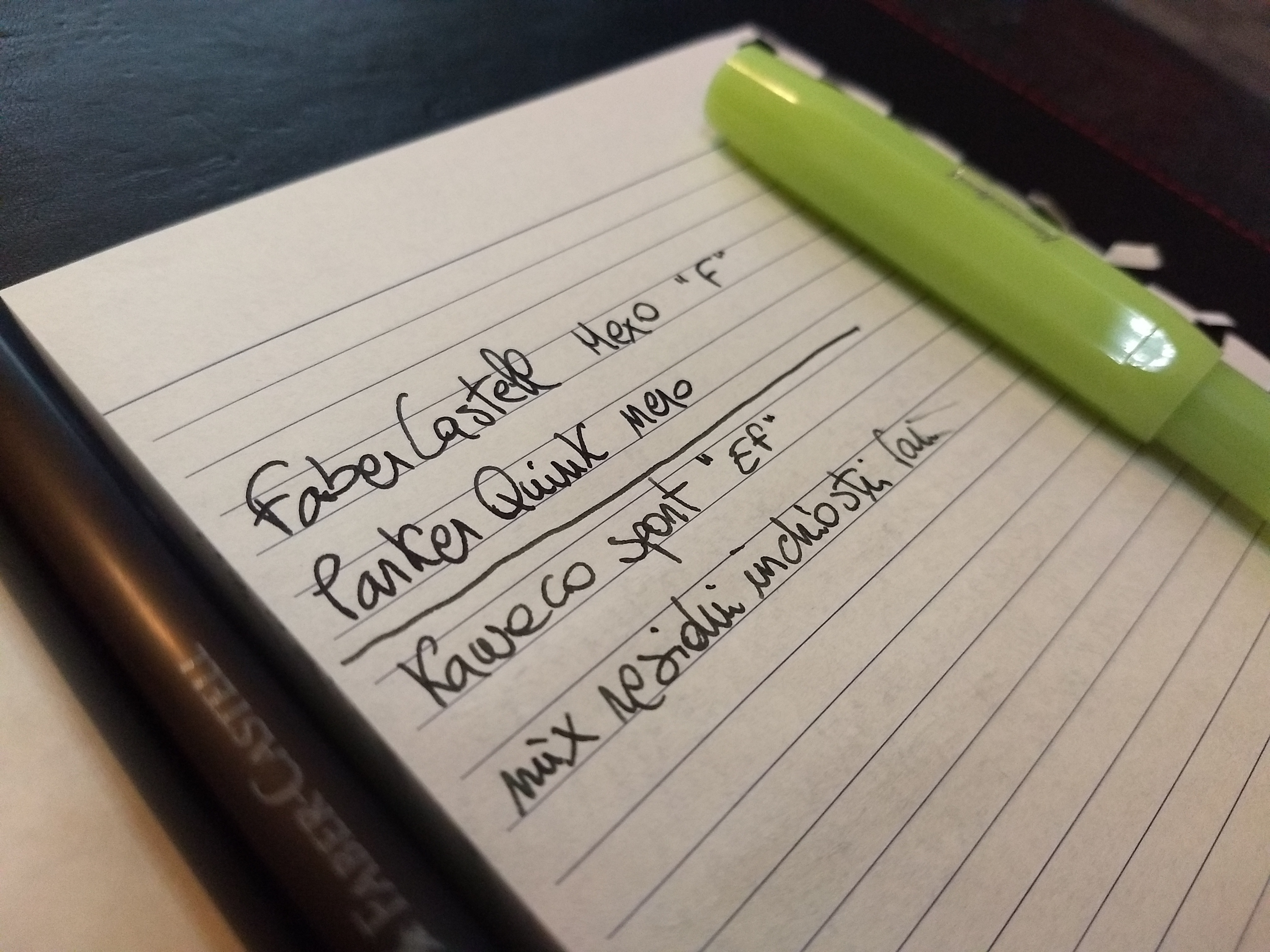 Tieni presente che quella carta allaga un po' il tratto. Per quello ho scritto sotto anche con la kaweco che ha un pennino EF.