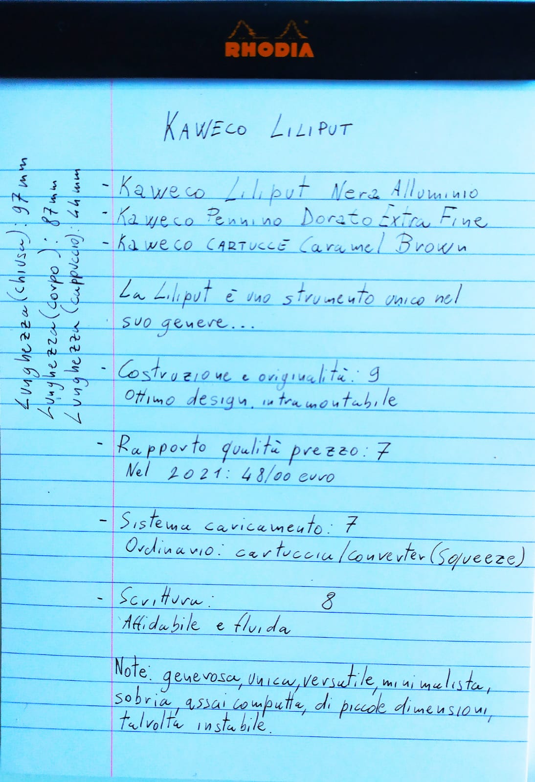 La Liliput è uno strumento unico nel suo genere, creata per stare accanto al suo padrone, senza mai farsi notare, tranne quando la si tira fuori, allora con quel gesto di avvitare il suo cappuccio al corpo dello strumento, attira lo sguardo dei curiosi. Ottimo il flusso (costante), buone le caratteristiche di scrittura, non eccelso il parametro tra costo e prestazioni, sconsigliato come primo strumento introduttivo, adatta, grazie alle sue minuscole dimensioni, per essere portata con se ovunque. Consigliato avvitare il cappuccio durante la scrittura, perché lo strumento acquista stabilità e la lunghezza necessaria per un utilizzo equilibrato. Stilografica assai leggera in versione Alluminio (le sue sorelle Ottone, Rame e Acciaio sono più pesanti e stabili nelle mani). Esteticamente armonica ed elegante, dalla linea a forma di sigaro, nel colore nero (black) esprime tutta la sua filosofia zen. Manca la clip nello strumento, questo per alcuni è una dote essenziale, per altri un difetto (comunque si può acquistare a parte). Compatta, priva di fronzoli, seria e assai differente dalle sue sgargianti consorelle fatte in rame oppure ottone. Un design sobrio che si adatta perfettamente all'ambiente di viaggio, nel taschino di una giacca, perfino dentro un pacchetto di sigarette. Il tratto medio della Liliput è di fatto un fine. Un salto di qualità può essere fatto utilizzando carte e inchiostri di buona qualità (ogni appassionato ha le sue preferenze). Viene venduta con una piacevole scatola in stile vintage, per farci ricordare le sue lontanissime origini (1911), quando veniva realizzata in ebanite. L’eventuale converter, da utilizzare al posto delle normali cartucce, è un modello “squeeze”.