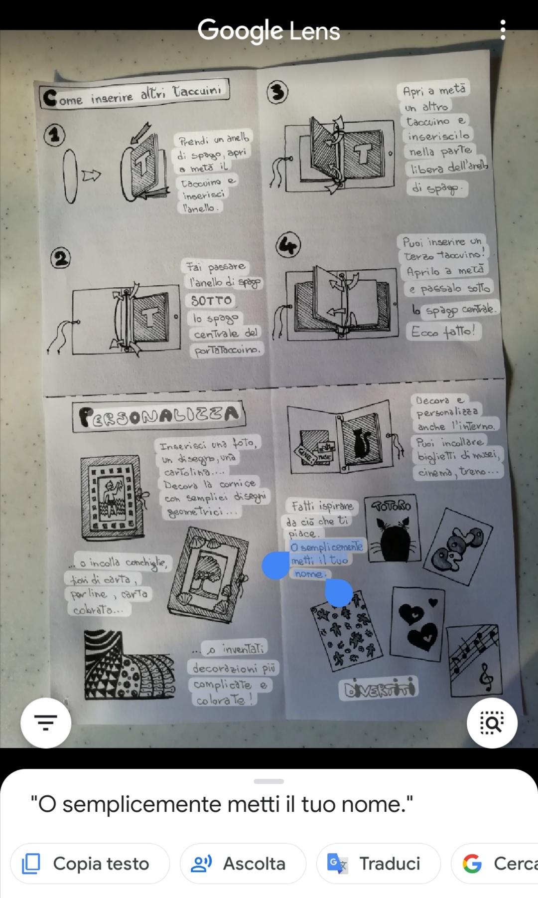 Google lens, che citavo, utilizza l'ocr e individua piuttosto bene tutto il testo anche scritto a mano presente in una foto, con la possibilità di selezionarlo e copiarne il contenuto, in modo da poterlo incollare in un altro documento di testo (un word processor ad esempio).