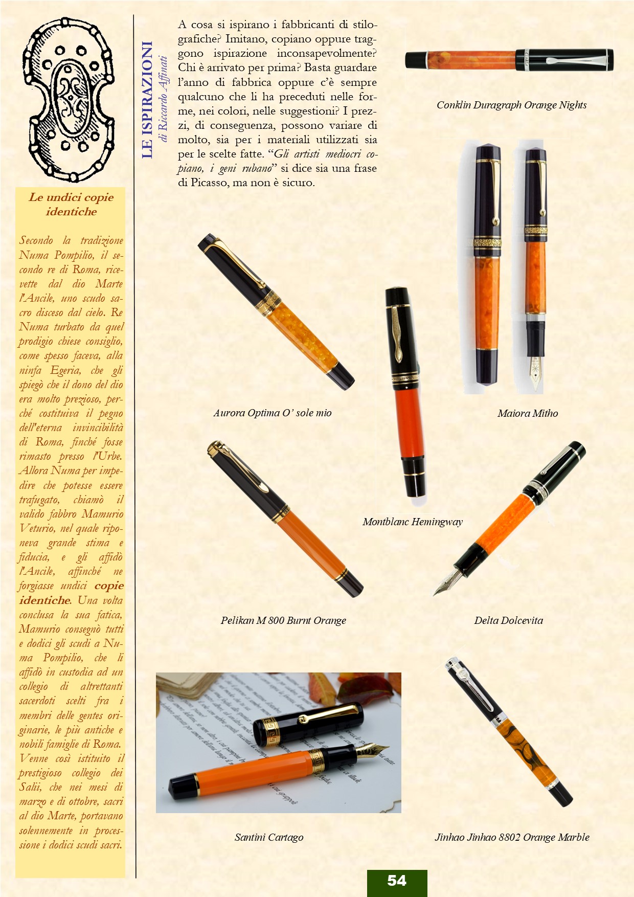 A cosa si ispirano i fabbricanti di stilografiche? Imitano, copiano oppure traggono ispirazione inconsapevolmente? Chi è arrivato per prima? Basta guardare l’anno di fabbrica oppure c’è sempre qualcuno che li ha preceduti nelle forme, nei colori, nelle suggestioni? I prezzi, di conseguenza, possono variare di molto, sia per i materiali utilizzati sia per le scelte fatte. “Gli artisti mediocri copiano, i geni rubano” si dice sia una frase di Picasso, ma non è sicuro.