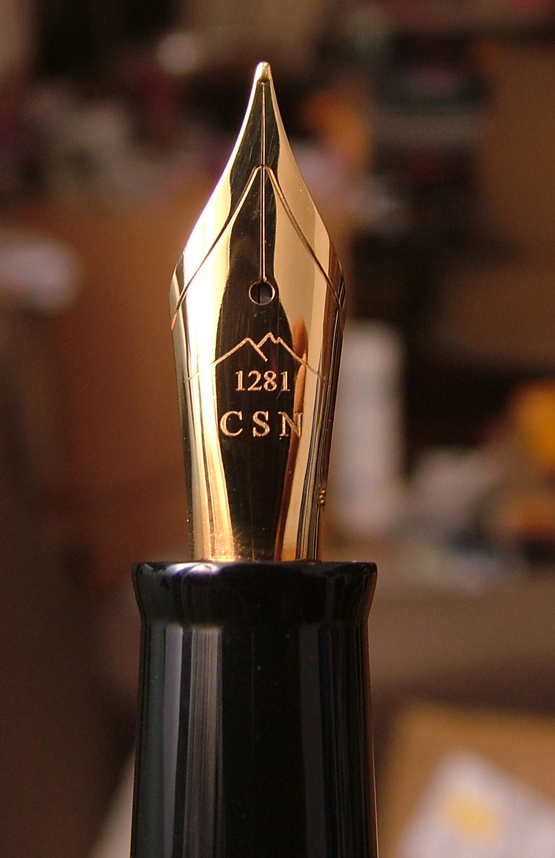 Penna a pistone ricavata da barra piena, con incisione sul fusto del CSN, sul pennino oltre CSN è presente il nostro simbolo "il vesuvio" e la sua altezza.