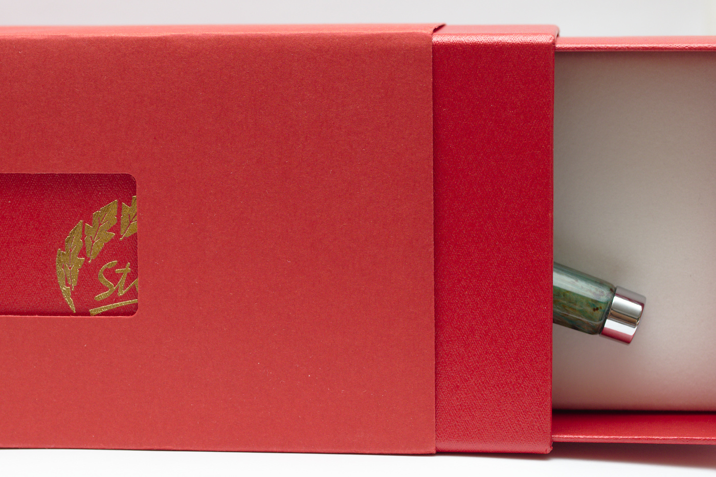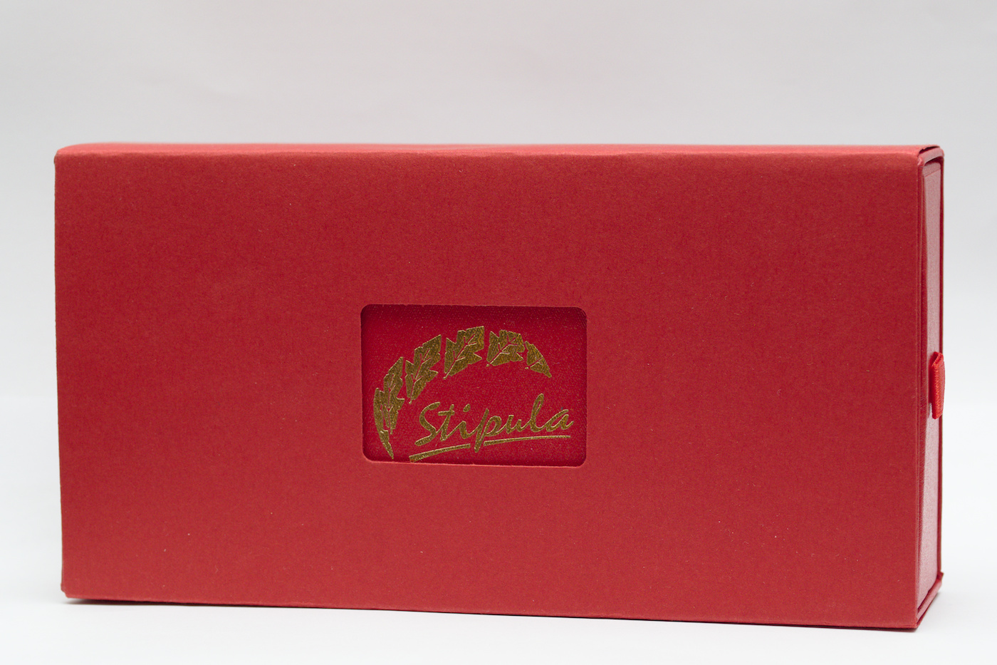 La penna arriva in una bella confezione in carta telata rossa, dall'aspetto pratico ma anche funzionale. Sicuramente non è un imballaggio costoso, ma fa la sua figura. Una volta estratto il cuscinetto interno su cui poggia la penna, si può usare come astuccio rigido o portaoggetti. A me piace.