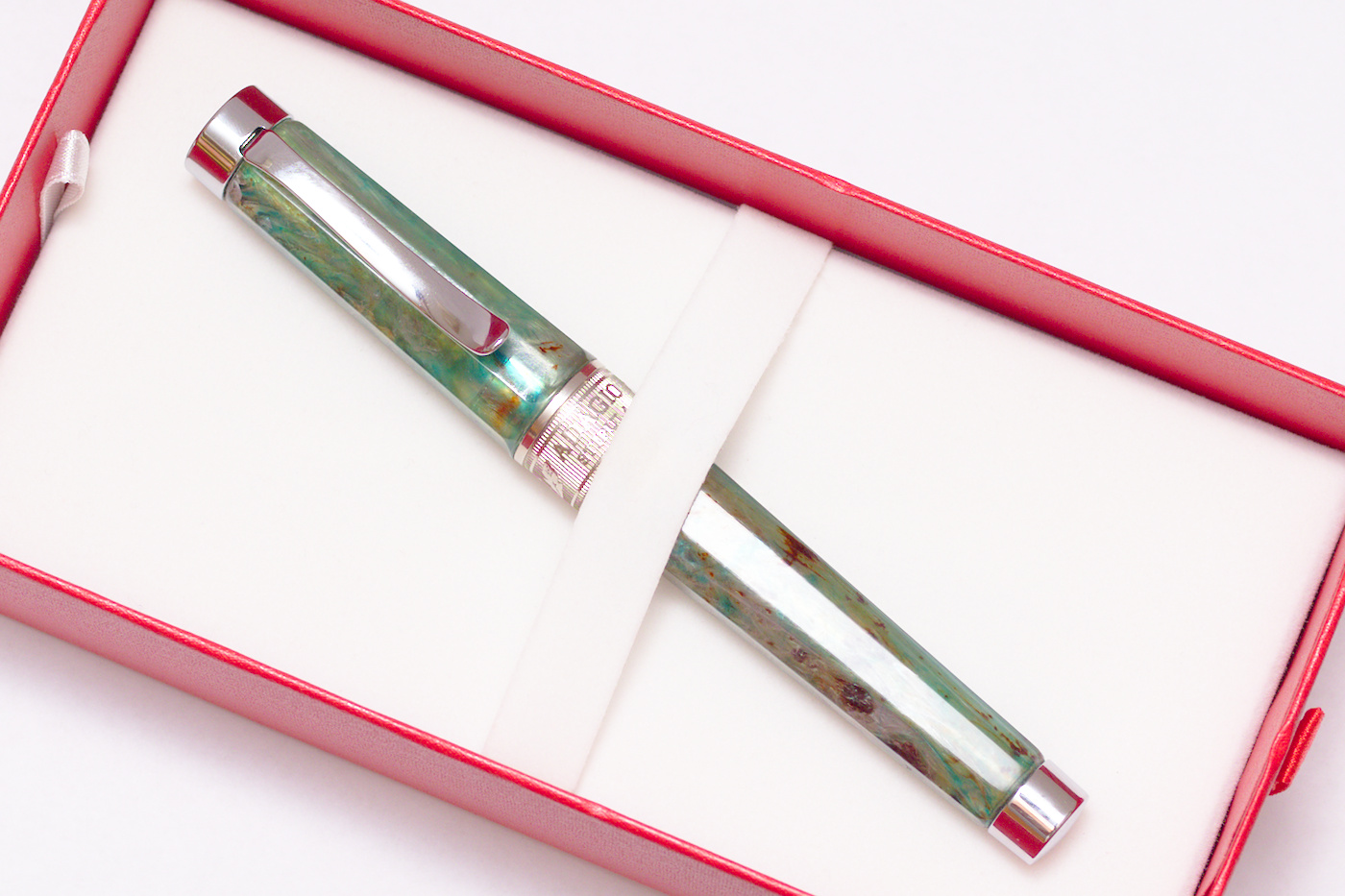 Due cose caratterizzano questa penna: la resina cangiante e l'uso del metallo per sezione e terminali.
