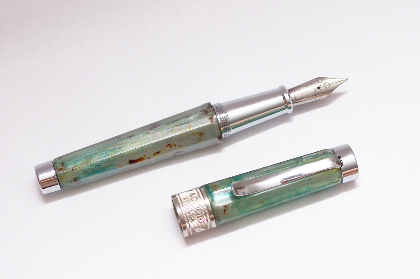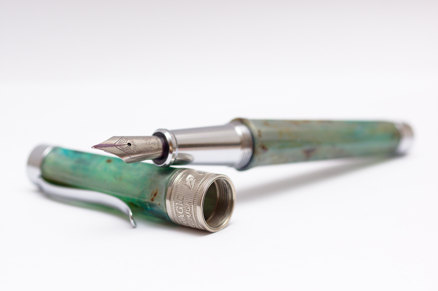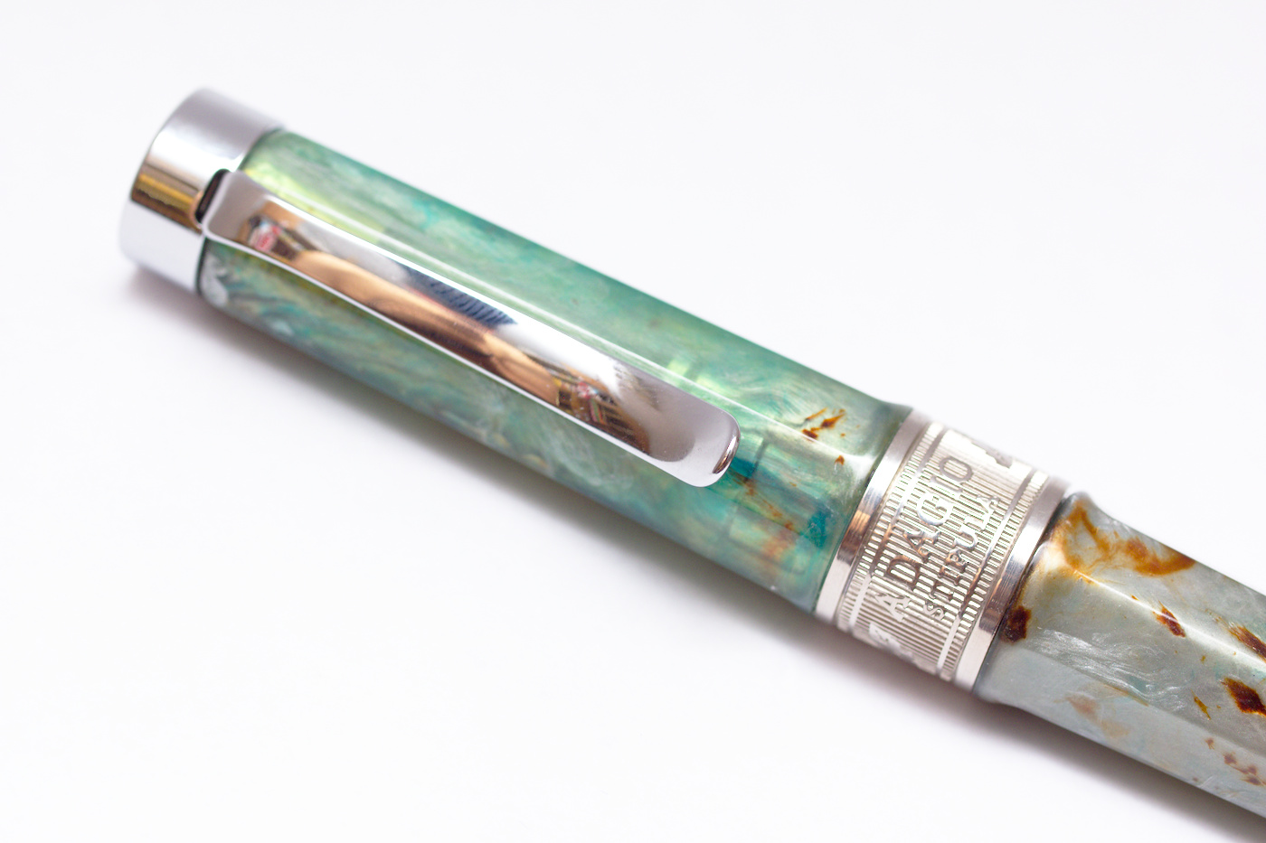 La resina, proposta in tre tonalità (un blu intenso, un giallo ambrato spiccatamente trasparente e questo verde acqua) a me piace molto perché è rigida, lucida, cangiante, molto variegata con un aspetto lattescente e una certa trasparenza. Nel mio esemplare, però, il match fra la resina del cappuccio e quella del corpo non è perfetto: la prima è decisamente più verde e trasparente, la seconda più lattiginosa e opaca...
