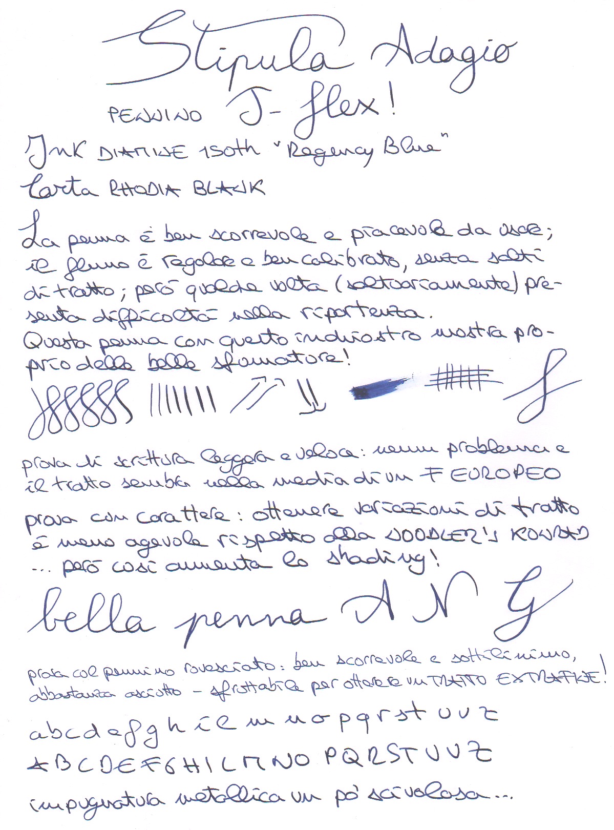 La variazione di tratto c'è tutta, anche se bisogna impegnarsi un po' per ottenerla. Il flusso è misurato e molto costante, anche quando si flette: da questo punto di vista mi pare superiore alla Konrad, più incline sia ad andare in fame d'inchiostro che a fare l'annaffiatoio di quando in quando. Con l'Adagio è difficile avere problemi di trapasso o di spiumaggio, non ho mai notato un solo salto di tratto e il Regency Blue mostra un piacevole shading, di sicuro superiore rispetto alla OMAS 360 e alla Parker 45.