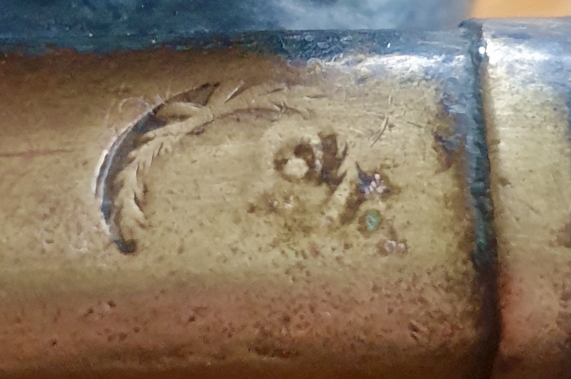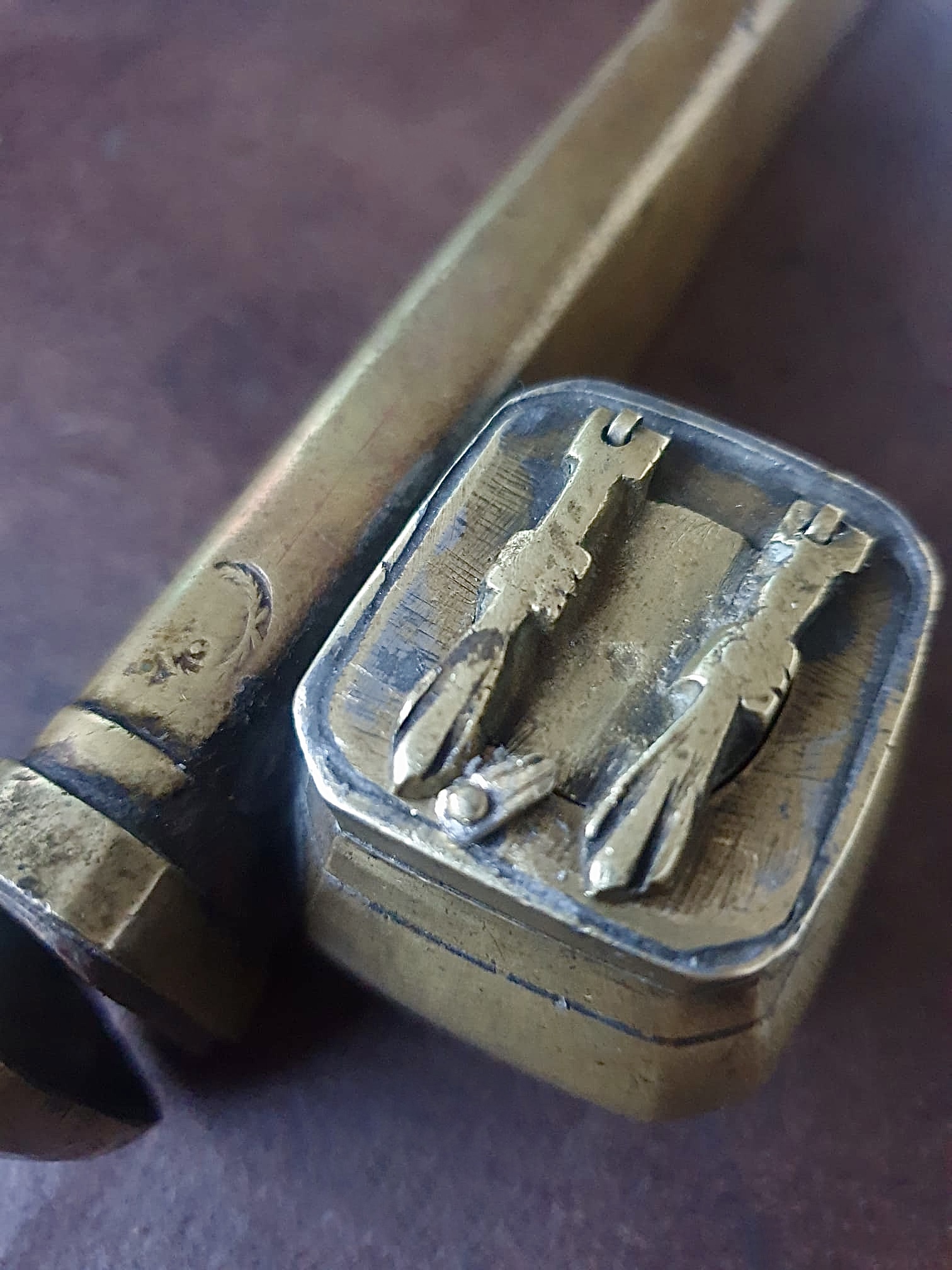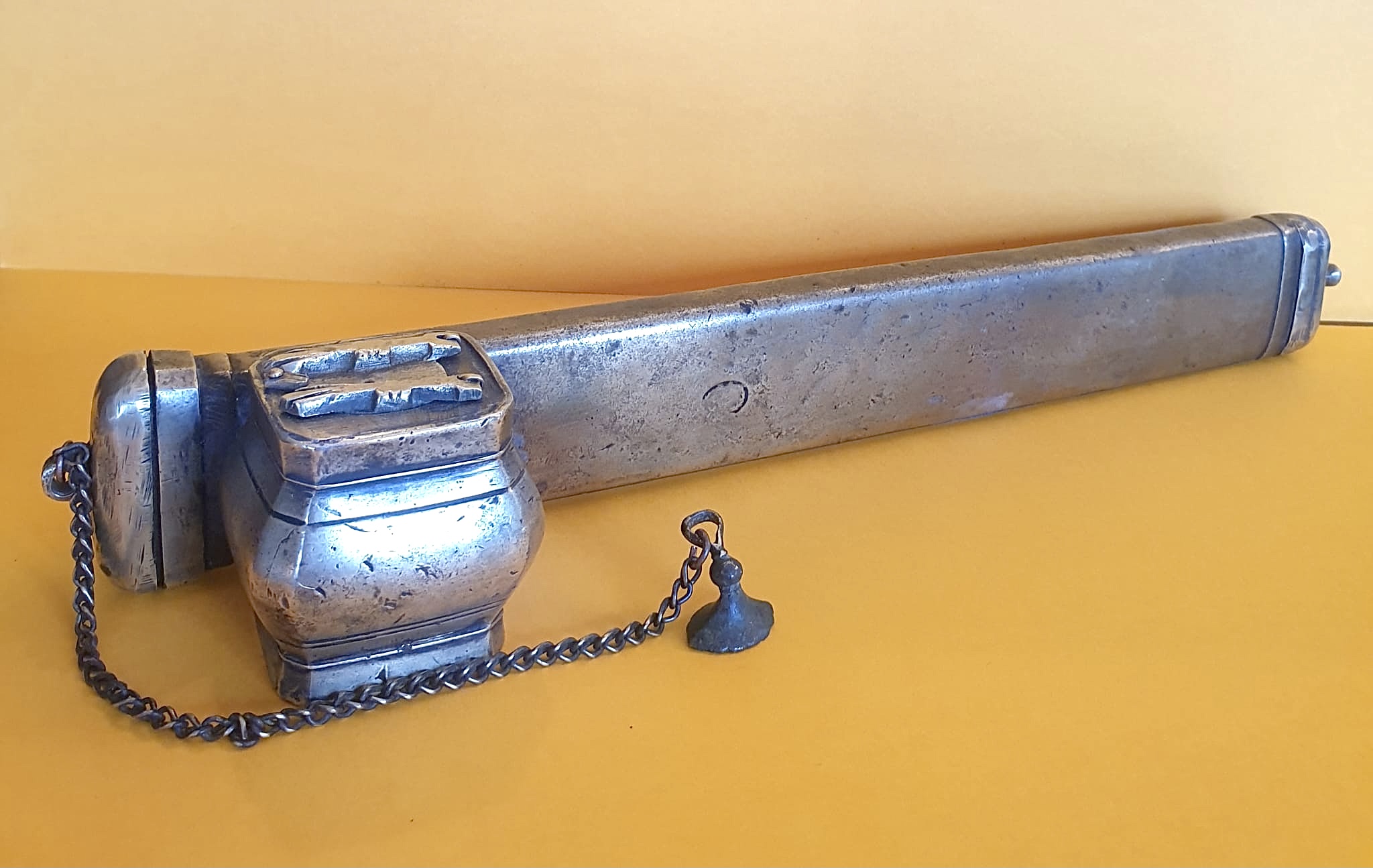 Qalamdan di area medio-orientale, lungo 28 cm e contrassegnato da punzoni di incerta decifrazione; completo di catenella con sigillo recante iscrizione in arabo antico. Se ci fosse qualche esperto, sarebbe gradito un aiuto per decifrare marchi e testo.