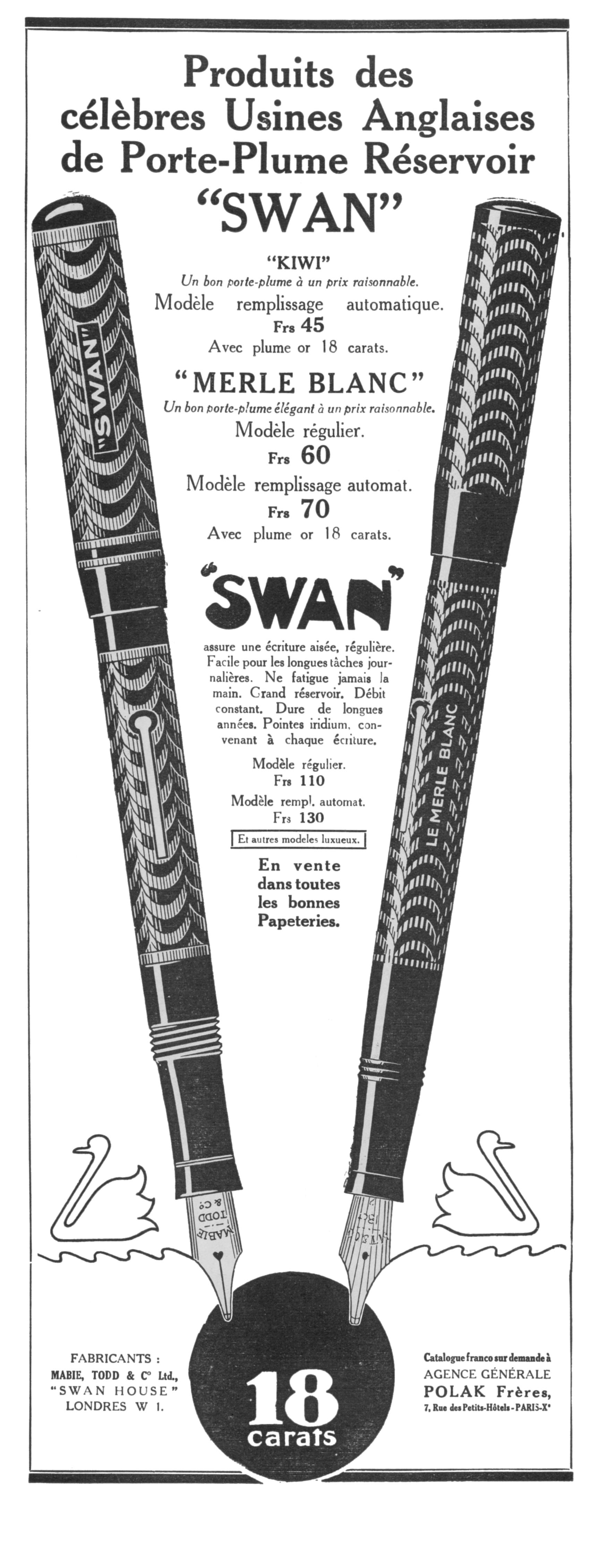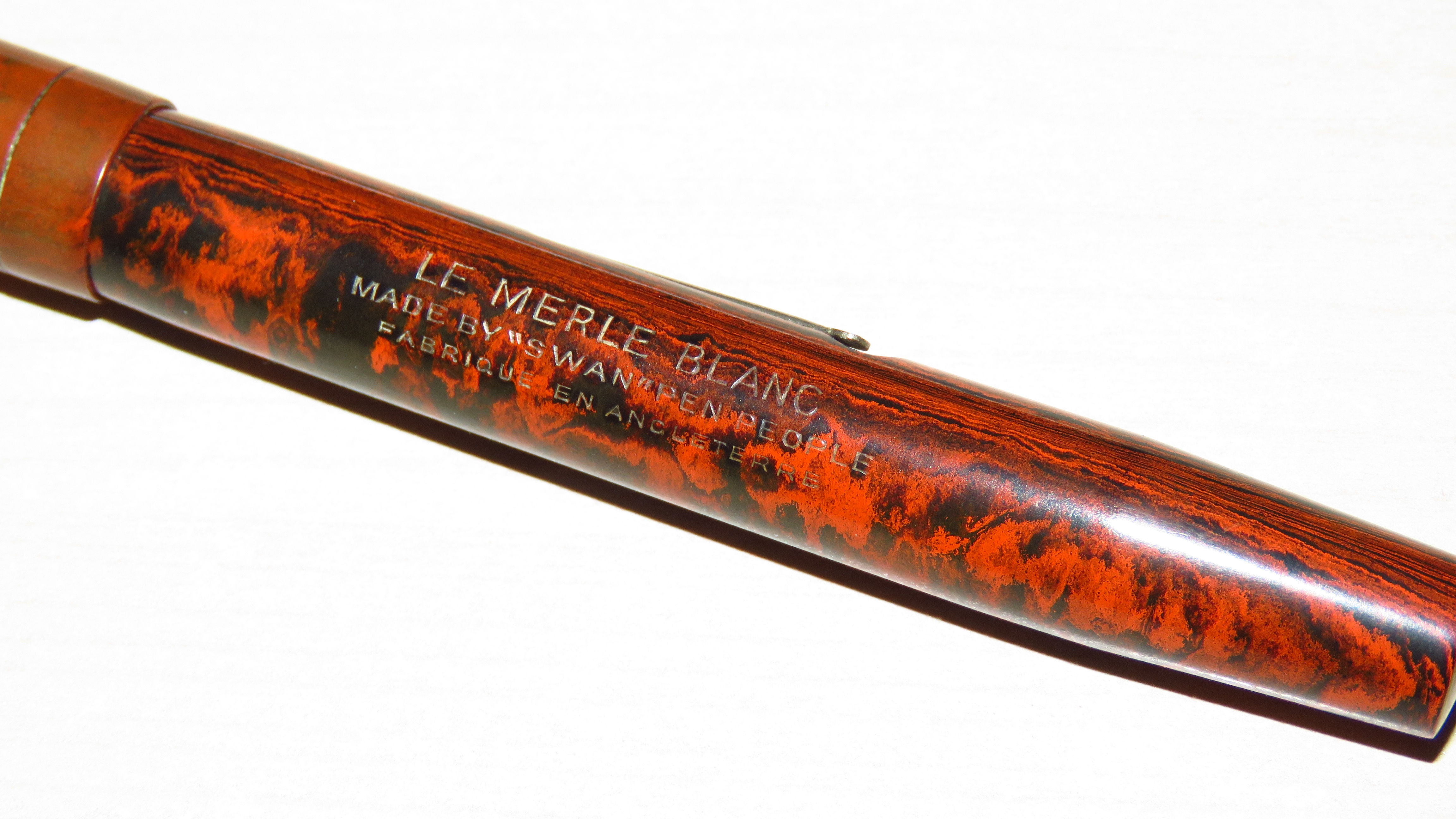 Di seguito è mostrata la consueta, ma meno comune iscrizione sul fusto "Made by 'Swan' Pen People" che sormonta, al rigo inferiore, la dicitura in lingua francese "Fabrique en Angleterre".