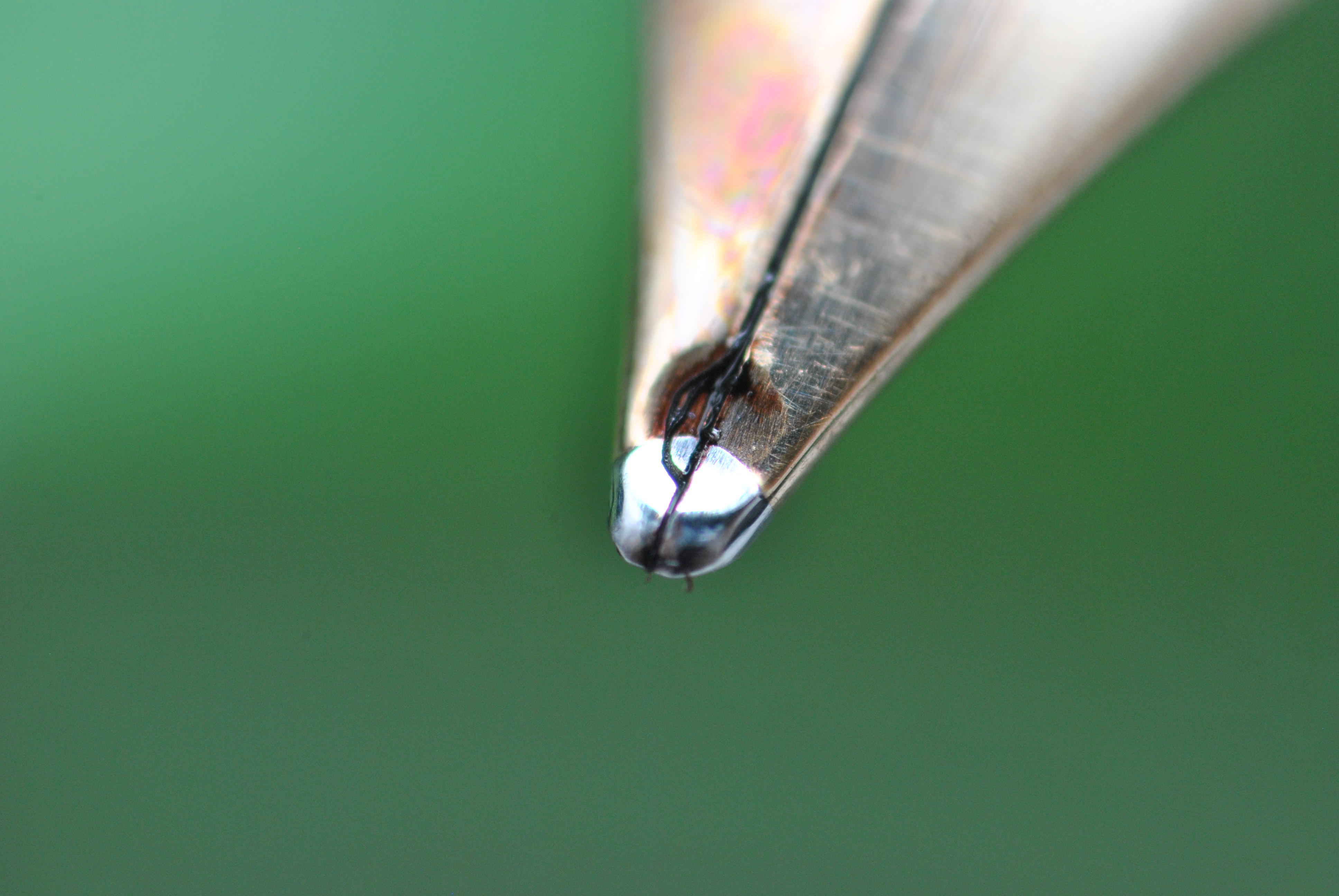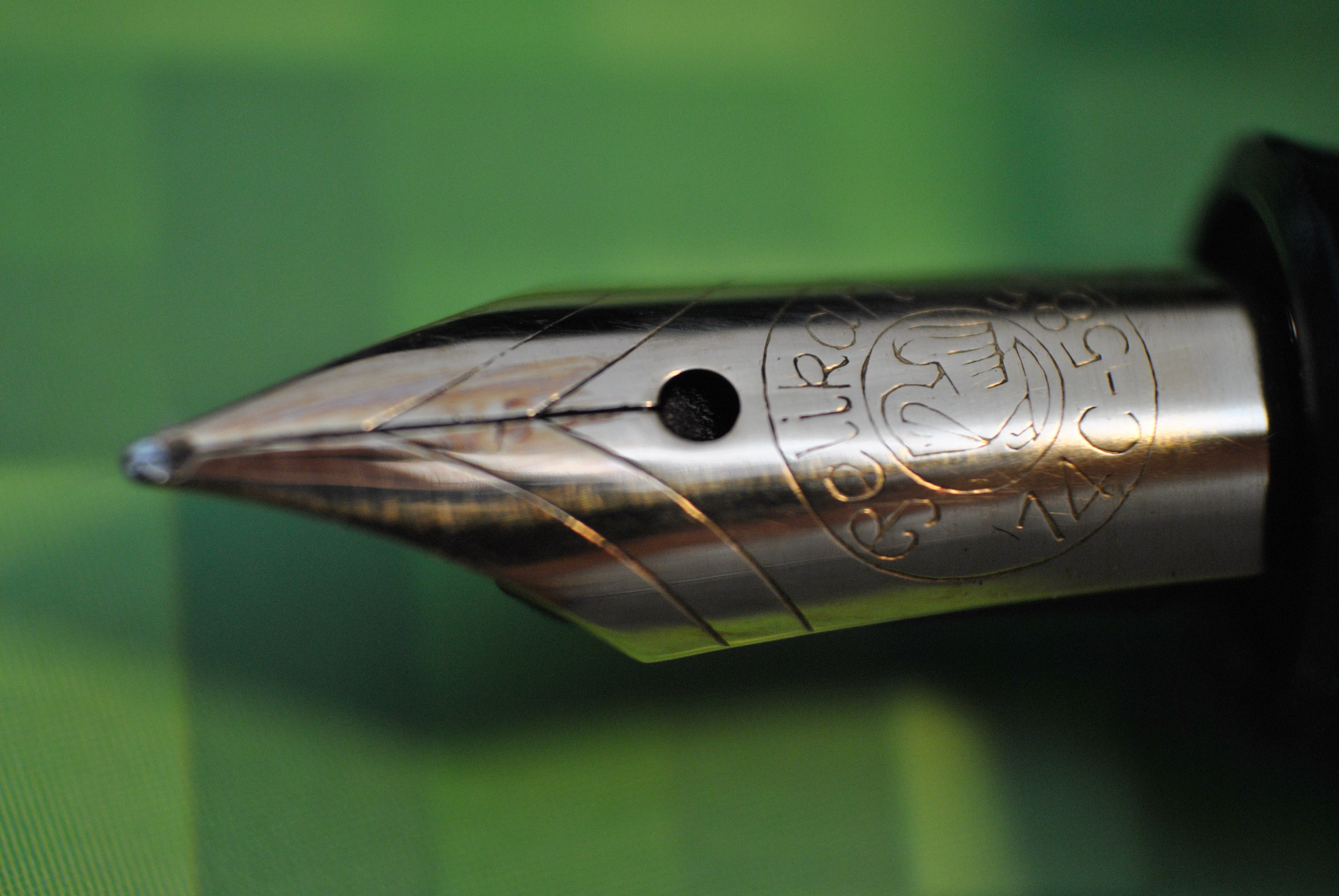 Dopo averlo analizzato sotto la luce ho notato che l’unica era una certa distorsione della luce riflessa in una banda che correva dal foro d’aereazione alla spalla del rebbo destro. Questo indicava una piegatura difficilmente avvertibile diversamente, probabilmente dovuta ad una piega più pronunciata riparata male. Il fatto che il pennino grattasse adesso aveva senso: non era un problema di punta, ma di geometria del pennino.