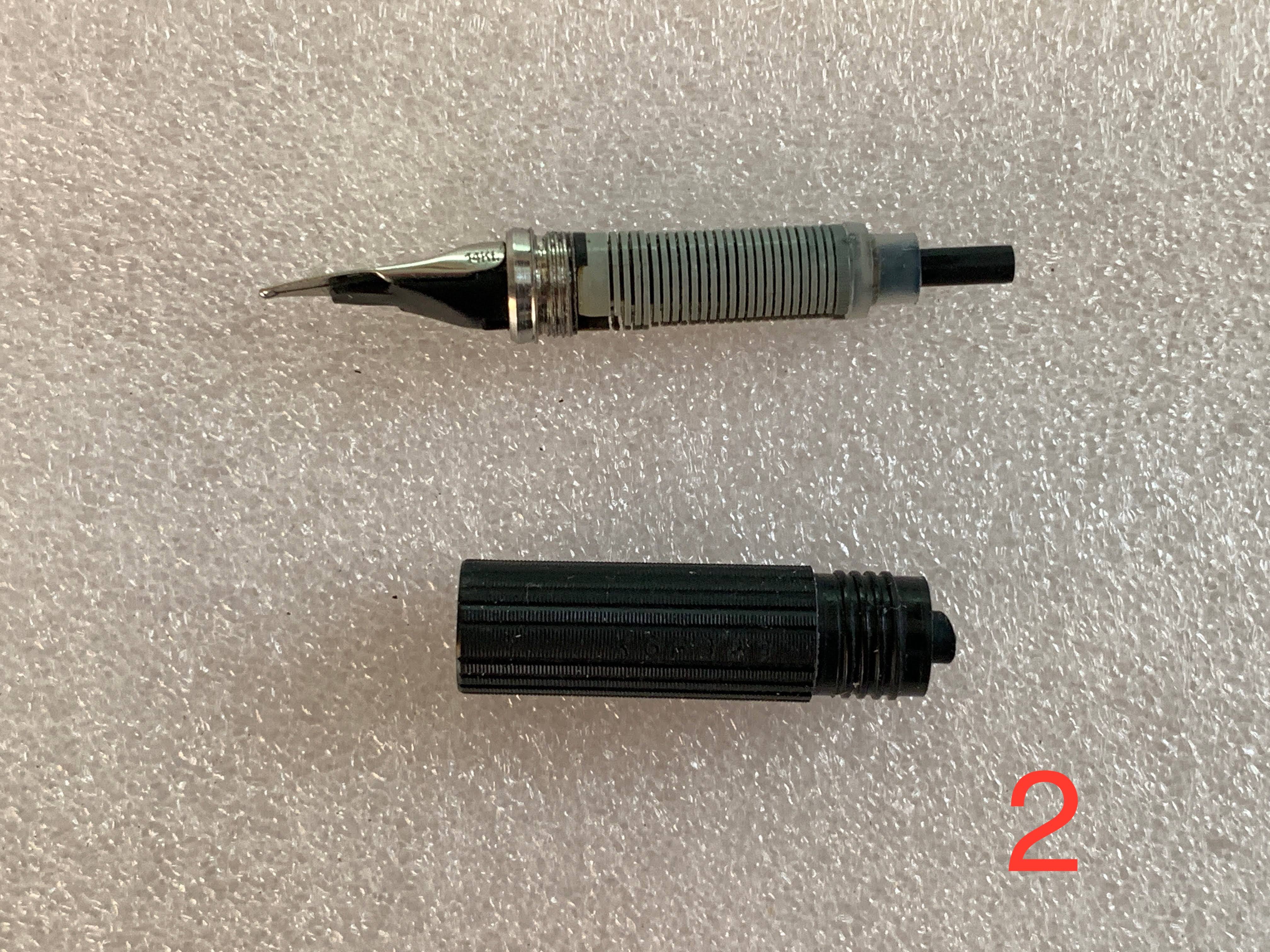 Per pulirla a fondo ho anche provato a sfilare l’alimentatore dalla sezione che alla fine è uscito (foto 2): a un certo punto ha dato la sensazione che ci fosse un qualche sigillante che ha smesso di fare attrito. Ha cominciato a lasciarsi svitare opponendo sempre meno resistenza fino a che non ne ha fatta più. Ora “ruota che è una bellezza”… Ho letto di questo “problema” della Hastil, ma il mio pennino ora non sta proprio fermo e si muove anche mentre si scrive.