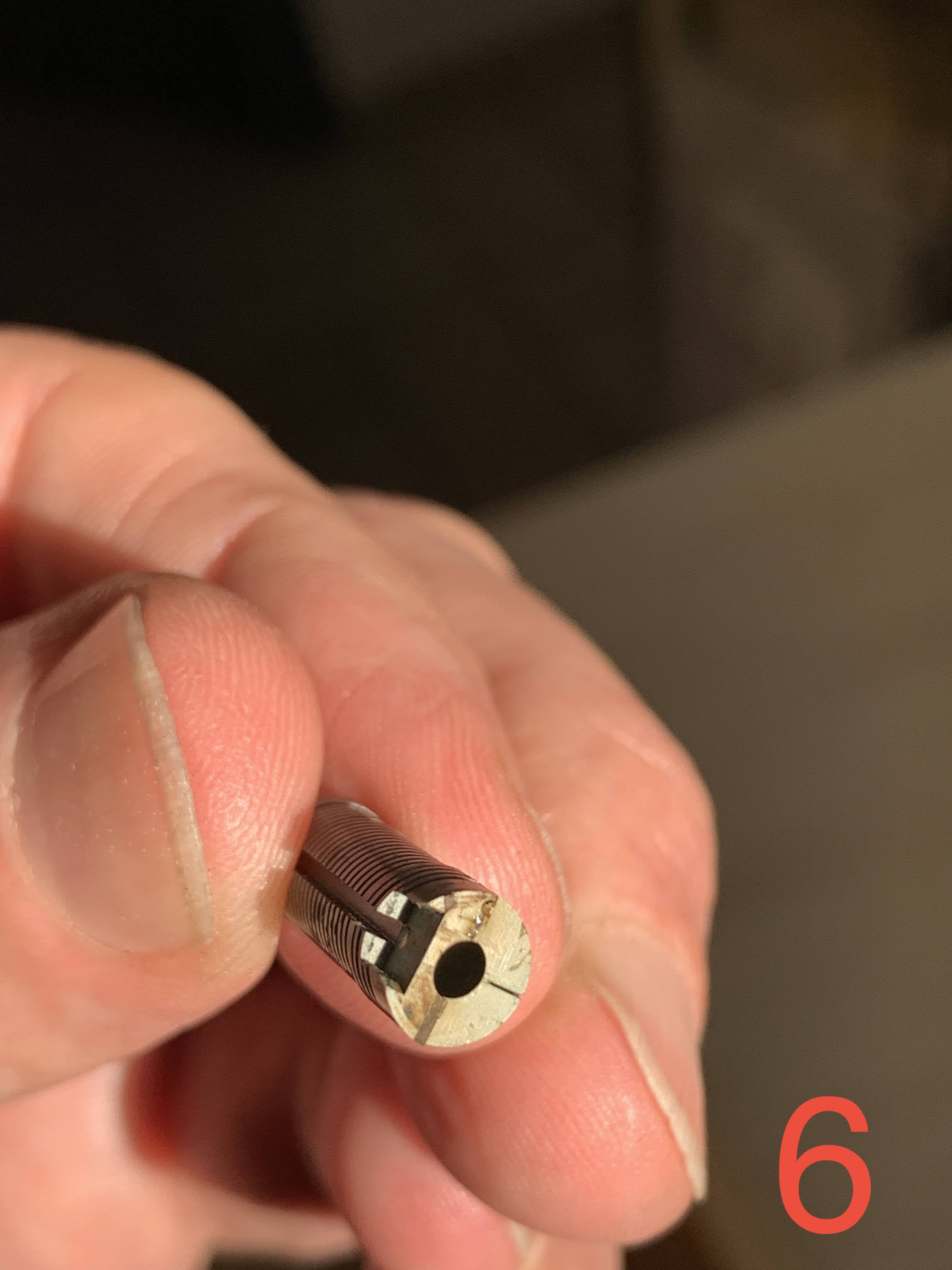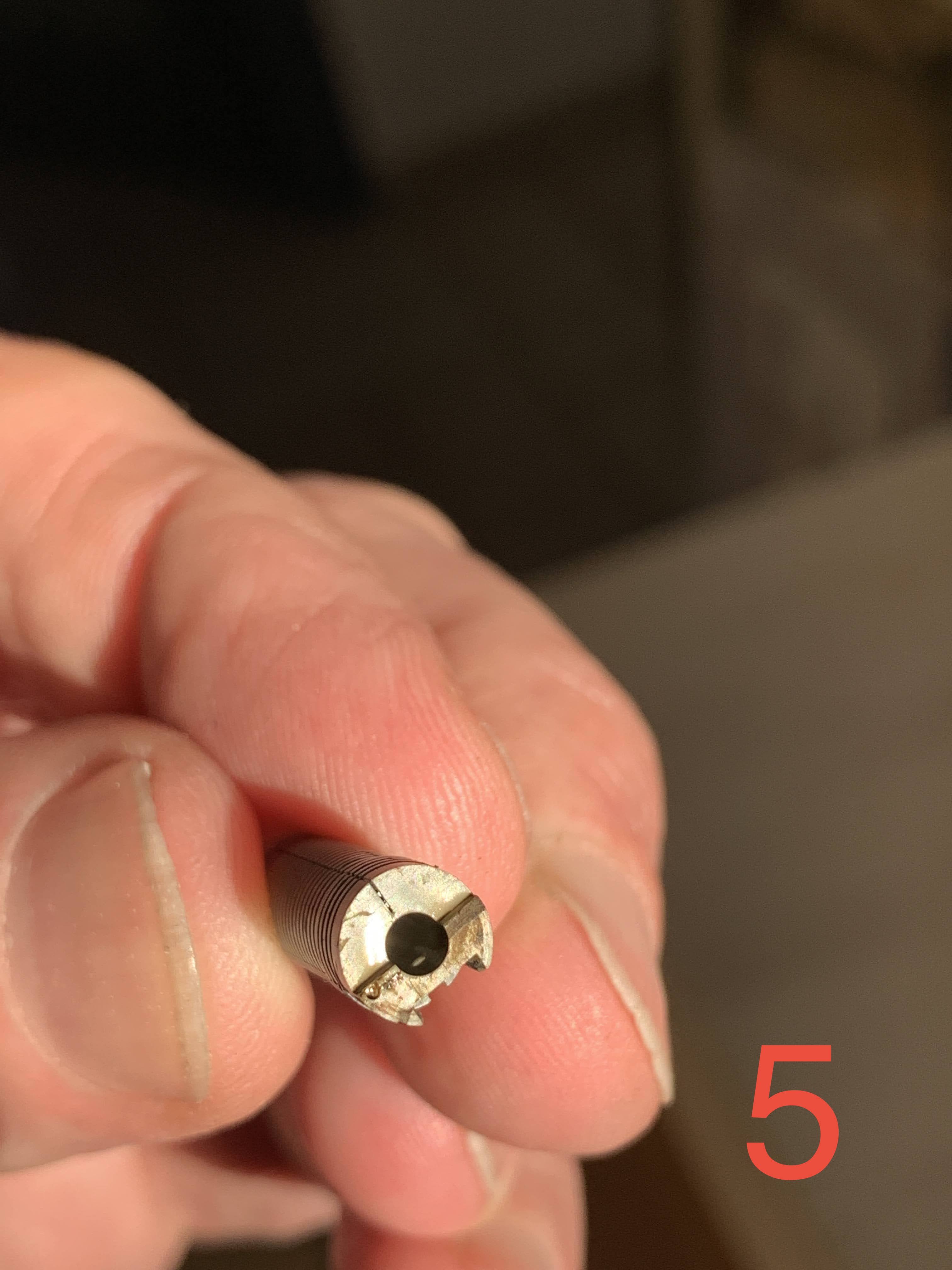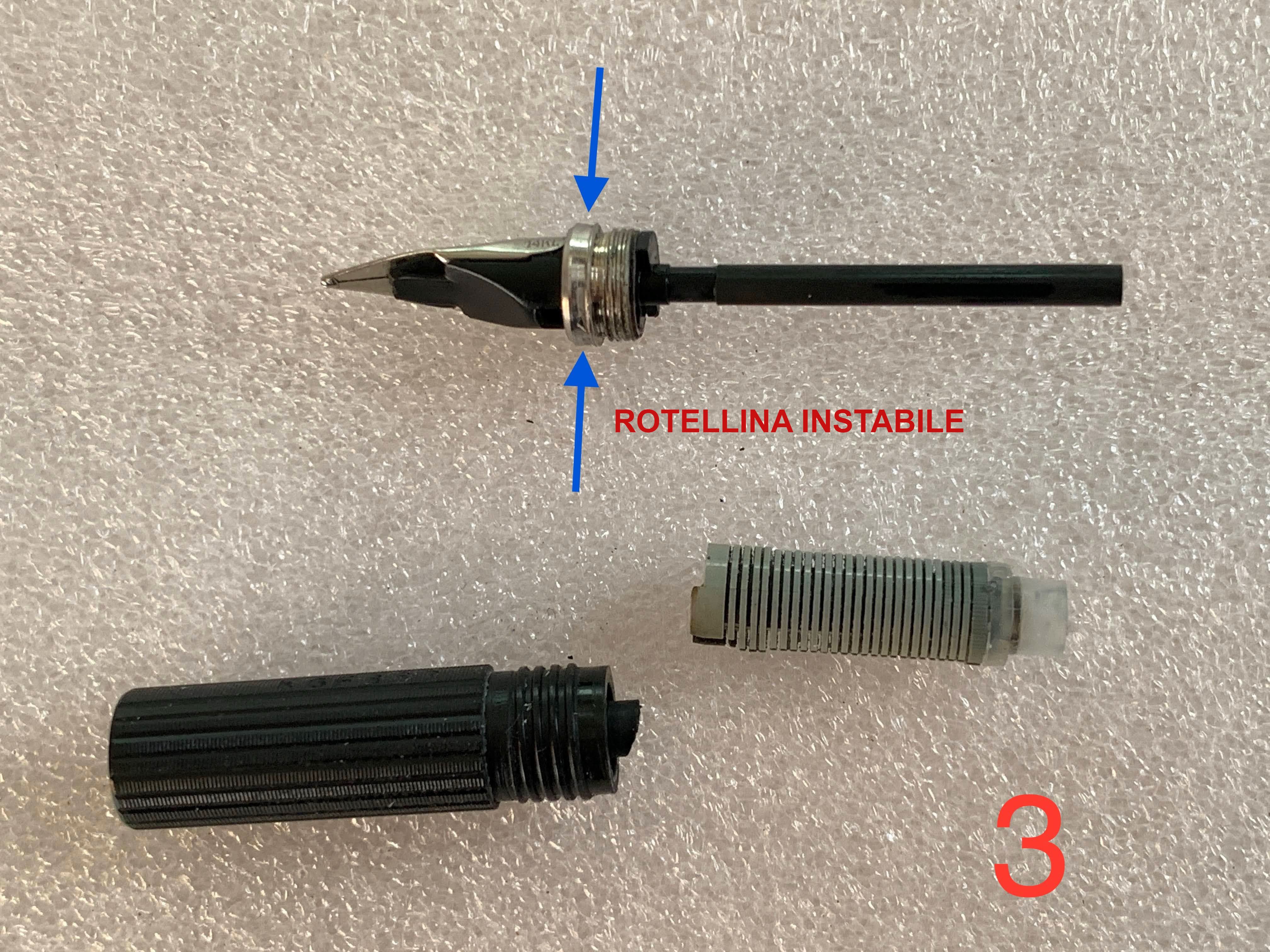 Non so se sia successo perché è stata troppo in bagno, ma l’asticciola col pennino si è sfilata praticamente da sola dall’alimentatore (foto 3), così mi sono potuto rendere conto che le “rotazioni maligne” sono due: