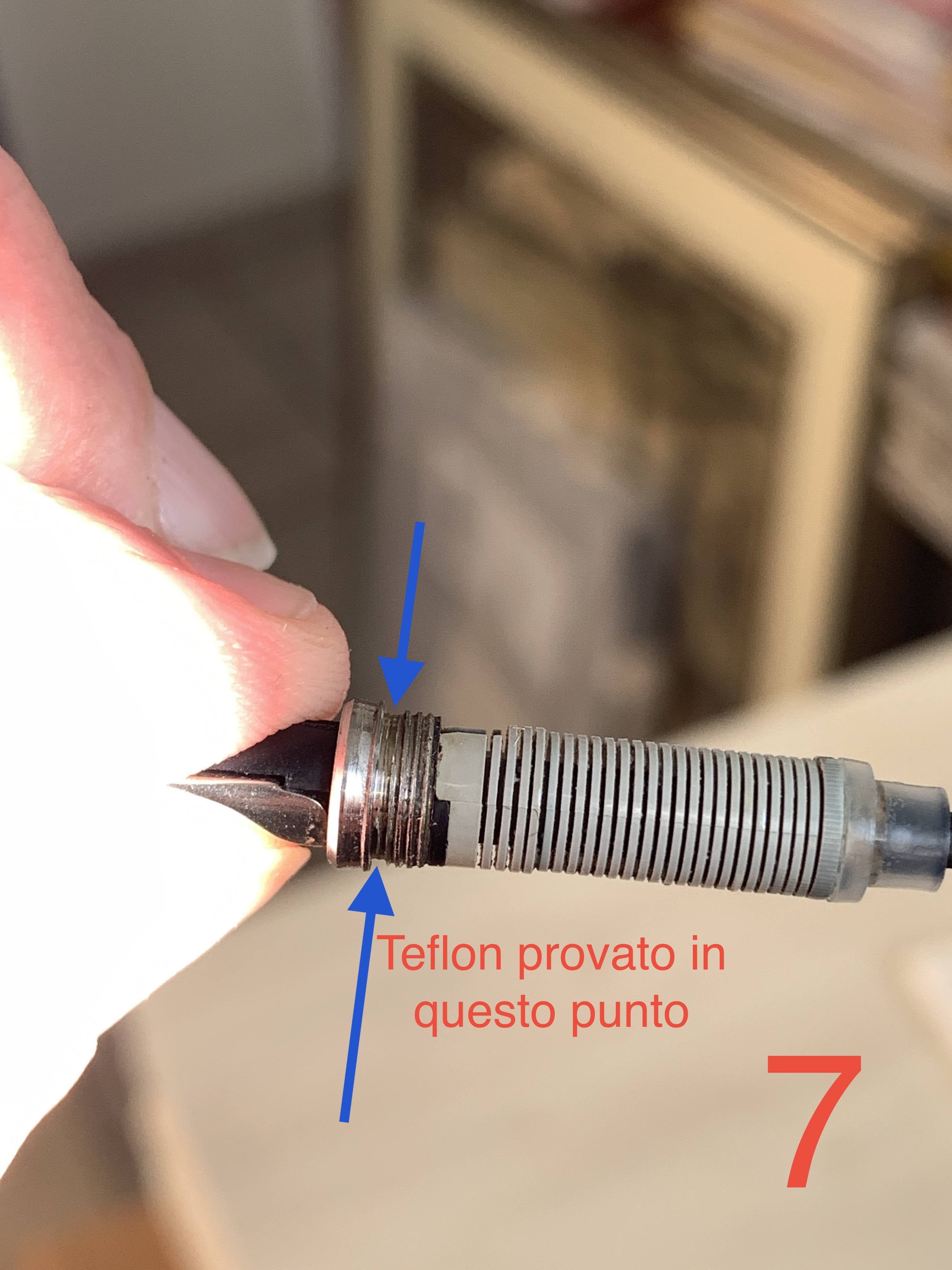 Nella foto 7 ho indicato il punto in cui avevo messo il teflon: non sulla filettatura, ma solo in quell’incavo fra la ghiera che ora gira e la filettatura. Che fare? Ho cercato qui sul forum e ho letto di alcuni sigillanti o dello smalto per unghie, ma visto che qui mi pare ci siano delle concause, prima di fare altre mosse sbagliate meglio chiedere a chi è più esperto.