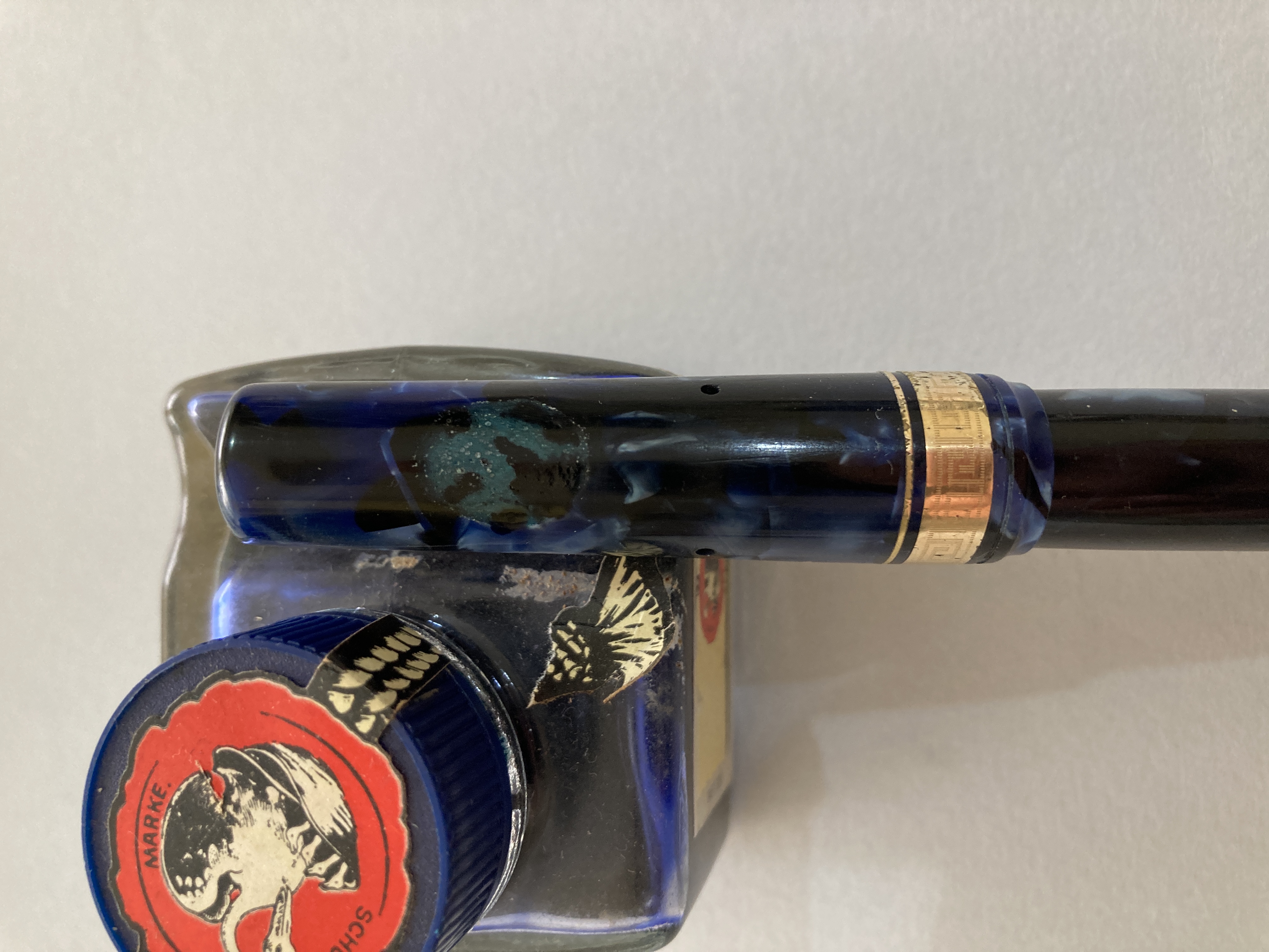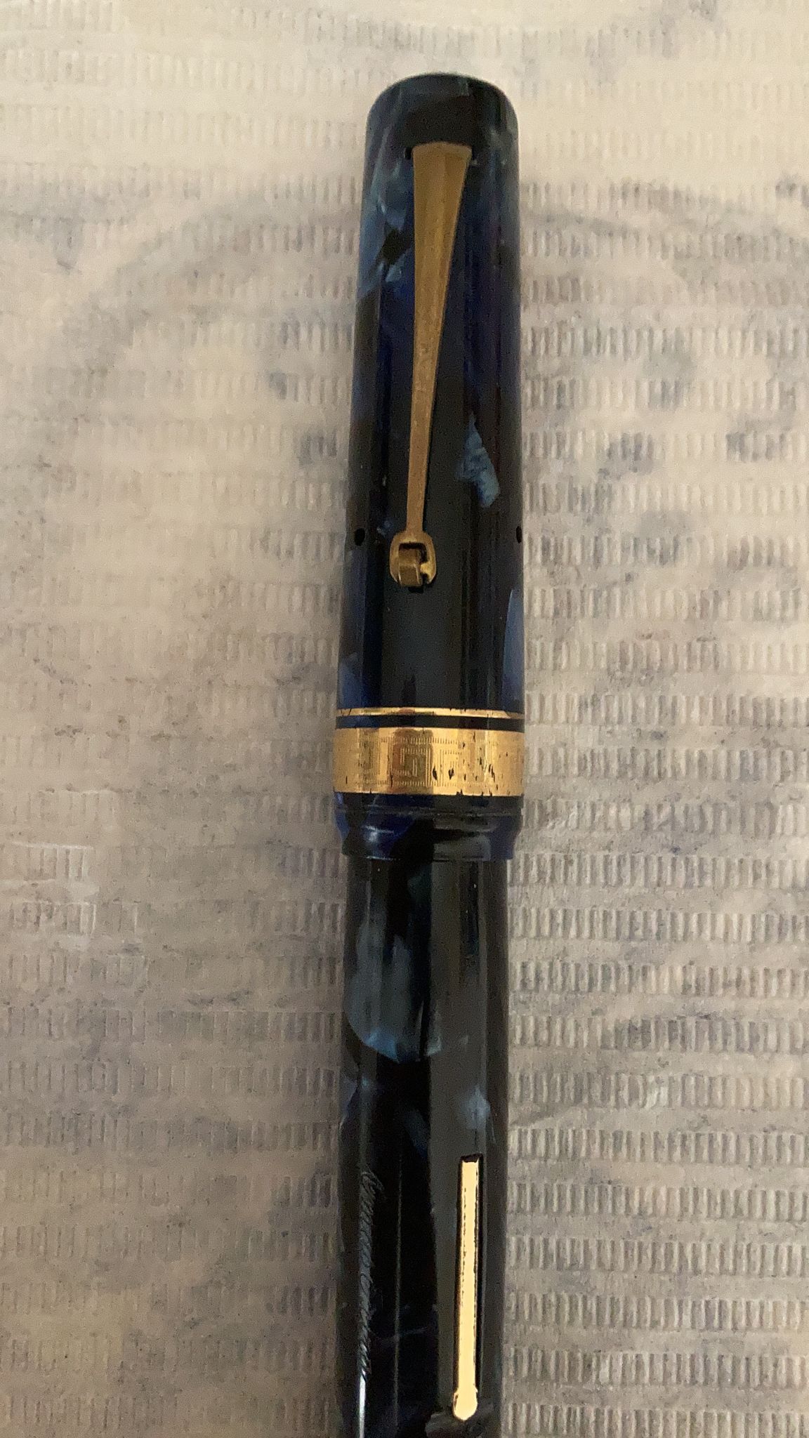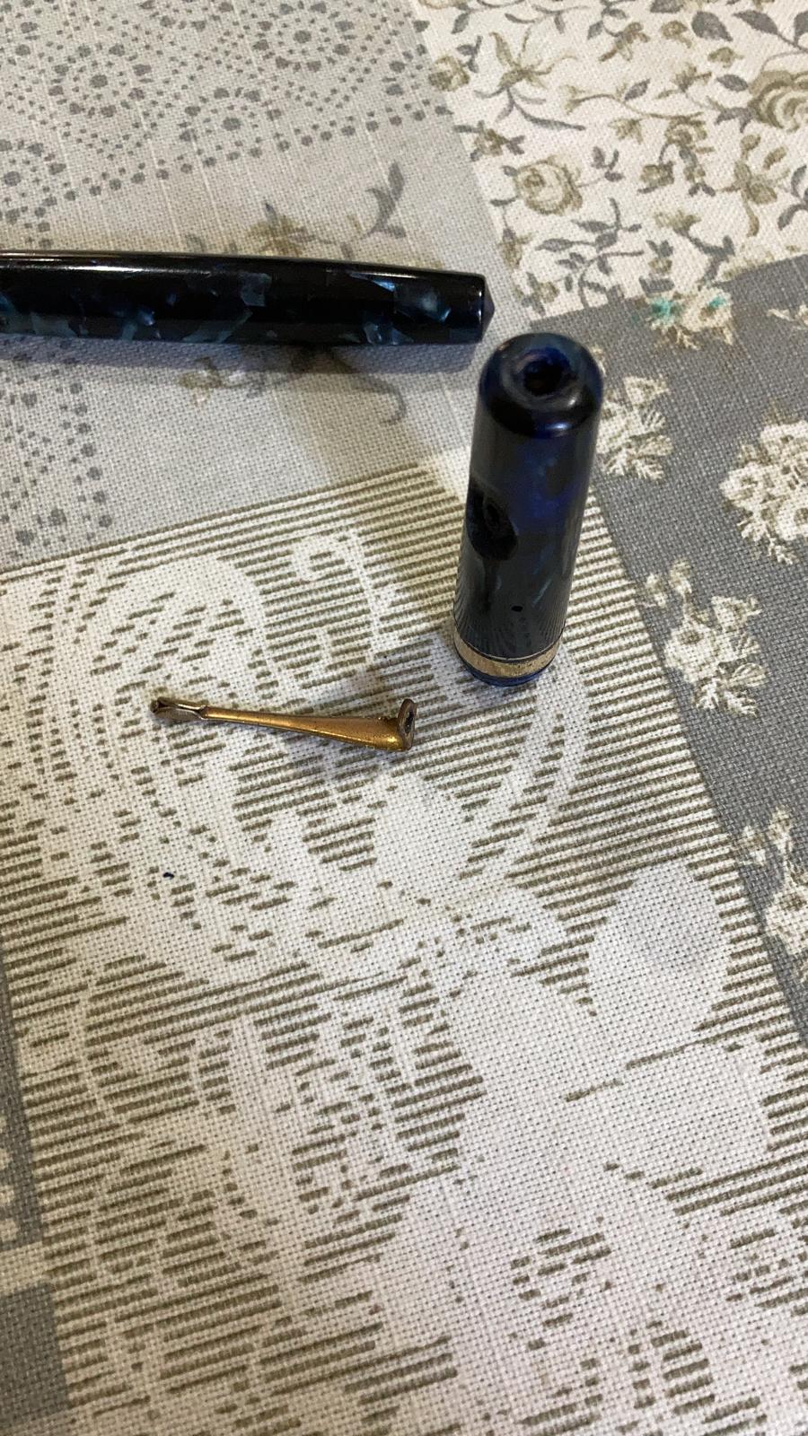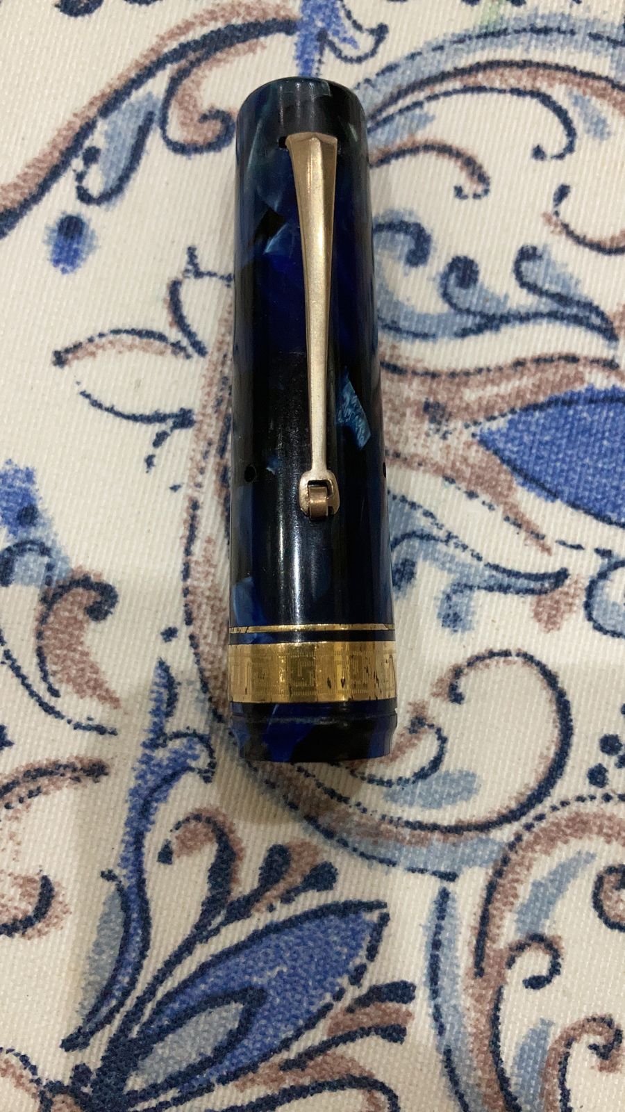 Ecco le foto della penna appena acquistata: Si possono immediatamente notare la bellezza della penna, la clip non originale, il gigantesco foro causato probabilmente da una sigaretta (o un sigaro, viste le dimensioni), e lo strano perno avvitato in cima per fissare la clip sostitutiva (quella originale probabilmente si era spezzata).
