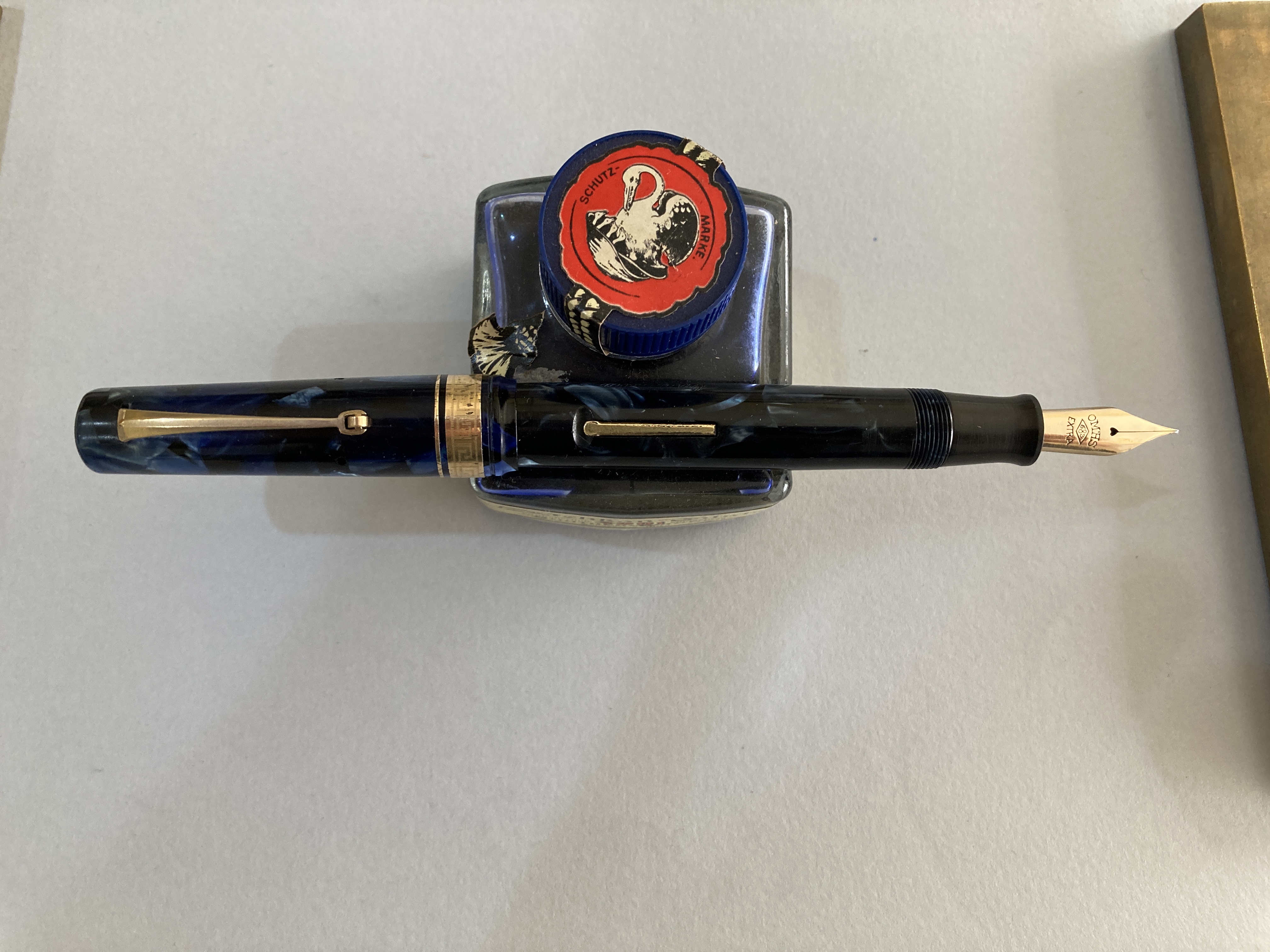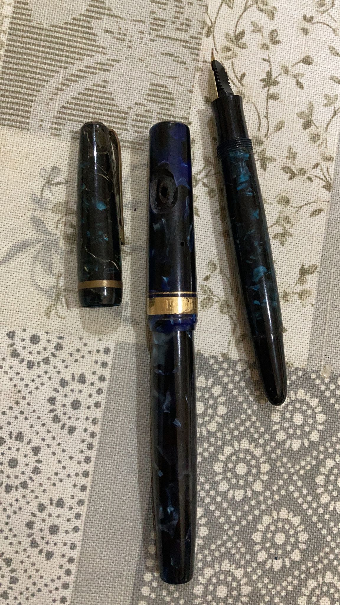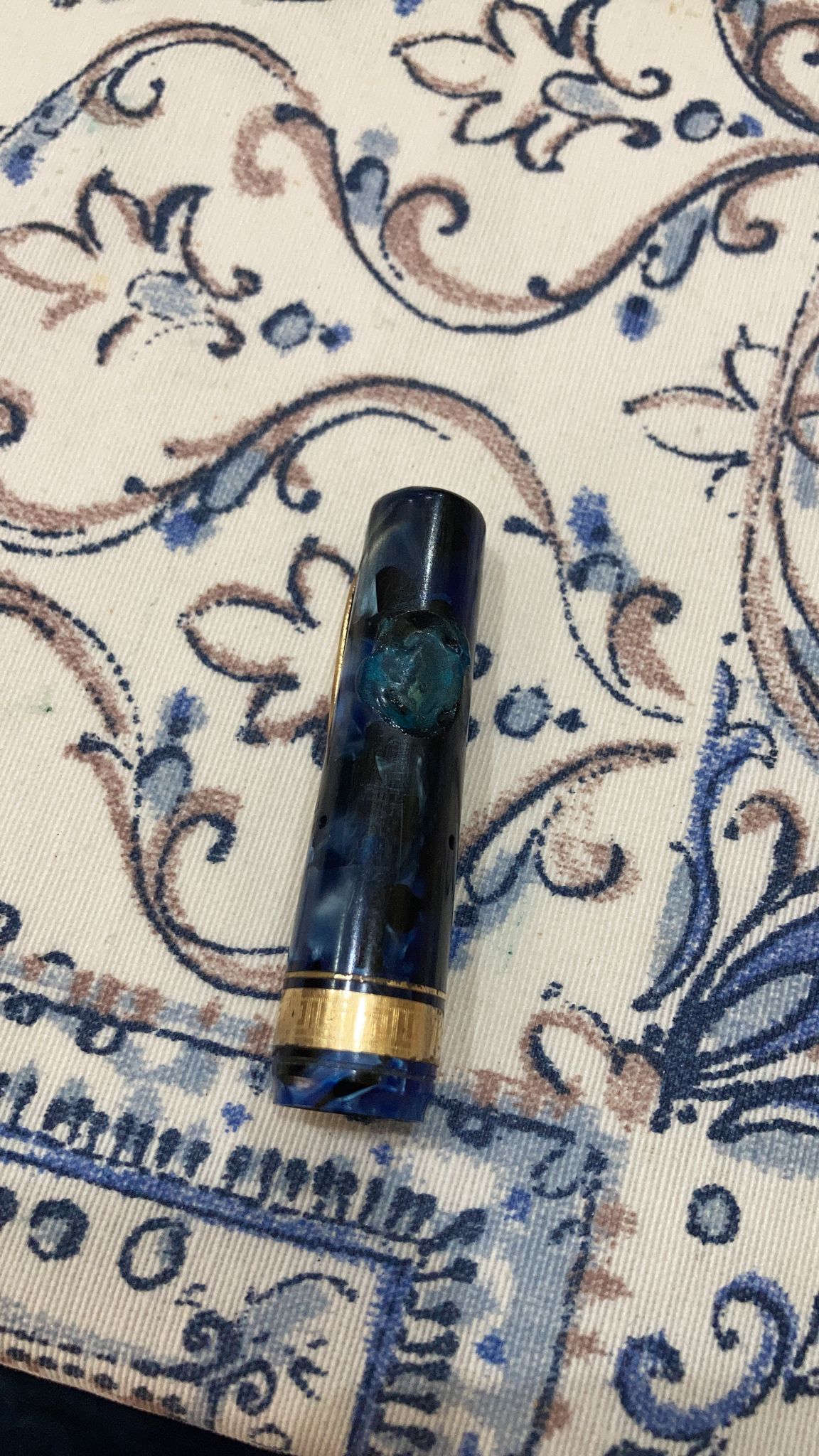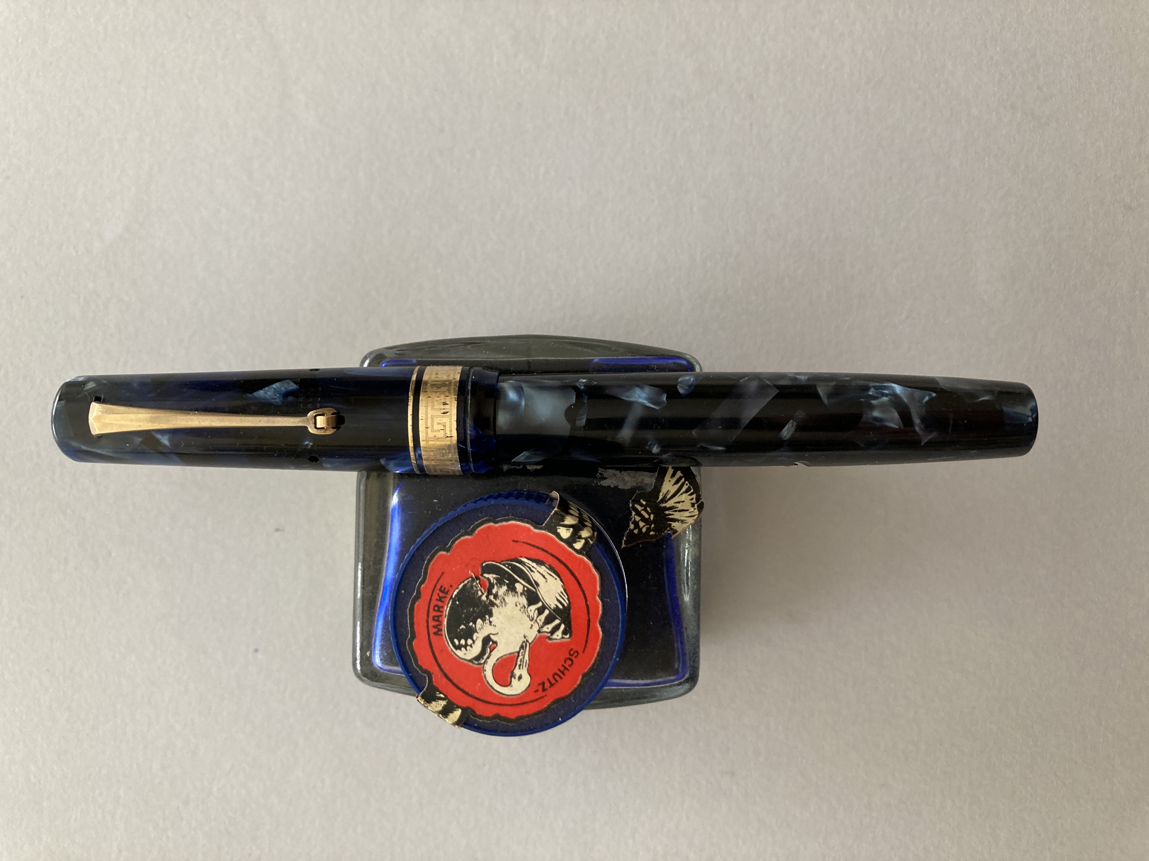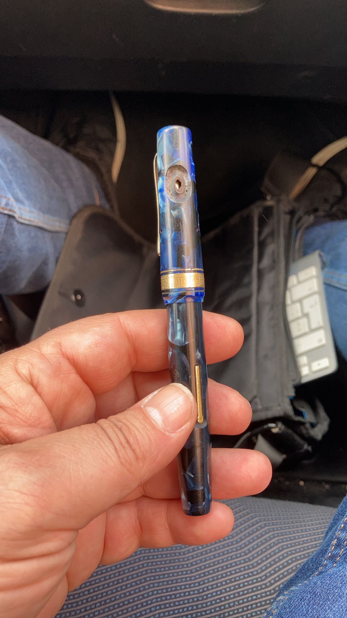 Ecco le foto della penna appena acquistata: Si possono immediatamente notare la bellezza della penna, la clip non originale, il gigantesco foro causato probabilmente da una sigaretta (o un sigaro, viste le dimensioni), e lo strano perno avvitato in cima per fissare la clip sostitutiva (quella originale probabilmente si era spezzata).