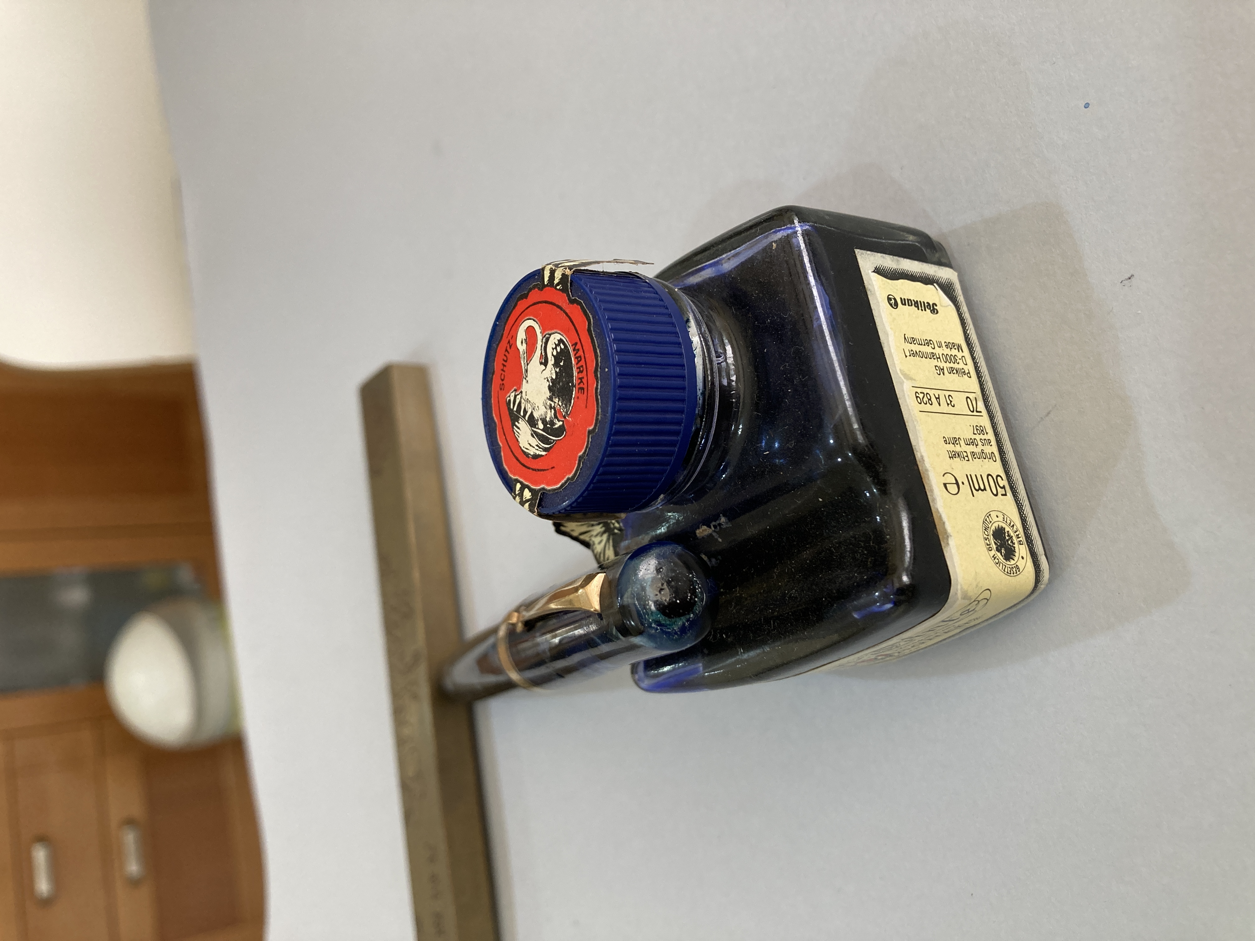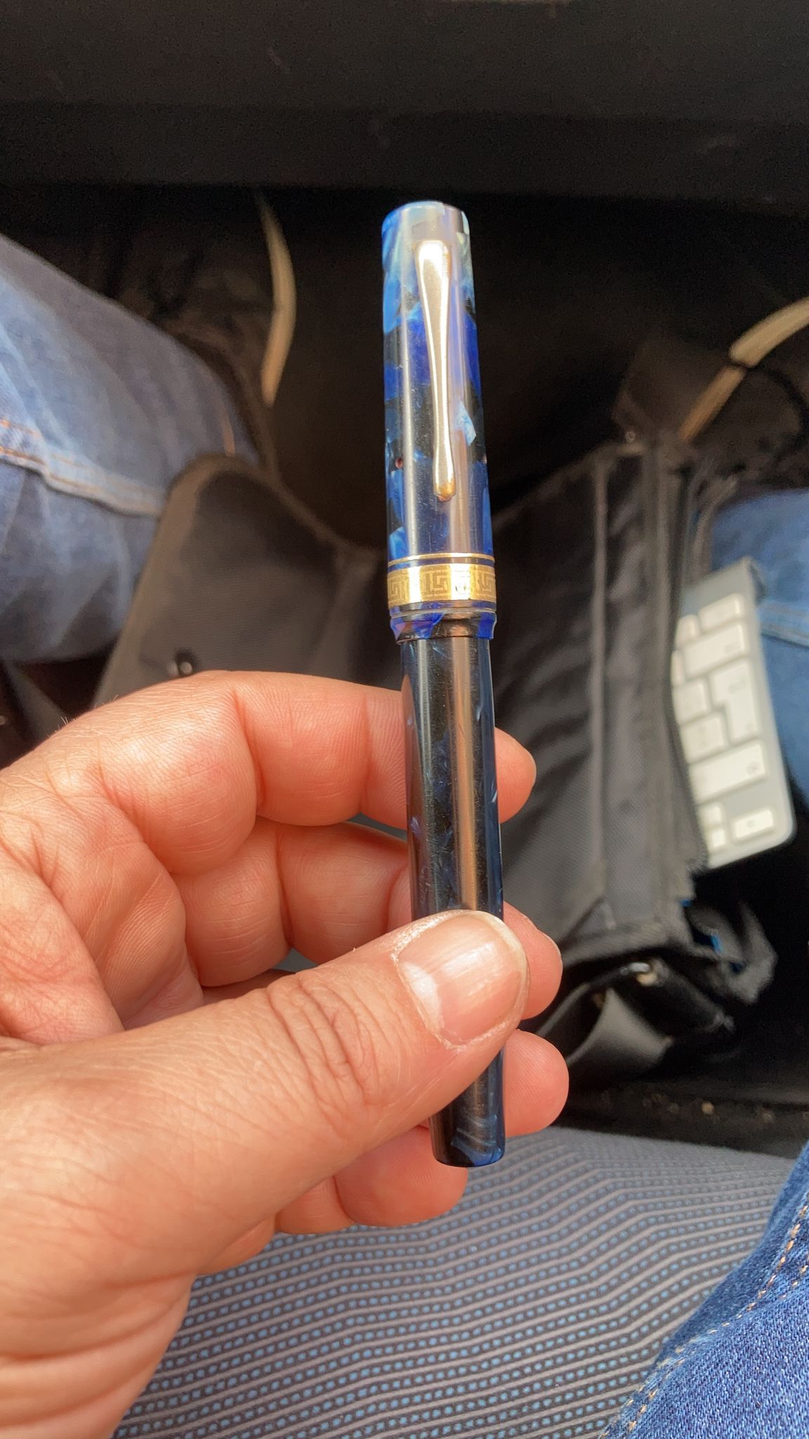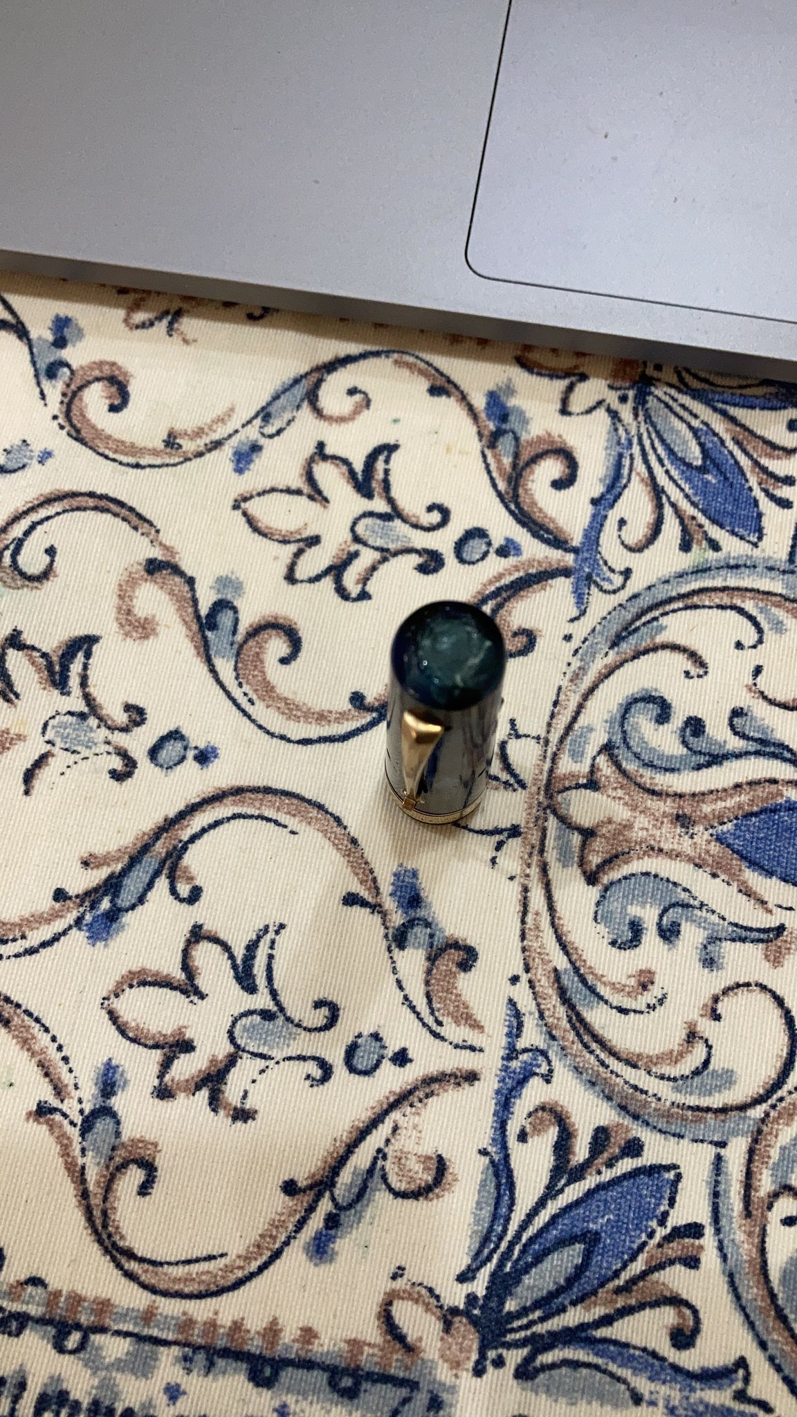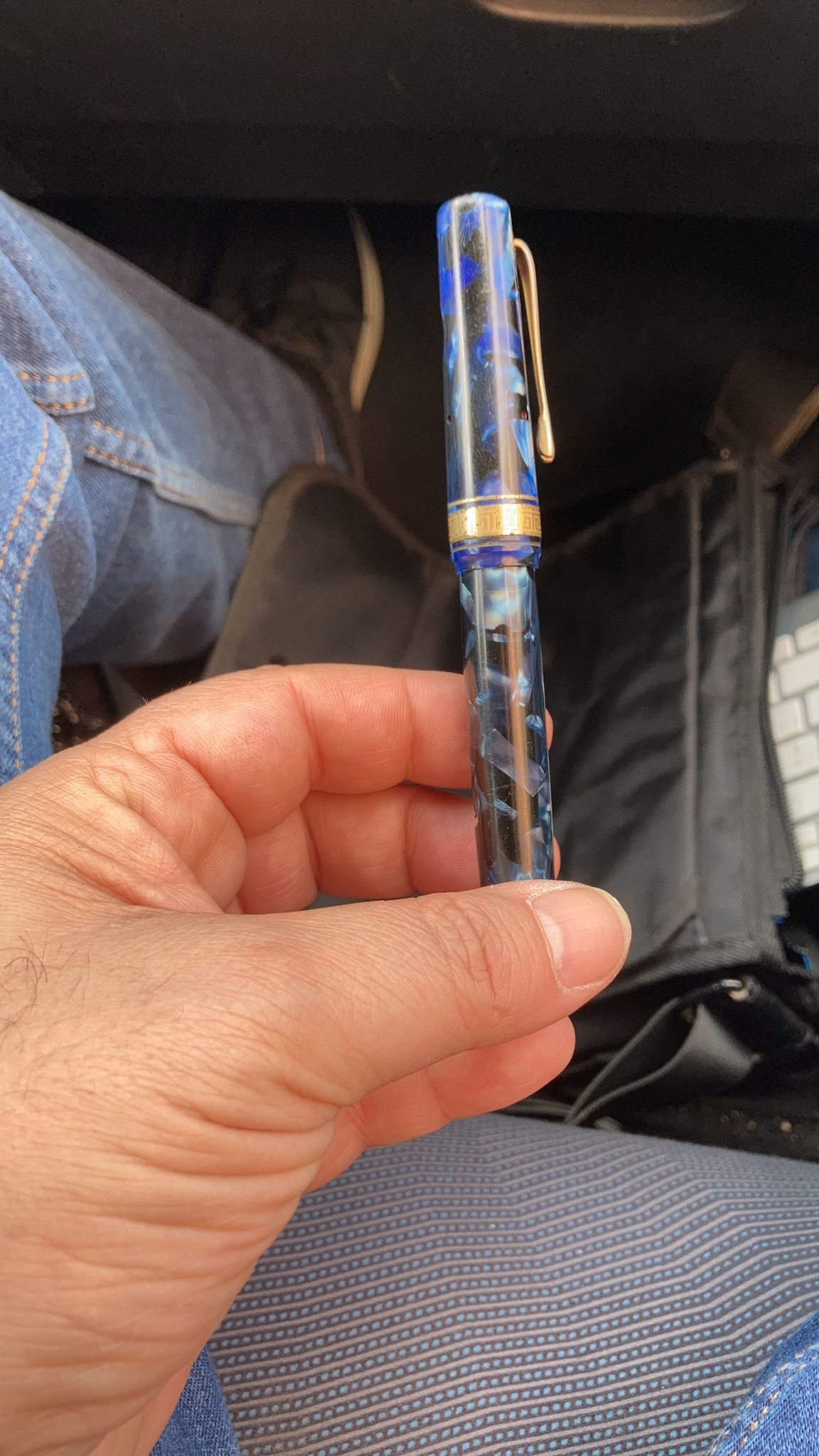 Ecco le foto della penna appena acquistata: Si possono immediatamente notare la bellezza della penna, la clip non originale, il gigantesco foro causato probabilmente da una sigaretta (o un sigaro, viste le dimensioni), e lo strano perno avvitato in cima per fissare la clip sostitutiva (quella originale probabilmente si era spezzata).