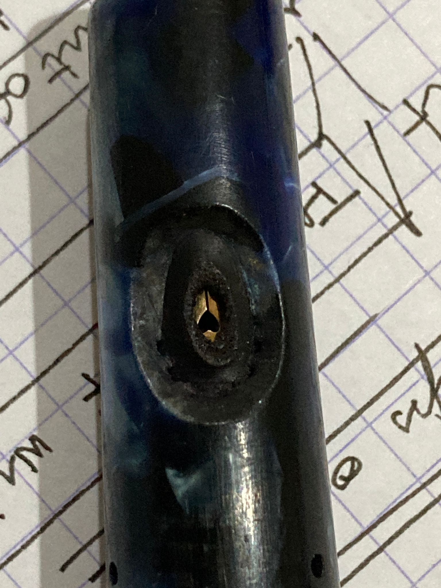 Ecco qui un ingrandimento del foro da sigaretta sul lato del cappuccio (simpatico l'effetto che fa con il pennino, quasi ad imitare una demonstrator