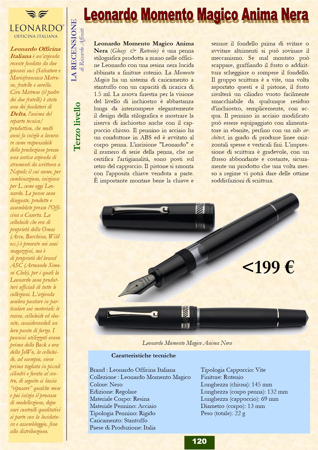 Tutto ha avuto inizio dall’Art Dèco edizione 2019, quando l’azienda italiana Leonardo Officine Italiane decide di rinventare questo successo stilografico, cambiando la veretta con un motivo geometrico invece del precedente motivo a greca. Il nuovo motivo geometrico si ispira alle atmosfere degli anni ‘30, una rappresentazione di questa epoca d’oro eseguita con la raffinata arte del guilloché, una tecnica artigiana assai raffinata. L'art déco (nome derivato per estrema sintesi dalla dicitura Exposition internationale des arts décoratifs et industriels modernes, tenutasi a Parigi nel 1925) è stato un fenomeno del gusto che interessò sostanzialmente il periodo fra il 1919 e il 1930 in Europa, mentre in America, in particolare negli USA, si prolungò fino al 1940. Le forma e le dimensioni di questa nuova versione sono identiche alla Momento Zero Grande, ma la Art Dèco si fa bella ruggendo di gioia nel tentativo di farsi ammirare anche dalle sue sorelle vintage. Il meccanismo a pistone prodotto dalla Leonardo, offre un enorme capacità di carico (1,5 ml.) e la possibilità di smontaggio per la manutenzione ed il lavaggio interno, questo grazie al Tool (questa volta incluso nella confezione). L’edizione è limitata con 100 stilografiche per colore, numerate lateralmente al corpo penna da 001 a 100. Il pennino (#6) in oro è disponibile nelle gradazioni EF, F, M, B, Stub1.1, Elastico EF o F. Le finiture possono essere in colore oro oppure rodio. L’impressione di scrittura è devastante se il pennino trova il suo giusto abbinamento con carta e inchiostro di valore, insieme a un pennino “elastic” con la sua particolare forma.
