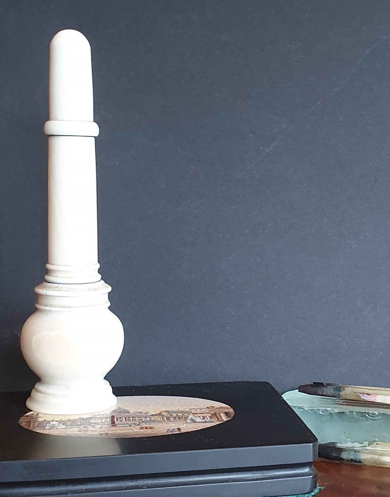 Una perla che nobilita la mia collezione: penner in avorio della prima metà del ‘700, raffinatissimo strumento scrittorio tascabile cui seguirà, qualche decina di anni dopo, il più diffuso Baradelle della corte francese con sandracchiera e penna fissa (pennino in oro), in luogo del porta penne.
