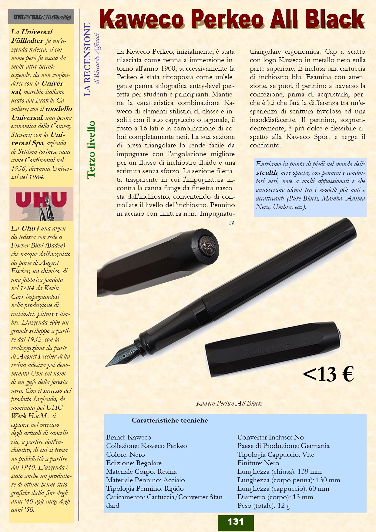 La Kaweco Perkeo, inizialmente, è stata rilasciata come penna a immersione intorno all'anno 1900, successivamente la Perkeo è stata riproposta come un'elegante penna stilografica entry-level perfetta per studenti e principianti. Mantiene la caratteristica combinazione Kaweco di elementi stilistici di classe e insoliti con il suo cappuccio ottagonale, il fusto a 16 lati e la combinazione di colori completamente neri. La sua sezione di presa triangolare lo rende facile da impugnare con l'angolazione migliore per un flusso di inchiostro fluido e una scrittura senza sforzo. La sezione filettata trasparente in cui l'impugnatura incontra la canna funge da finestra nascosta dell'inchiostro, consentendo di controllare il livello dell'inchiostro. Pennino in acciaio con finitura nera. Impugnatura triangolare ergonomica. Cap a scatto con logo Kaweco in metallo nero sulla parte superiore. È inclusa una cartuccia di inchiostro blu. Esamina con attenzione, se puoi, il pennino attraverso la confezione, prima di acquistarla, perché è lui che farà la differenza tra un’esperienza di scrittura favolosa ed una insoddisfacente. Il pennino, sorprendentemente, è più dolce e flessibile rispetto alla Kaweco Sport e regge il confronto.