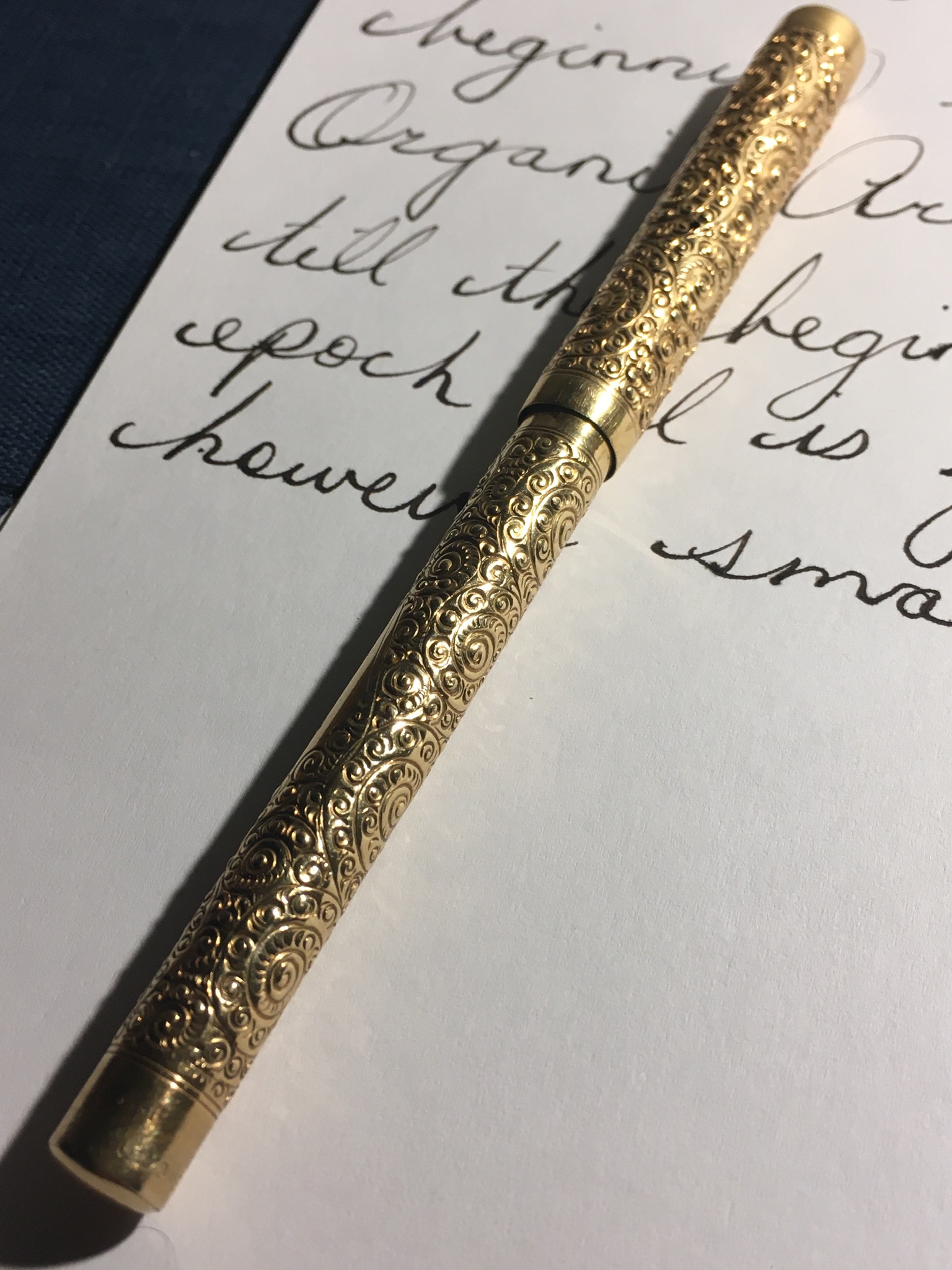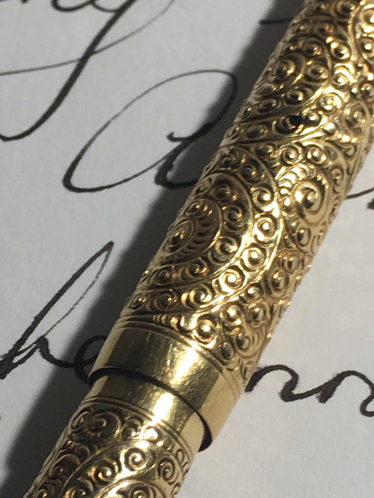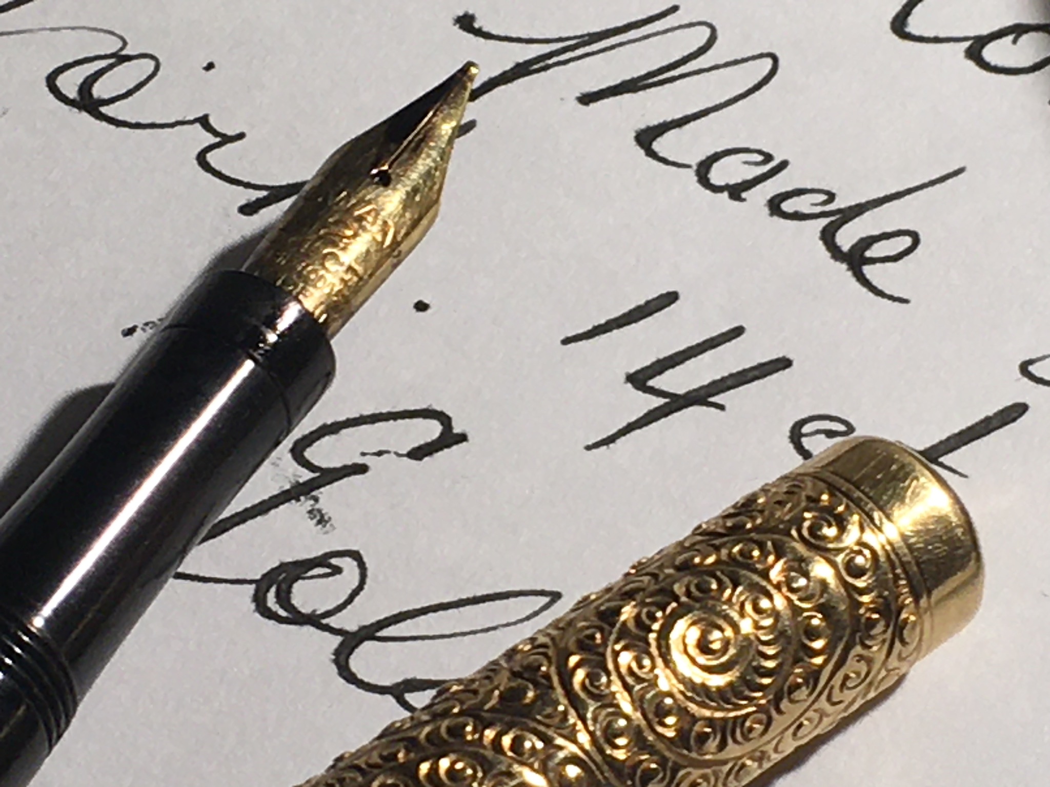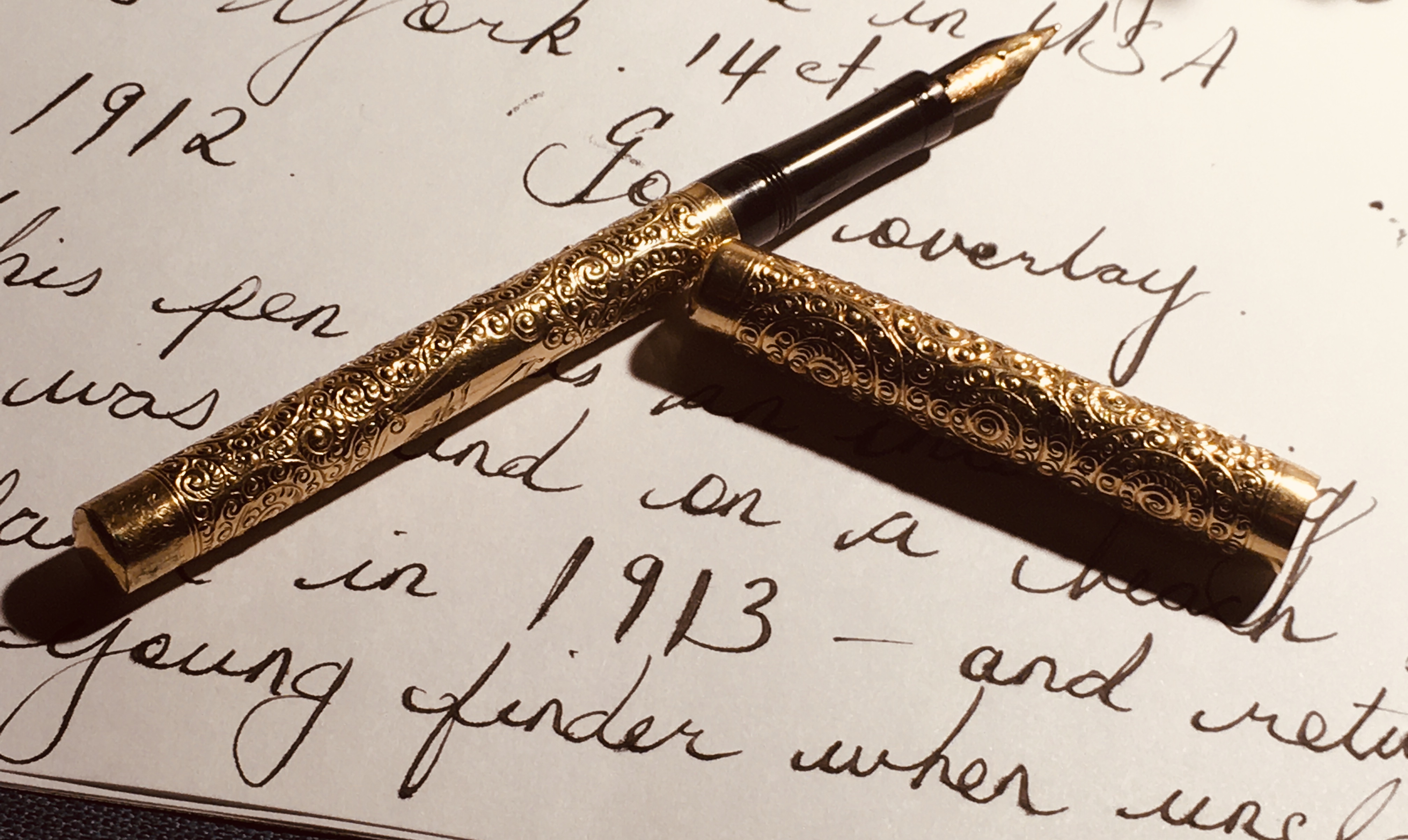 Ecco un'altra penna preferita. Una Mabie Todd & Co. Fatta a New York. La data 1912 è incisa nel cartiglio e il pennino (sostituito) è uno Swan Number 2. C'è una storia interessante associata a questa penna. Una volta apparteneva alla famiglia di un amico, suo nonno ha trovato questa penna su una spiaggia in Scozia. Dopo averla consegnata alla polizia hanno cercato il proprietario, ma è rimasta non reclamata, ed è stata restituita al nonno che poi l'ha data a suo figlio. In seguito ho avuto la fortuna di poterla acquistare dalla famiglia.