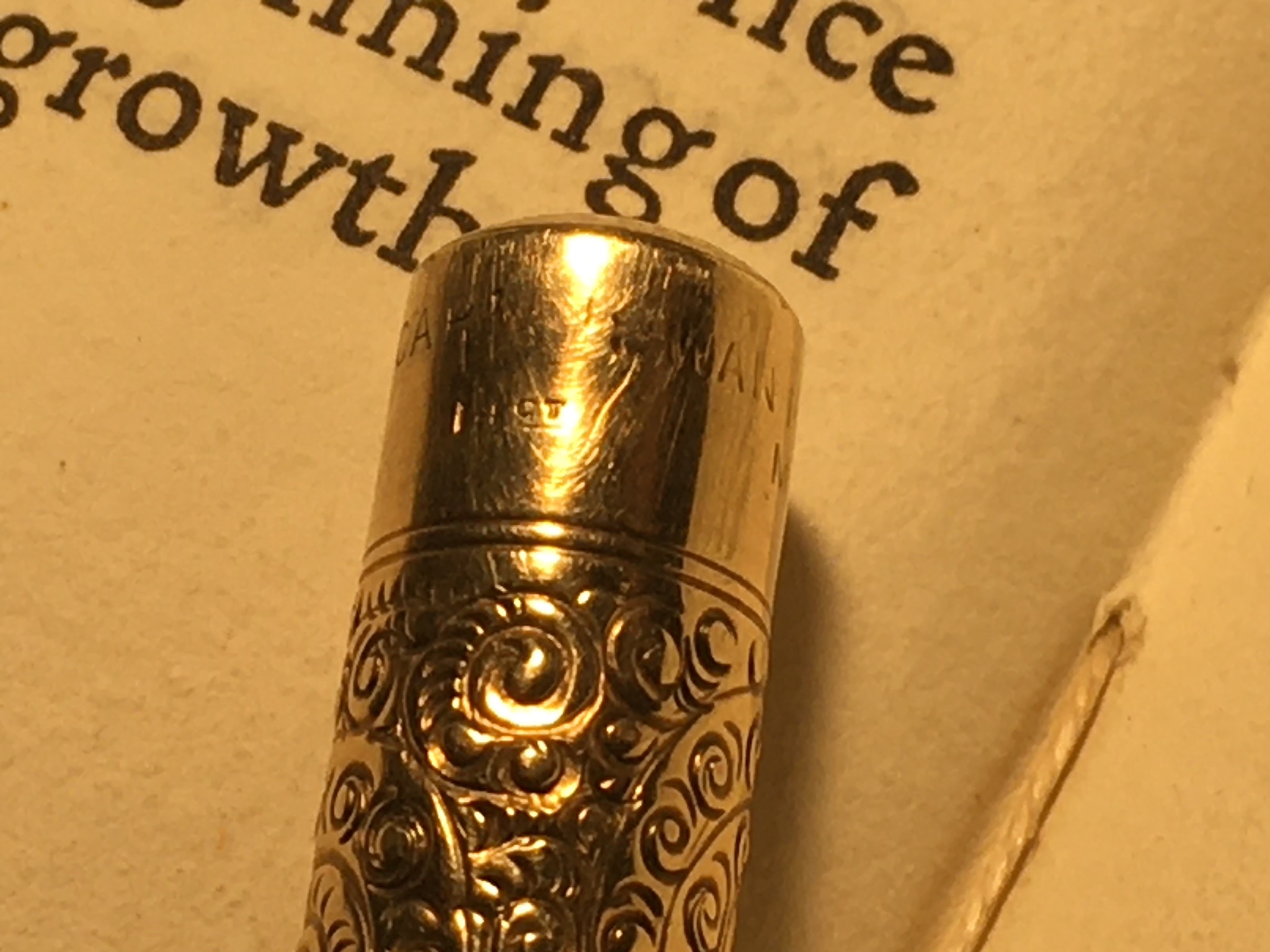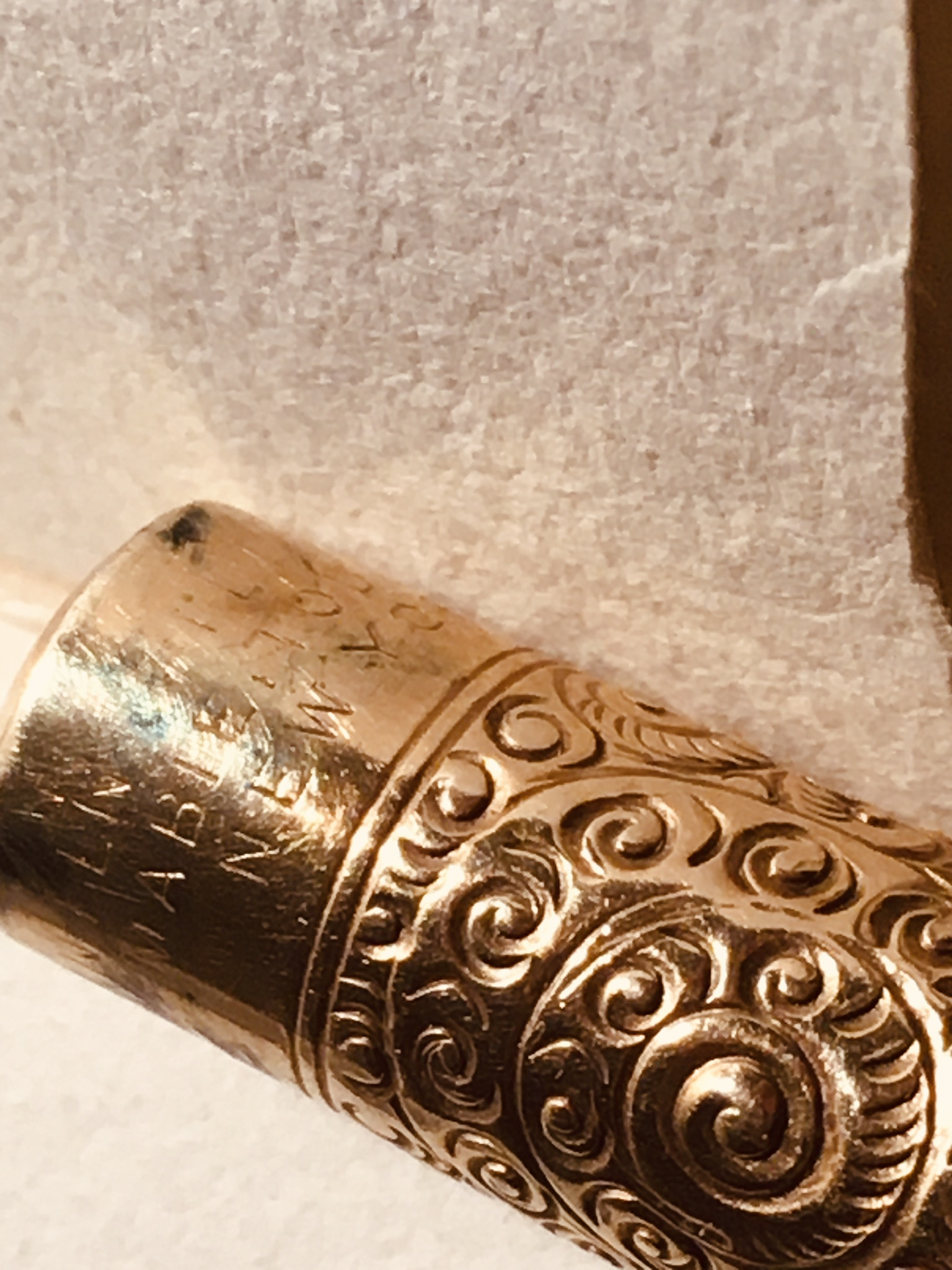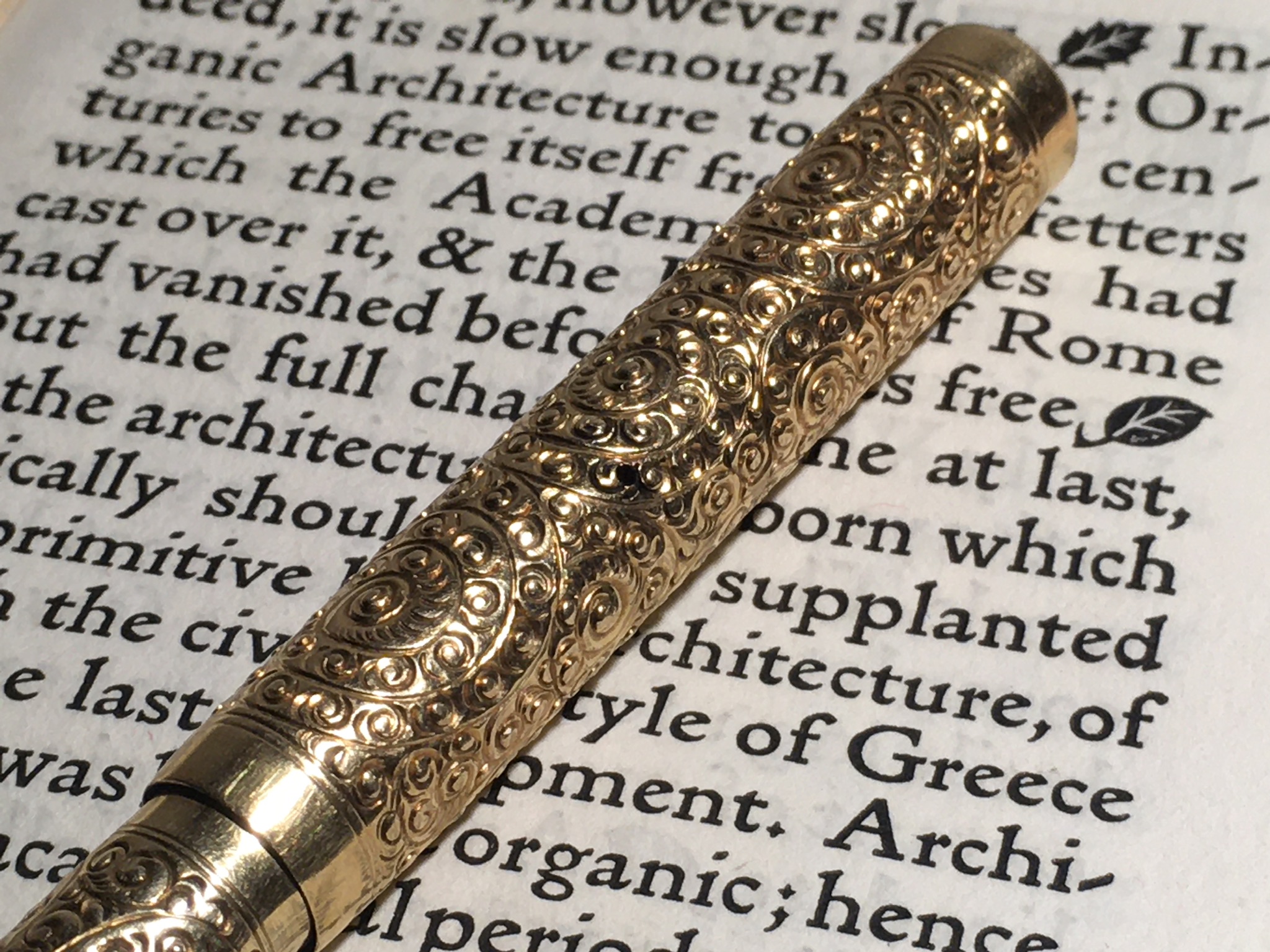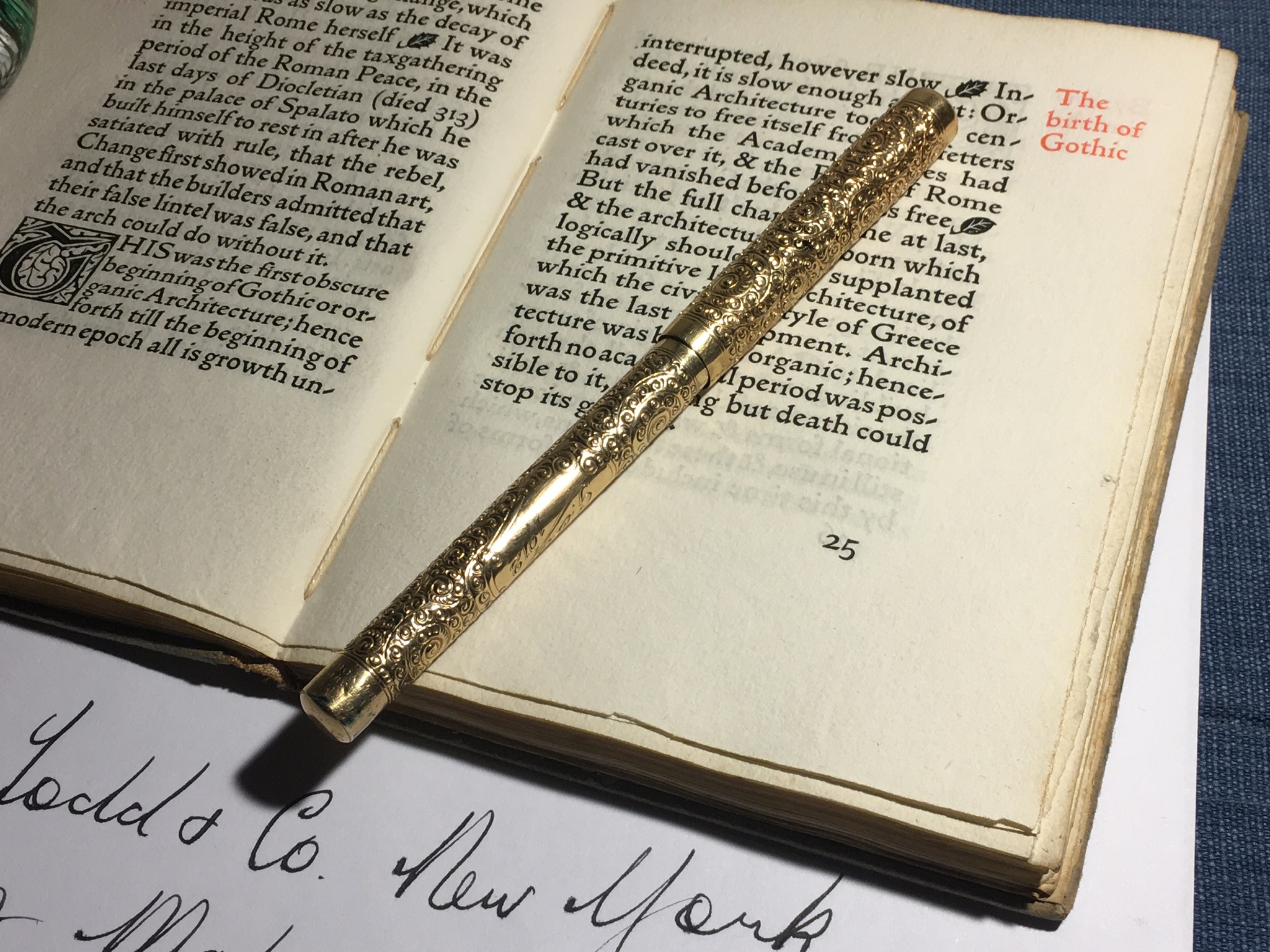 Ecco un'altra penna preferita. Una Mabie Todd & Co. Fatta a New York. La data 1912 è incisa nel cartiglio e il pennino (sostituito) è uno Swan Number 2. C'è una storia interessante associata a questa penna. Una volta apparteneva alla famiglia di un amico, suo nonno ha trovato questa penna su una spiaggia in Scozia. Dopo averla consegnata alla polizia hanno cercato il proprietario, ma è rimasta non reclamata, ed è stata restituita al nonno che poi l'ha data a suo figlio. In seguito ho avuto la fortuna di poterla acquistare dalla famiglia.