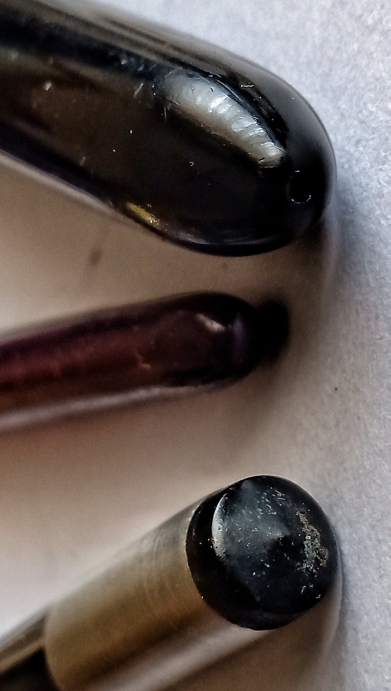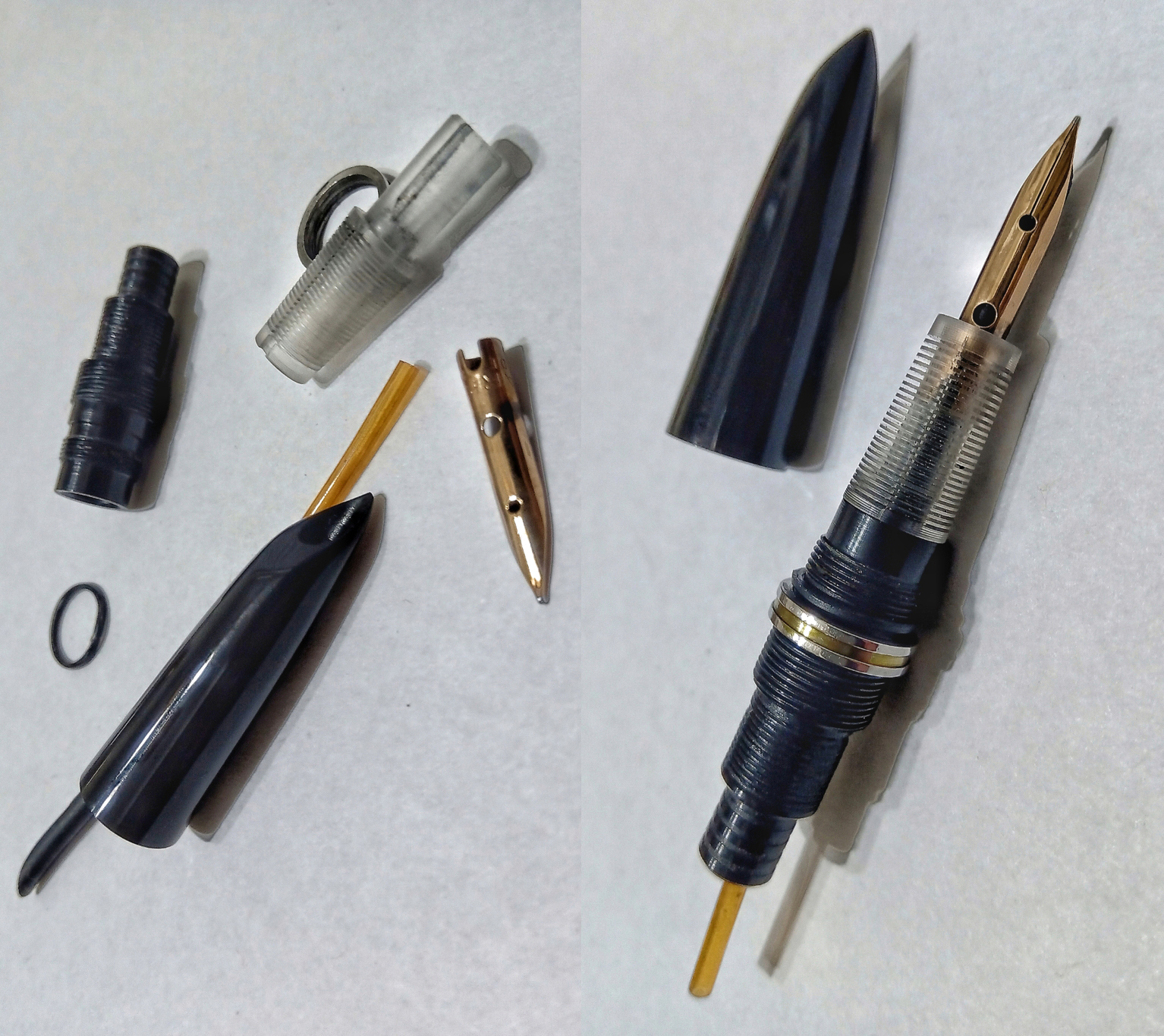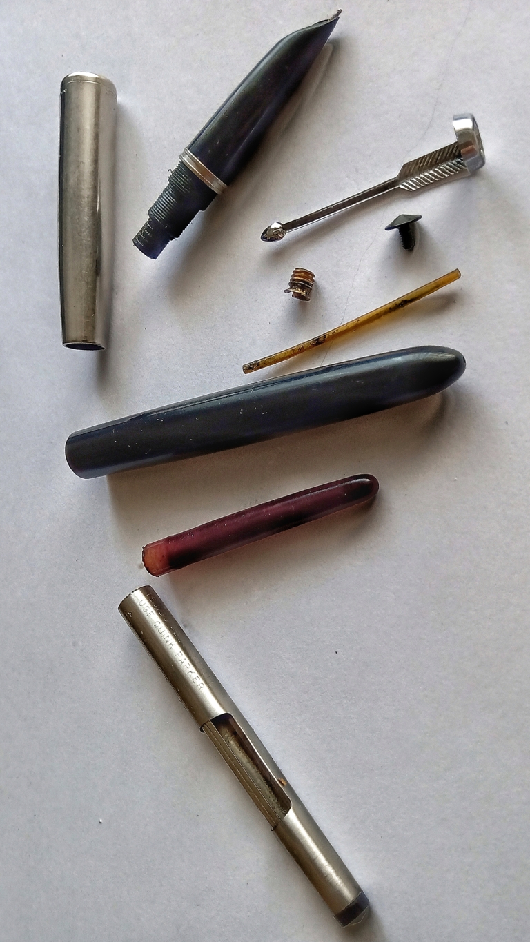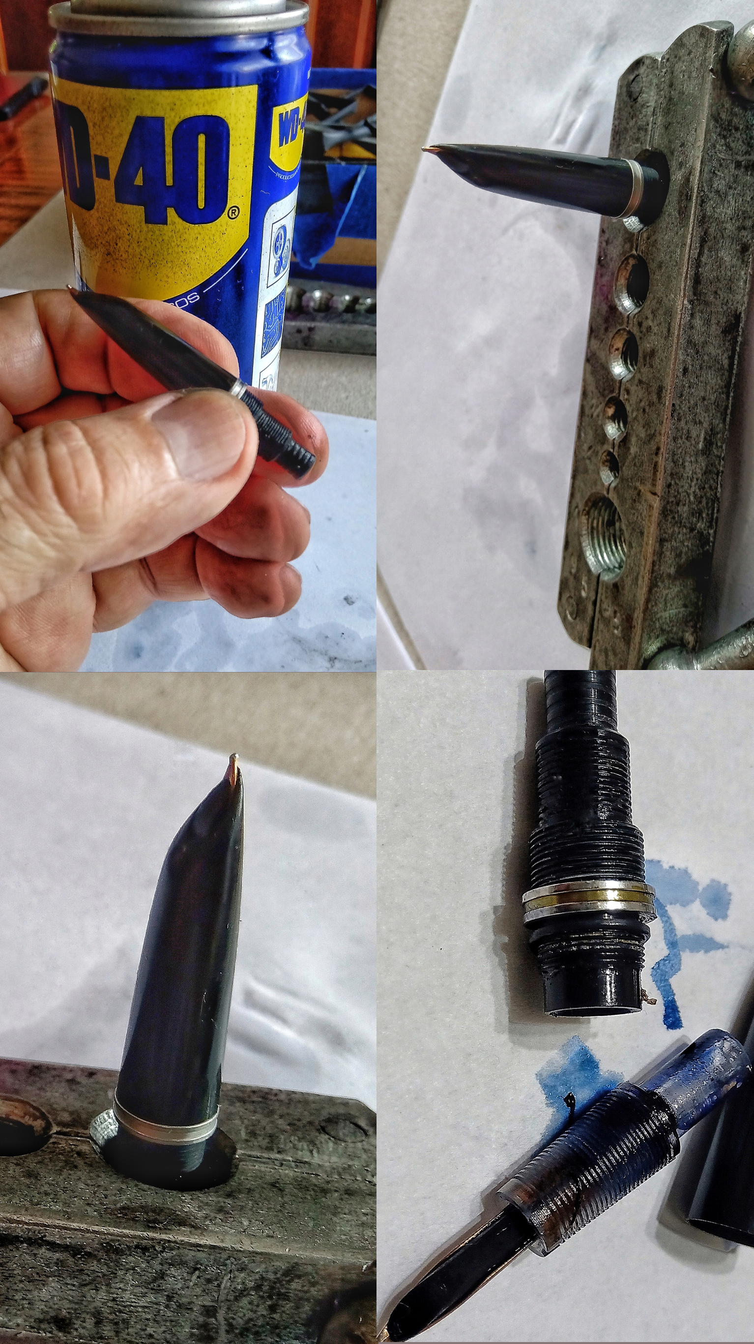 I had to use a tool to secure the grip and be able to disassemble it, in addition to adding descaling liquid. At some point I thought it was going to be destroyed, but the Parker 51 is robust, and after a lot of patience and effort, I managed to disassemble all the grip, feeder, nib, etc..., logically discovering a lot of petrified ink that surely had its 30 years inside the grip..., in Spanish, a "bodoque" of ink...!!!