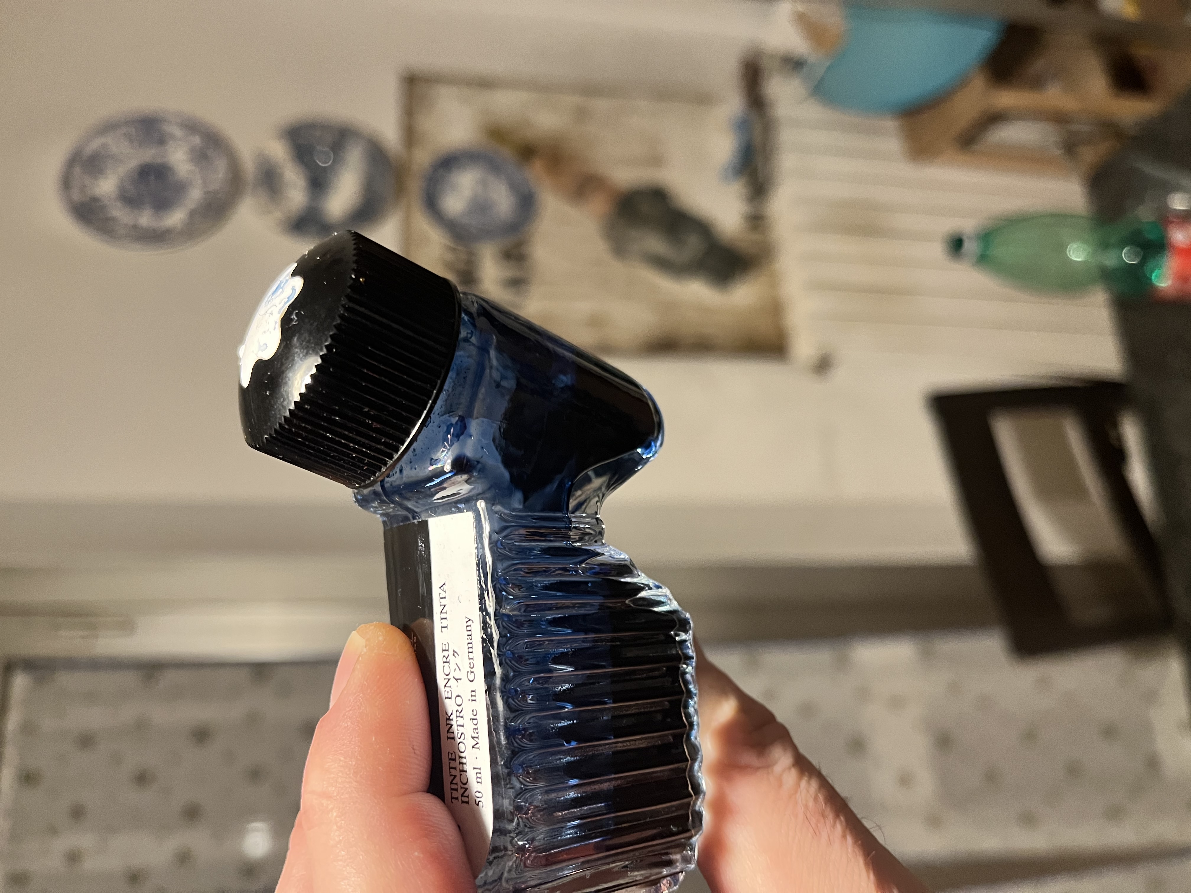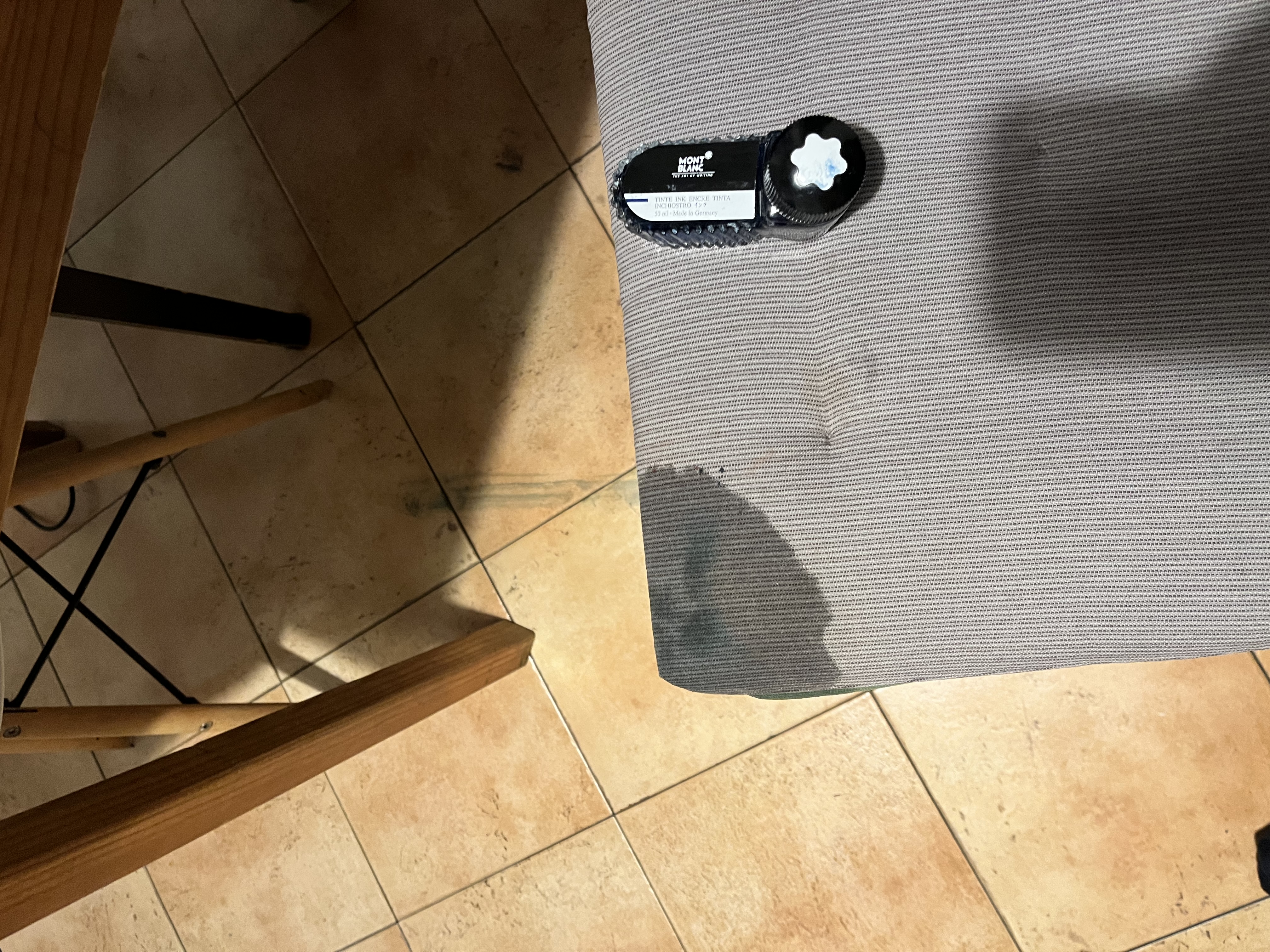 Ecco, è successo…in qualche modo me lo sentivo e quindi cercavo di starci attento… niente da fare: calamaio di Montblanc nero-blu sui pantaloni e sul pavimento con schizzi su sedie e mobili della cucina.