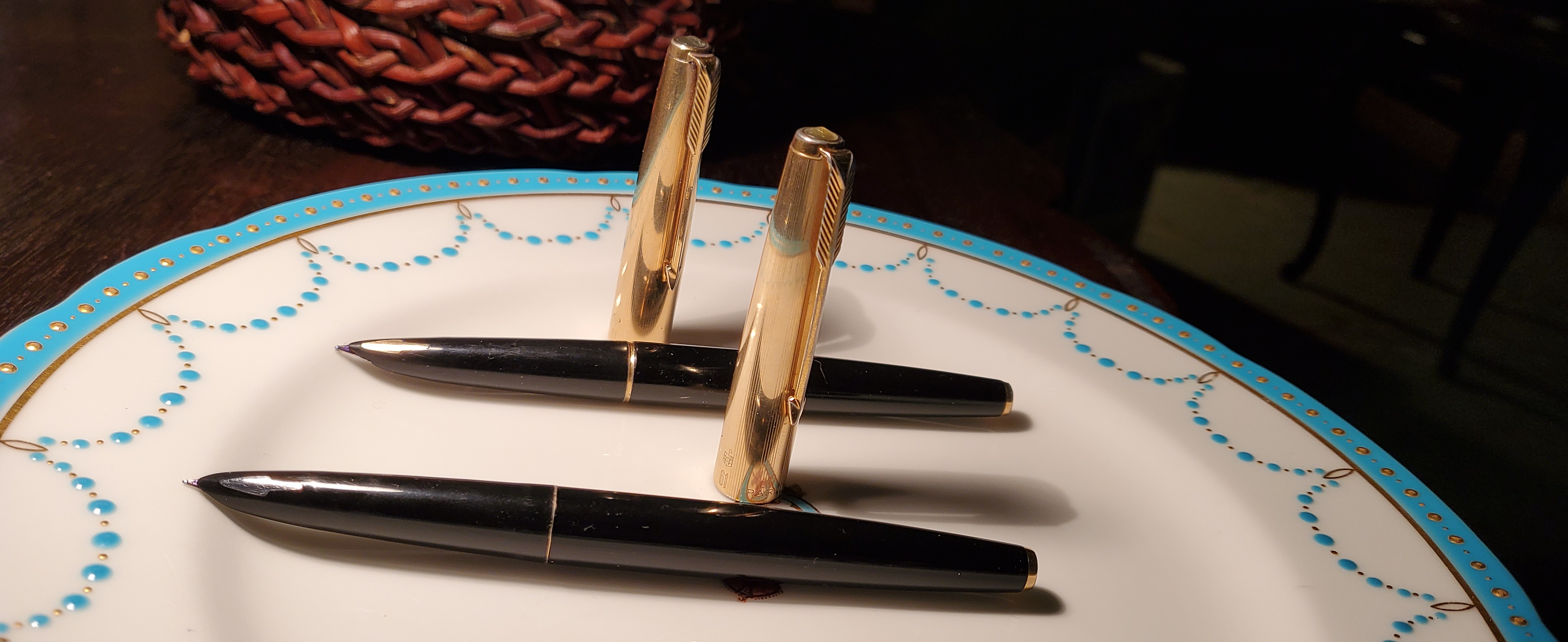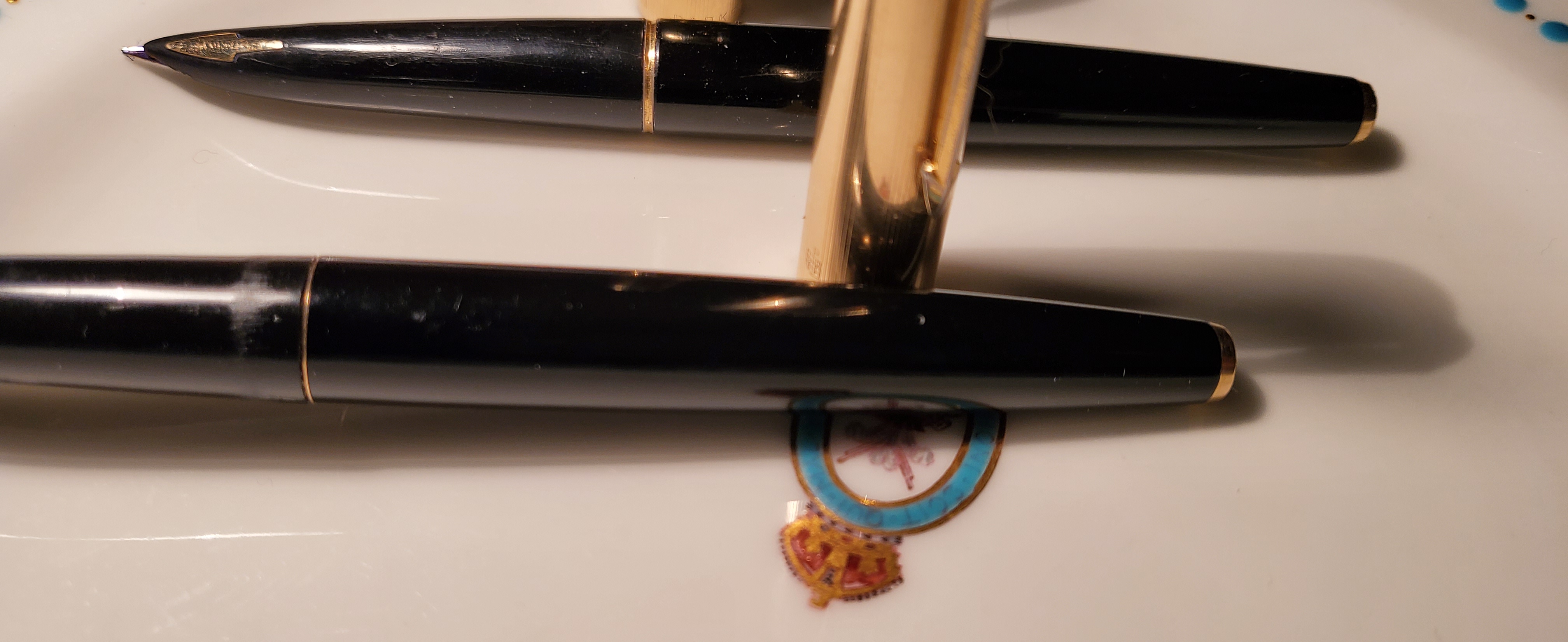Interessante la tua notazione, Giuseppe! Metto a confronto due 61, quella 'dietro' ha la freccetta dorata (avuta grazie a un forumista, poichè mancava), quella in primo piano ha la freccetta color acciaio, l'anello più fine e un forellino di sfiato sul fusto (v. fig. 3). Ma ha anche il cappuccio laminato. Che ne pensi?Pettirosso ha scritto: ↑mercoledì 22 dicembre 2021, 9:50Quanto al colore, quella di Luca penso sia originale, e non ha perso la doratura: era proprio una serie colore acciaio, era montata sicuramente sulle penne con fusto turchese e (quasi sicuramente) anche su quelle nere con cappuccio non laminato.lucaparte ha scritto: ↑mercoledì 22 dicembre 2021, 8:49 Contraddizione apparente: c'è una sede (chiamala intarsio o avvallatura) su cui è incollata la freccetta (che non è essa stessa un intarsio).
