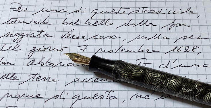 Pulito tutta la penna, inchiostrata con il nero di Lipsia di R&K - giusto per rimanere in Germania - ho steso sul foglio qualche riga e sono rimasto a bocca aperta: pennino morbidissimo, di una scorrevolezza davvero superlativa ma senza mai scadere nella burrosità, con un fruscio sulla carta che sembra quasi che qualcuno ti soffi delicatamente e quasi impercettibilmente nell'orecchio. Non esagero nel dire in una parola: una esperienza.